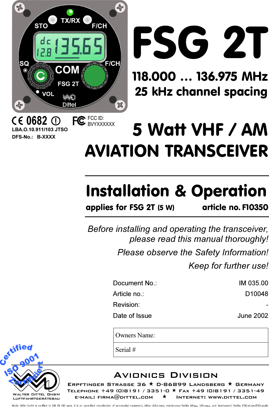 ![«0+]N+]FKDQQHOVSDFLQJ/%$2-762')61R %;;;;)&&,'%9<;;;;;; :DWW9+)$0$9,$7,2175$16&(,9(5,QVWDOODWLRQ2SHUDWLRQDSSOLHVIRU)6*7: DUWLFOHQR )%HIRUHLQVWDOOLQJDQGRSHUDWLQJWKHWUDQVFHLYHUSOHDVHUHDGWKLVPDQXDOWKRURXJKO\3OHDVHREVHUYHWKH6DIHW\,QIRUPDWLRQ.HHSIRUIXUWKHUXVH'RFXPHQW1R ,0$UWLFOHQR '5HYLVLRQ 'DWHRI,VVXH -XQH2ZQHUV1DPH6HULDO$YLRQLFV'LYLVLRQ(USIWLQJHU6WUDH'/DQGVEHUJ*HUPDQ\7HOHSKRQH)D[HPDLOILUPD#GLWWHOFRP,QWHUQHWZZZGLWWHOFRP](https://usermanual.wiki/f-u-n-k-e-AVIONICS/FSG2T.2T-Installation-Manual-Part-1/User-Guide-268348-Page-1.png)