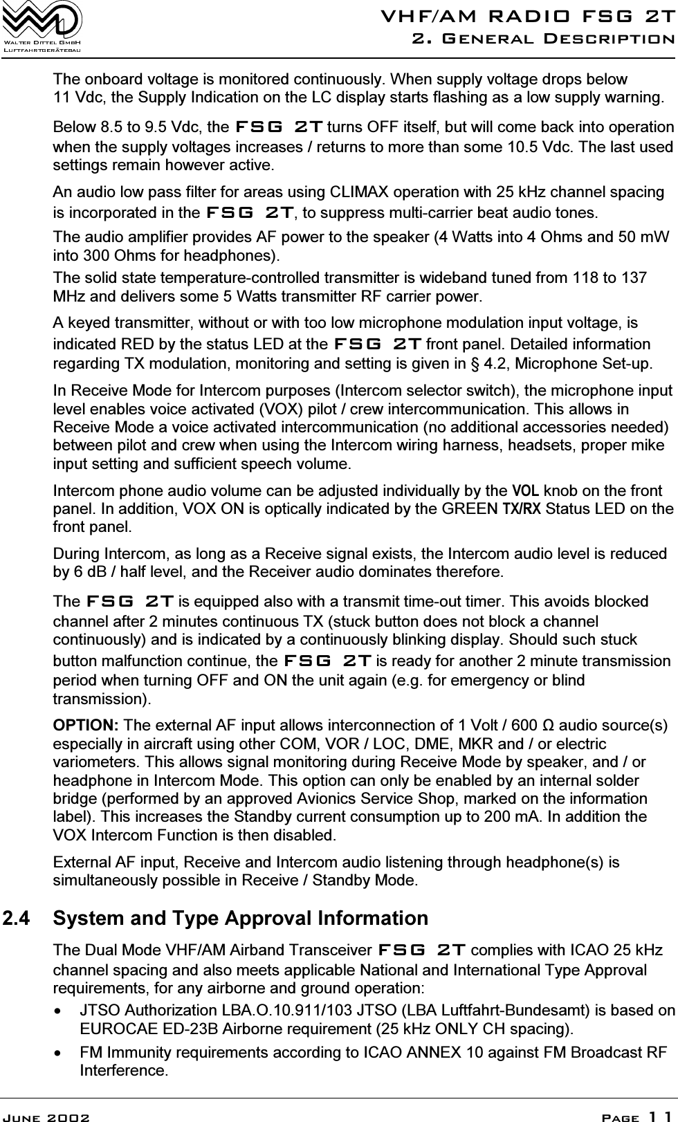 ![9+)$05$',2)6*7*HQHUDO'HVFULSWLRQ-XQH 3DJH7KHRQERDUGYROWDJHLVPRQLWRUHGFRQWLQXRXVO\:KHQVXSSO\YROWDJHGURSVEHORZ9GFWKH6XSSO\,QGLFDWLRQRQWKH/&GLVSOD\VWDUWVIODVKLQJDVDORZVXSSO\ZDUQLQJ%HORZWR9GFWKH)6*7WXUQV2))LWVHOIEXWZLOOFRPHEDFNLQWRRSHUDWLRQZKHQWKHVXSSO\YROWDJHVLQFUHDVHVUHWXUQVWRPRUHWKDQVRPH9GF7KHODVWXVHGVHWWLQJVUHPDLQKRZHYHUDFWLYH$QDXGLRORZSDVVILOWHUIRUDUHDVXVLQJ&/,0$;RSHUDWLRQZLWKN+]FKDQQHOVSDFLQJLVLQFRUSRUDWHGLQWKH)6*7WRVXSSUHVVPXOWLFDUULHUEHDWDXGLRWRQHV7KHDXGLRDPSOLILHUSURYLGHV$)SRZHUWRWKHVSHDNHU:DWWVLQWR2KPVDQGP:LQWR2KPVIRUKHDGSKRQHV7KHVROLGVWDWHWHPSHUDWXUHFRQWUROOHGWUDQVPLWWHULVZLGHEDQGWXQHGIURPWR0+]DQGGHOLYHUVVRPH:DWWVWUDQVPLWWHU5)FDUULHUSRZHU$NH\HGWUDQVPLWWHUZLWKRXWRUZLWKWRRORZPLFURSKRQHPRGXODWLRQLQSXWYROWDJHLVLQGLFDWHG5('E\WKHVWDWXV/('DWWKH)6*7IURQWSDQHO'HWDLOHGLQIRUPDWLRQUHJDUGLQJ7;PRGXODWLRQPRQLWRULQJDQGVHWWLQJLVJLYHQLQ0LFURSKRQH6HWXS,Q5HFHLYH0RGHIRU,QWHUFRPSXUSRVHV,QWHUFRPVHOHFWRUVZLWFKWKHPLFURSKRQHLQSXWOHYHOHQDEOHVYRLFHDFWLYDWHG92;SLORWFUHZLQWHUFRPPXQLFDWLRQ7KLVDOORZVLQ5HFHLYH0RGHDYRLFHDFWLYDWHGLQWHUFRPPXQLFDWLRQQRDGGLWLRQDODFFHVVRULHVQHHGHGEHWZHHQSLORWDQGFUHZZKHQXVLQJWKH,QWHUFRPZLULQJKDUQHVVKHDGVHWVSURSHUPLNHLQSXWVHWWLQJDQGVXIILFLHQWVSHHFKYROXPH,QWHUFRPSKRQHDXGLRYROXPHFDQEHDGMXVWHGLQGLYLGXDOO\E\WKH92/NQRERQWKHIURQWSDQHO,QDGGLWLRQ92;21LVRSWLFDOO\LQGLFDWHGE\WKH*5((17;5;6WDWXV/('RQWKHIURQWSDQHO'XULQJ,QWHUFRPDVORQJDVD5HFHLYHVLJQDOH[LVWVWKH,QWHUFRPDXGLROHYHOLVUHGXFHGE\G%KDOIOHYHODQGWKH5HFHLYHUDXGLRGRPLQDWHVWKHUHIRUH7KH)6*7LVHTXLSSHGDOVRZLWKDWUDQVPLWWLPHRXWWLPHU7KLVDYRLGVEORFNHGFKDQQHODIWHUPLQXWHVFRQWLQXRXV7;VWXFNEXWWRQGRHVQRWEORFNDFKDQQHOFRQWLQXRXVO\DQGLVLQGLFDWHGE\DFRQWLQXRXVO\EOLQNLQJGLVSOD\6KRXOGVXFKVWXFNEXWWRQPDOIXQFWLRQFRQWLQXHWKH)6*7LVUHDG\IRUDQRWKHUPLQXWHWUDQVPLVVLRQSHULRGZKHQWXUQLQJ2))DQG21WKHXQLWDJDLQHJIRUHPHUJHQF\RUEOLQGWUDQVPLVVLRQ237,217KHH[WHUQDO$)LQSXWDOORZVLQWHUFRQQHFWLRQRI9ROWDXGLRVRXUFHVHVSHFLDOO\LQDLUFUDIWXVLQJRWKHU&20925/2&'0(0.5DQGRUHOHFWULFYDULRPHWHUV7KLVDOORZVVLJQDOPRQLWRULQJGXULQJ5HFHLYH0RGHE\VSHDNHUDQGRUKHDGSKRQHLQ,QWHUFRP0RGH7KLVRSWLRQFDQRQO\EHHQDEOHGE\DQLQWHUQDOVROGHUEULGJHSHUIRUPHGE\DQDSSURYHG$YLRQLFV6HUYLFH6KRSPDUNHGRQWKHLQIRUPDWLRQODEHO7KLVLQFUHDVHVWKH6WDQGE\FXUUHQWFRQVXPSWLRQXSWRP$,QDGGLWLRQWKH92;,QWHUFRP)XQFWLRQLVWKHQGLVDEOHG([WHUQDO$)LQSXW5HFHLYHDQG,QWHUFRPDXGLROLVWHQLQJWKURXJKKHDGSKRQHVLVVLPXOWDQHRXVO\SRVVLEOHLQ5HFHLYH6WDQGE\0RGH 6\VWHPDQG7\SH$SSURYDO,QIRUPDWLRQ7KH'XDO0RGH9+)$0$LUEDQG7UDQVFHLYHU)6*7FRPSOLHVZLWK,&$2N+]FKDQQHOVSDFLQJDQGDOVRPHHWVDSSOLFDEOH1DWLRQDODQG,QWHUQDWLRQDO7\SH$SSURYDOUHTXLUHPHQWVIRUDQ\DLUERUQHDQGJURXQGRSHUDWLRQ -762$XWKRUL]DWLRQ/%$2-762/%$/XIWIDKUW%XQGHVDPWLVEDVHGRQ(852&$(('%$LUERUQHUHTXLUHPHQWN+]21/<&+VSDFLQJ )0,PPXQLW\UHTXLUHPHQWVDFFRUGLQJWR,&$2$11(;DJDLQVW)0%URDGFDVW5),QWHUIHUHQFH](https://usermanual.wiki/f-u-n-k-e-AVIONICS/FSG2T.2T-Installation-Manual-Part-1/User-Guide-268348-Page-11.png)