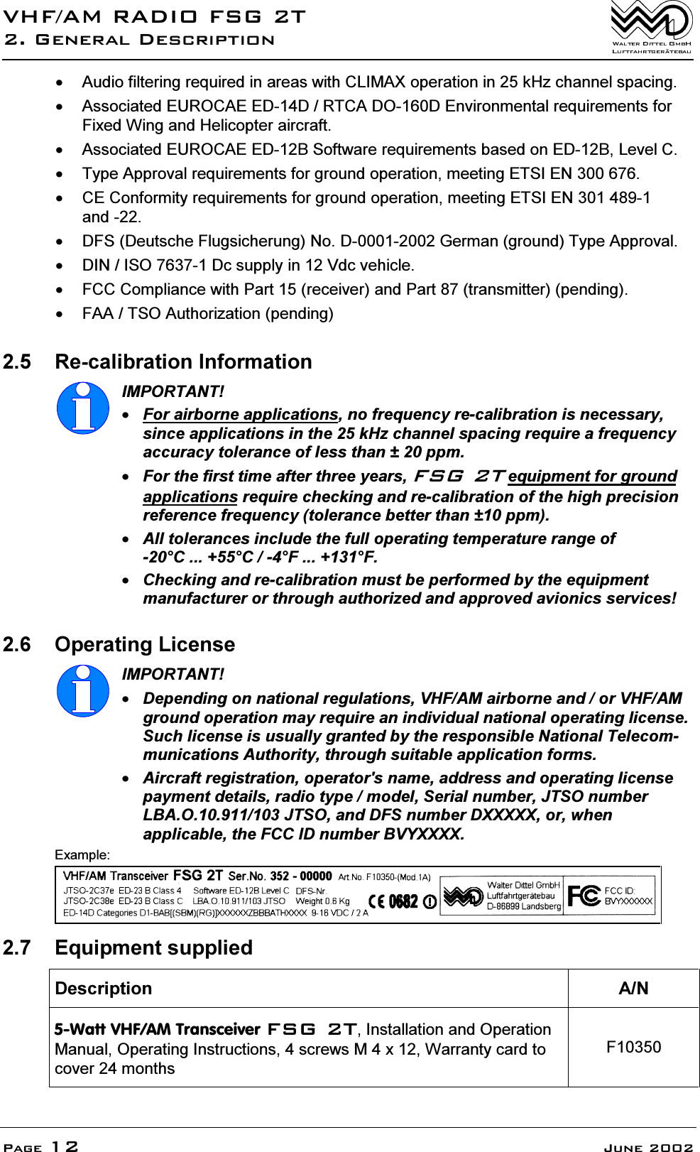 ![9+)$05$',2)6*7*HQHUDO'HVFULSWLRQ3DJH -XQH $XGLRILOWHULQJUHTXLUHGLQDUHDVZLWK&/,0$;RSHUDWLRQLQN+]FKDQQHOVSDFLQJ $VVRFLDWHG(852&$((''57&$'2'(QYLURQPHQWDOUHTXLUHPHQWVIRU)L[HG:LQJDQG+HOLFRSWHUDLUFUDIW $VVRFLDWHG(852&$(('%6RIWZDUHUHTXLUHPHQWVEDVHGRQ('%/HYHO& 7\SH$SSURYDOUHTXLUHPHQWVIRUJURXQGRSHUDWLRQPHHWLQJ(76,(1 &(&RQIRUPLW\UHTXLUHPHQWVIRUJURXQGRSHUDWLRQPHHWLQJ(76,(1DQG ')6'HXWVFKH)OXJVLFKHUXQJ1R'*HUPDQJURXQG7\SH$SSURYDO ',1,62'FVXSSO\LQ9GFYHKLFOH )&&&RPSOLDQFHZLWK3DUWUHFHLYHUDQG3DUWWUDQVPLWWHUSHQGLQJ )$$762$XWKRUL]DWLRQSHQGLQJ 5HFDOLEUDWLRQ,QIRUPDWLRQ,03257$17)RUDLUERUQHDSSOLFDWLRQVQRIUHTXHQF\UHFDOLEUDWLRQLVQHFHVVDU\VLQFHDSSOLFDWLRQVLQWKHN+]FKDQQHOVSDFLQJUHTXLUHDIUHTXHQF\DFFXUDF\WROHUDQFHRIOHVVWKDQSSP)RUWKHILUVWWLPHDIWHUWKUHH\HDUV)6*7HTXLSPHQWIRUJURXQGDSSOLFDWLRQVUHTXLUHFKHFNLQJDQGUHFDOLEUDWLRQRIWKHKLJKSUHFLVLRQUHIHUHQFHIUHTXHQF\WROHUDQFHEHWWHUWKDQSSP$OOWROHUDQFHVLQFOXGHWKHIXOORSHUDWLQJWHPSHUDWXUHUDQJHRI&&))&KHFNLQJDQGUHFDOLEUDWLRQPXVWEHSHUIRUPHGE\WKHHTXLSPHQWPDQXIDFWXUHURUWKURXJKDXWKRUL]HGDQGDSSURYHGDYLRQLFVVHUYLFHV 2SHUDWLQJ/LFHQVH,03257$17'HSHQGLQJRQQDWLRQDOUHJXODWLRQV9+)$0DLUERUQHDQGRU9+)$0JURXQGRSHUDWLRQPD\UHTXLUHDQLQGLYLGXDOQDWLRQDORSHUDWLQJOLFHQVH6XFKOLFHQVHLVXVXDOO\JUDQWHGE\WKHUHVSRQVLEOH1DWLRQDO7HOHFRPPXQLFDWLRQV$XWKRULW\WKURXJKVXLWDEOHDSSOLFDWLRQIRUPV$LUFUDIWUHJLVWUDWLRQRSHUDWRUVQDPHDGGUHVVDQGRSHUDWLQJOLFHQVHSD\PHQWGHWDLOVUDGLRW\SHPRGHO6HULDOQXPEHU-762QXPEHU/%$2-762DQG')6QXPEHU';;;;;RUZKHQDSSOLFDEOHWKH)&&,'QXPEHU%9<;;;;([DPSOH (TXLSPHQWVXSSOLHG'HVFULSWLRQ $1:DWW9+)$07UDQVFHLYHU)6*7,QVWDOODWLRQDQG2SHUDWLRQ0DQXDO2SHUDWLQJ,QVWUXFWLRQVVFUHZV0[:DUUDQW\FDUGWRFRYHUPRQWKV)](https://usermanual.wiki/f-u-n-k-e-AVIONICS/FSG2T.2T-Installation-Manual-Part-1/User-Guide-268348-Page-12.png)