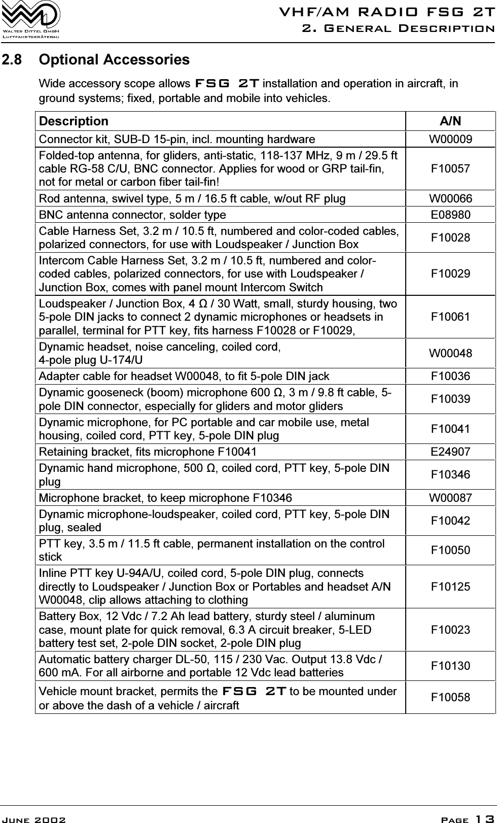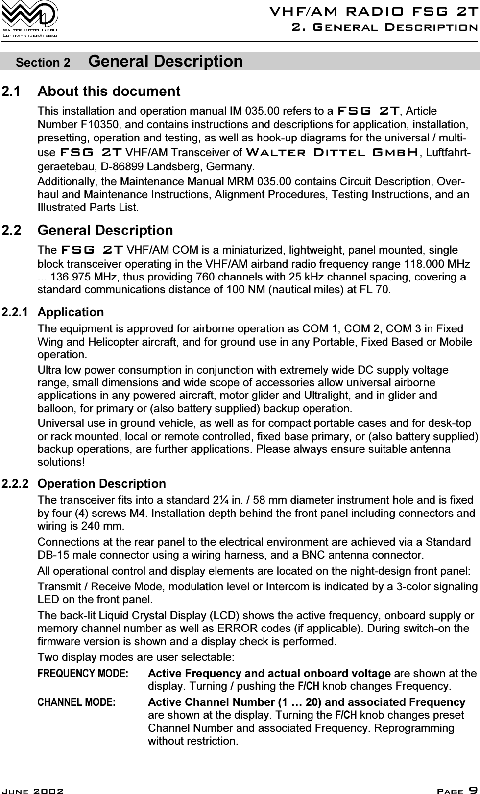 ![9+)$05$',2)6*7*HQHUDO'HVFULSWLRQ-XQH 3DJH6HFWLRQ *HQHUDO'HVFULSWLRQ $ERXWWKLVGRFXPHQW7KLVLQVWDOODWLRQDQGRSHUDWLRQPDQXDO,0UHIHUVWRD)6*7$UWLFOH1XPEHU)DQGFRQWDLQVLQVWUXFWLRQVDQGGHVFULSWLRQVIRUDSSOLFDWLRQLQVWDOODWLRQSUHVHWWLQJRSHUDWLRQDQGWHVWLQJDVZHOODVKRRNXSGLDJUDPVIRUWKHXQLYHUVDOPXOWLXVH)6*79+)$07UDQVFHLYHURI:DOWHU'LWWHO*PE+/XIWIDKUWJHUDHWHEDX'/DQGVEHUJ*HUPDQ\$GGLWLRQDOO\WKH0DLQWHQDQFH0DQXDO050FRQWDLQV&LUFXLW'HVFULSWLRQ2YHUKDXODQG0DLQWHQDQFH,QVWUXFWLRQV$OLJQPHQW3URFHGXUHV7HVWLQJ,QVWUXFWLRQVDQGDQ,OOXVWUDWHG3DUWV/LVW *HQHUDO'HVFULSWLRQ7KH)6*79+)$0&20LVDPLQLDWXUL]HGOLJKWZHLJKWSDQHOPRXQWHGVLQJOHEORFNWUDQVFHLYHURSHUDWLQJLQWKH9+)$0DLUEDQGUDGLRIUHTXHQF\UDQJH0+]0+]WKXVSURYLGLQJFKDQQHOVZLWKN+]FKDQQHOVSDFLQJFRYHULQJDVWDQGDUGFRPPXQLFDWLRQVGLVWDQFHRI10QDXWLFDOPLOHVDW)/ $SSOLFDWLRQ7KHHTXLSPHQWLVDSSURYHGIRUDLUERUQHRSHUDWLRQDV&20&20&20LQ)L[HG:LQJDQG+HOLFRSWHUDLUFUDIWDQGIRUJURXQGXVHLQDQ\3RUWDEOH)L[HG%DVHGRU0RELOHRSHUDWLRQ8OWUDORZSRZHUFRQVXPSWLRQLQFRQMXQFWLRQZLWKH[WUHPHO\ZLGH'&VXSSO\YROWDJHUDQJHVPDOOGLPHQVLRQVDQGZLGHVFRSHRIDFFHVVRULHVDOORZXQLYHUVDODLUERUQHDSSOLFDWLRQVLQDQ\SRZHUHGDLUFUDIWPRWRUJOLGHUDQG8OWUDOLJKWDQGLQJOLGHUDQGEDOORRQIRUSULPDU\RUDOVREDWWHU\VXSSOLHGEDFNXSRSHUDWLRQ8QLYHUVDOXVHLQJURXQGYHKLFOHDVZHOODVIRUFRPSDFWSRUWDEOHFDVHVDQGIRUGHVNWRSRUUDFNPRXQWHGORFDORUUHPRWHFRQWUROOHGIL[HGEDVHSULPDU\RUDOVREDWWHU\VXSSOLHGEDFNXSRSHUDWLRQVDUHIXUWKHUDSSOLFDWLRQV3OHDVHDOZD\VHQVXUHVXLWDEOHDQWHQQDVROXWLRQV 2SHUDWLRQ'HVFULSWLRQ7KHWUDQVFHLYHUILWVLQWRDVWDQGDUGóLQPPGLDPHWHULQVWUXPHQWKROHDQGLVIL[HGE\IRXUVFUHZV0,QVWDOODWLRQGHSWKEHKLQGWKHIURQWSDQHOLQFOXGLQJFRQQHFWRUVDQGZLULQJLVPP&RQQHFWLRQVDWWKHUHDUSDQHOWRWKHHOHFWULFDOHQYLURQPHQWDUHDFKLHYHGYLDD6WDQGDUG'%PDOHFRQQHFWRUXVLQJDZLULQJKDUQHVVDQGD%1&DQWHQQDFRQQHFWRU$OORSHUDWLRQDOFRQWURODQGGLVSOD\HOHPHQWVDUHORFDWHGRQWKHQLJKWGHVLJQIURQWSDQHO7UDQVPLW5HFHLYH0RGHPRGXODWLRQOHYHORU,QWHUFRPLVLQGLFDWHGE\DFRORUVLJQDOLQJ/('RQWKHIURQWSDQHO7KHEDFNOLW/LTXLG&U\VWDO'LVSOD\/&'VKRZVWKHDFWLYHIUHTXHQF\RQERDUGVXSSO\RUPHPRU\FKDQQHOQXPEHUDVZHOODV(5525FRGHVLIDSSOLFDEOH'XULQJVZLWFKRQWKHILUPZDUHYHUVLRQLVVKRZQDQGDGLVSOD\FKHFNLVSHUIRUPHG7ZRGLVSOD\PRGHVDUHXVHUVHOHFWDEOH)5(48(1&<02'( $FWLYH)UHTXHQF\DQGDFWXDORQERDUGYROWDJHDUHVKRZQDWWKHGLVSOD\7XUQLQJSXVKLQJWKH)&+NQREFKDQJHV)UHTXHQF\&+$11(/02'( $FWLYH&KDQQHO1XPEHU«DQGDVVRFLDWHG)UHTXHQF\DUHVKRZQDWWKHGLVSOD\7XUQLQJWKH)&+NQREFKDQJHVSUHVHW&KDQQHO1XPEHUDQGDVVRFLDWHG)UHTXHQF\5HSURJUDPPLQJZLWKRXWUHVWULFWLRQ](https://usermanual.wiki/f-u-n-k-e-AVIONICS/FSG2T.2T-Installation-Manual-Part-1/User-Guide-268348-Page-9.png)