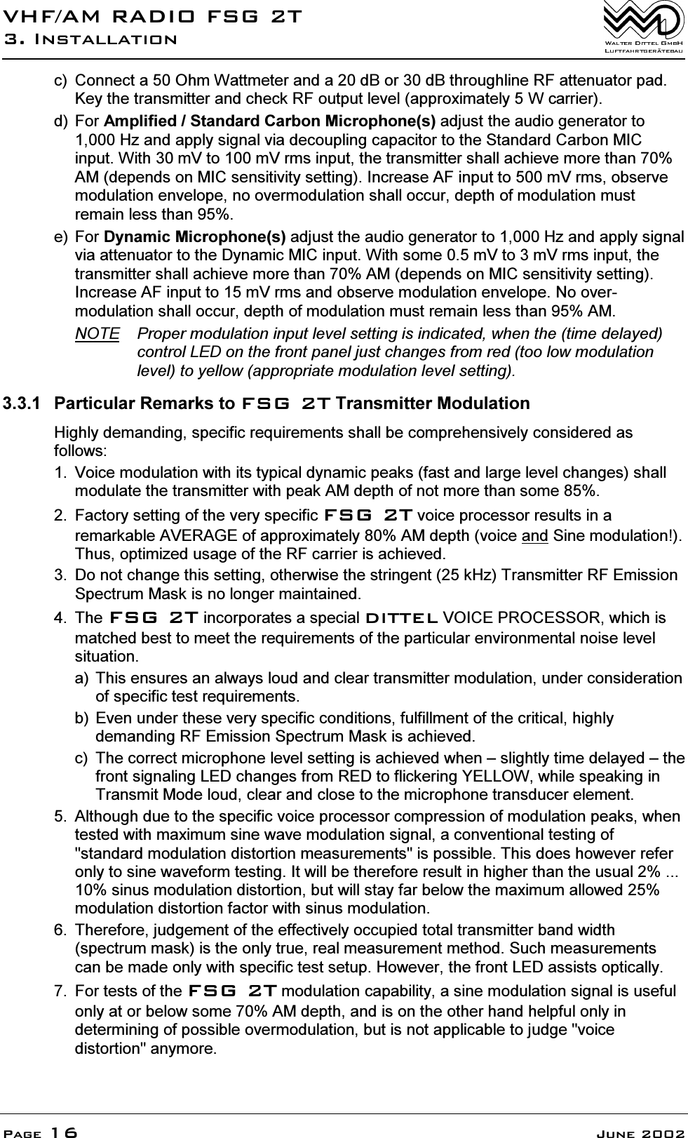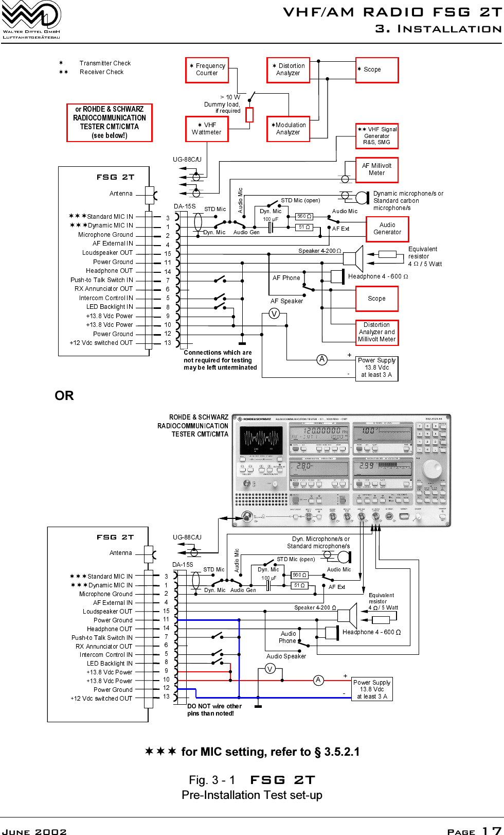 ![9+)$05$',2)6*7,QVWDOODWLRQ3DJH -XQHF &RQQHFWD2KP:DWWPHWHUDQGDG%RUG%WKURXJKOLQH5)DWWHQXDWRUSDG.H\WKHWUDQVPLWWHUDQGFKHFN5)RXWSXWOHYHODSSUR[LPDWHO\:FDUULHUG )RU$PSOLILHG6WDQGDUG&DUERQ0LFURSKRQHVDGMXVWWKHDXGLRJHQHUDWRUWR+]DQGDSSO\VLJQDOYLDGHFRXSOLQJFDSDFLWRUWRWKH6WDQGDUG&DUERQ0,&LQSXW:LWKP9WRP9UPVLQSXWWKHWUDQVPLWWHUVKDOODFKLHYHPRUHWKDQ$0GHSHQGVRQ0,&VHQVLWLYLW\VHWWLQJ,QFUHDVH$)LQSXWWRP9UPVREVHUYHPRGXODWLRQHQYHORSHQRRYHUPRGXODWLRQVKDOORFFXUGHSWKRIPRGXODWLRQPXVWUHPDLQOHVVWKDQH )RU'\QDPLF0LFURSKRQHVDGMXVWWKHDXGLRJHQHUDWRUWR+]DQGDSSO\VLJQDOYLDDWWHQXDWRUWRWKH'\QDPLF0,&LQSXW:LWKVRPHP9WRP9UPVLQSXWWKHWUDQVPLWWHUVKDOODFKLHYHPRUHWKDQ$0GHSHQGVRQ0,&VHQVLWLYLW\VHWWLQJ,QFUHDVH$)LQSXWWRP9UPVDQGREVHUYHPRGXODWLRQHQYHORSH1RRYHUPRGXODWLRQVKDOORFFXUGHSWKRIPRGXODWLRQPXVWUHPDLQOHVVWKDQ$0127( 3URSHUPRGXODWLRQLQSXWOHYHOVHWWLQJLVLQGLFDWHGZKHQWKHWLPHGHOD\HGFRQWURO/('RQWKHIURQWSDQHOMXVWFKDQJHVIURPUHGWRRORZPRGXODWLRQOHYHOWR\HOORZDSSURSULDWHPRGXODWLRQOHYHOVHWWLQJ 3DUWLFXODU5HPDUNVWR)6*77UDQVPLWWHU0RGXODWLRQ+LJKO\GHPDQGLQJVSHFLILFUHTXLUHPHQWVVKDOOEHFRPSUHKHQVLYHO\FRQVLGHUHGDVIROORZV 9RLFHPRGXODWLRQZLWKLWVW\SLFDOG\QDPLFSHDNVIDVWDQGODUJHOHYHOFKDQJHVVKDOOPRGXODWHWKHWUDQVPLWWHUZLWKSHDN$0GHSWKRIQRWPRUHWKDQVRPH )DFWRU\VHWWLQJRIWKHYHU\VSHFLILF)6*7YRLFHSURFHVVRUUHVXOWVLQDUHPDUNDEOH$9(5$*(RIDSSUR[LPDWHO\$0GHSWKYRLFHDQG6LQHPRGXODWLRQ7KXVRSWLPL]HGXVDJHRIWKH5)FDUULHULVDFKLHYHG 'RQRWFKDQJHWKLVVHWWLQJRWKHUZLVHWKHVWULQJHQWN+]7UDQVPLWWHU5)(PLVVLRQ6SHFWUXP0DVNLVQRORQJHUPDLQWDLQHG 7KH)6*7LQFRUSRUDWHVDVSHFLDO',77(/92,&(352&(6625ZKLFKLVPDWFKHGEHVWWRPHHWWKHUHTXLUHPHQWVRIWKHSDUWLFXODUHQYLURQPHQWDOQRLVHOHYHOVLWXDWLRQD 7KLVHQVXUHVDQDOZD\VORXGDQGFOHDUWUDQVPLWWHUPRGXODWLRQXQGHUFRQVLGHUDWLRQRIVSHFLILFWHVWUHTXLUHPHQWVE (YHQXQGHUWKHVHYHU\VSHFLILFFRQGLWLRQVIXOILOOPHQWRIWKHFULWLFDOKLJKO\GHPDQGLQJ5)(PLVVLRQ6SHFWUXP0DVNLVDFKLHYHGF 7KHFRUUHFWPLFURSKRQHOHYHOVHWWLQJLVDFKLHYHGZKHQ±VOLJKWO\WLPHGHOD\HG±WKHIURQWVLJQDOLQJ/('FKDQJHVIURP5('WRIOLFNHULQJ<(//2:ZKLOHVSHDNLQJLQ7UDQVPLW0RGHORXGFOHDUDQGFORVHWRWKHPLFURSKRQHWUDQVGXFHUHOHPHQW $OWKRXJKGXHWRWKHVSHFLILFYRLFHSURFHVVRUFRPSUHVVLRQRIPRGXODWLRQSHDNVZKHQWHVWHGZLWKPD[LPXPVLQHZDYHPRGXODWLRQVLJQDODFRQYHQWLRQDOWHVWLQJRIVWDQGDUGPRGXODWLRQGLVWRUWLRQPHDVXUHPHQWVLVSRVVLEOH7KLVGRHVKRZHYHUUHIHURQO\WRVLQHZDYHIRUPWHVWLQJ,WZLOOEHWKHUHIRUHUHVXOWLQKLJKHUWKDQWKHXVXDOVLQXVPRGXODWLRQGLVWRUWLRQEXWZLOOVWD\IDUEHORZWKHPD[LPXPDOORZHGPRGXODWLRQGLVWRUWLRQIDFWRUZLWKVLQXVPRGXODWLRQ 7KHUHIRUHMXGJHPHQWRIWKHHIIHFWLYHO\RFFXSLHGWRWDOWUDQVPLWWHUEDQGZLGWKVSHFWUXPPDVNLVWKHRQO\WUXHUHDOPHDVXUHPHQWPHWKRG6XFKPHDVXUHPHQWVFDQEHPDGHRQO\ZLWKVSHFLILFWHVWVHWXS+RZHYHUWKHIURQW/('DVVLVWVRSWLFDOO\ )RUWHVWVRIWKH)6*7PRGXODWLRQFDSDELOLW\DVLQHPRGXODWLRQVLJQDOLVXVHIXORQO\DWRUEHORZVRPH$0GHSWKDQGLVRQWKHRWKHUKDQGKHOSIXORQO\LQGHWHUPLQLQJRISRVVLEOHRYHUPRGXODWLRQEXWLVQRWDSSOLFDEOHWRMXGJHYRLFHGLVWRUWLRQDQ\PRUH](https://usermanual.wiki/f-u-n-k-e-AVIONICS/FSG2T.2T-Installation-Manual-Part-1/User-Guide-268348-Page-16.png)
