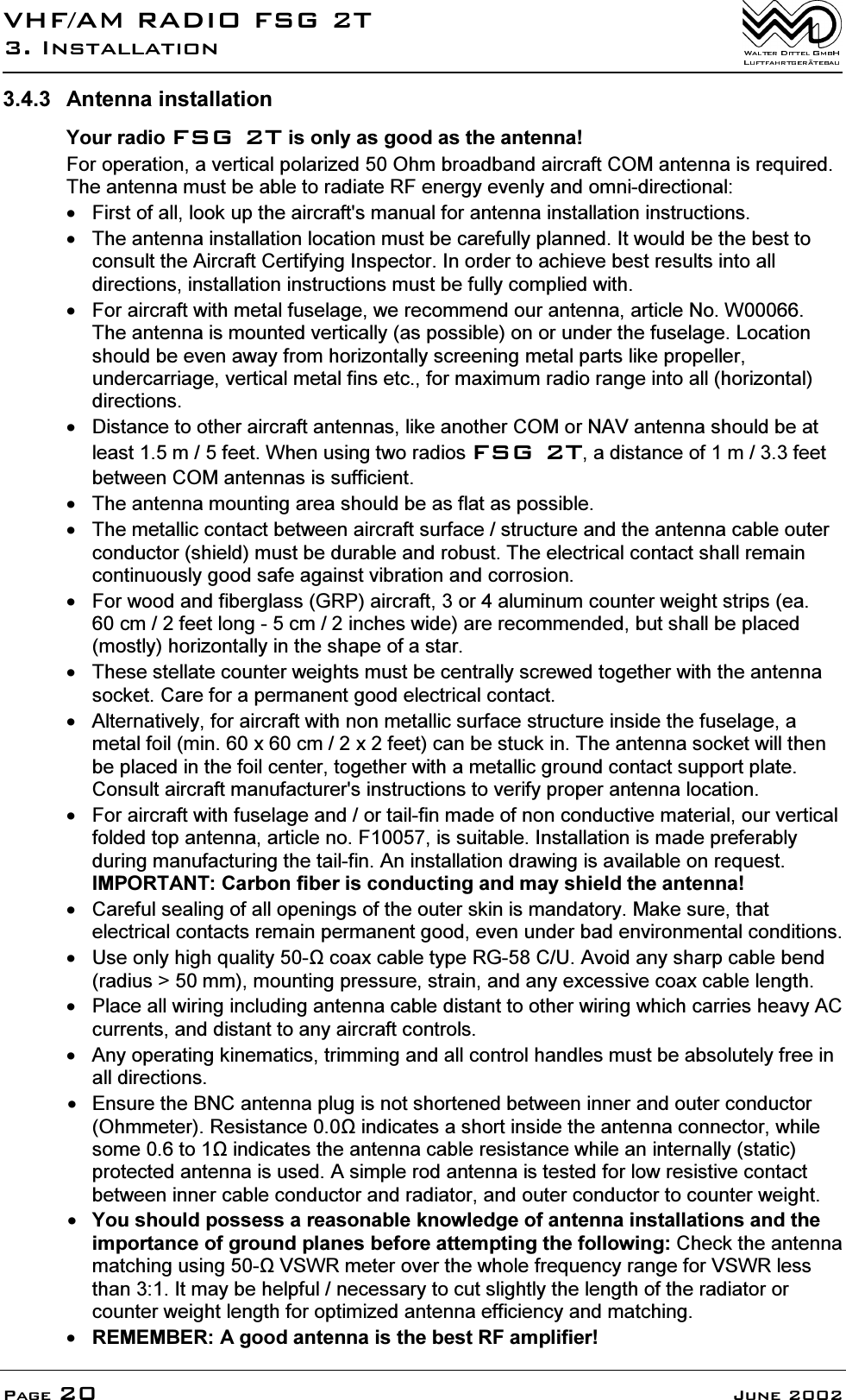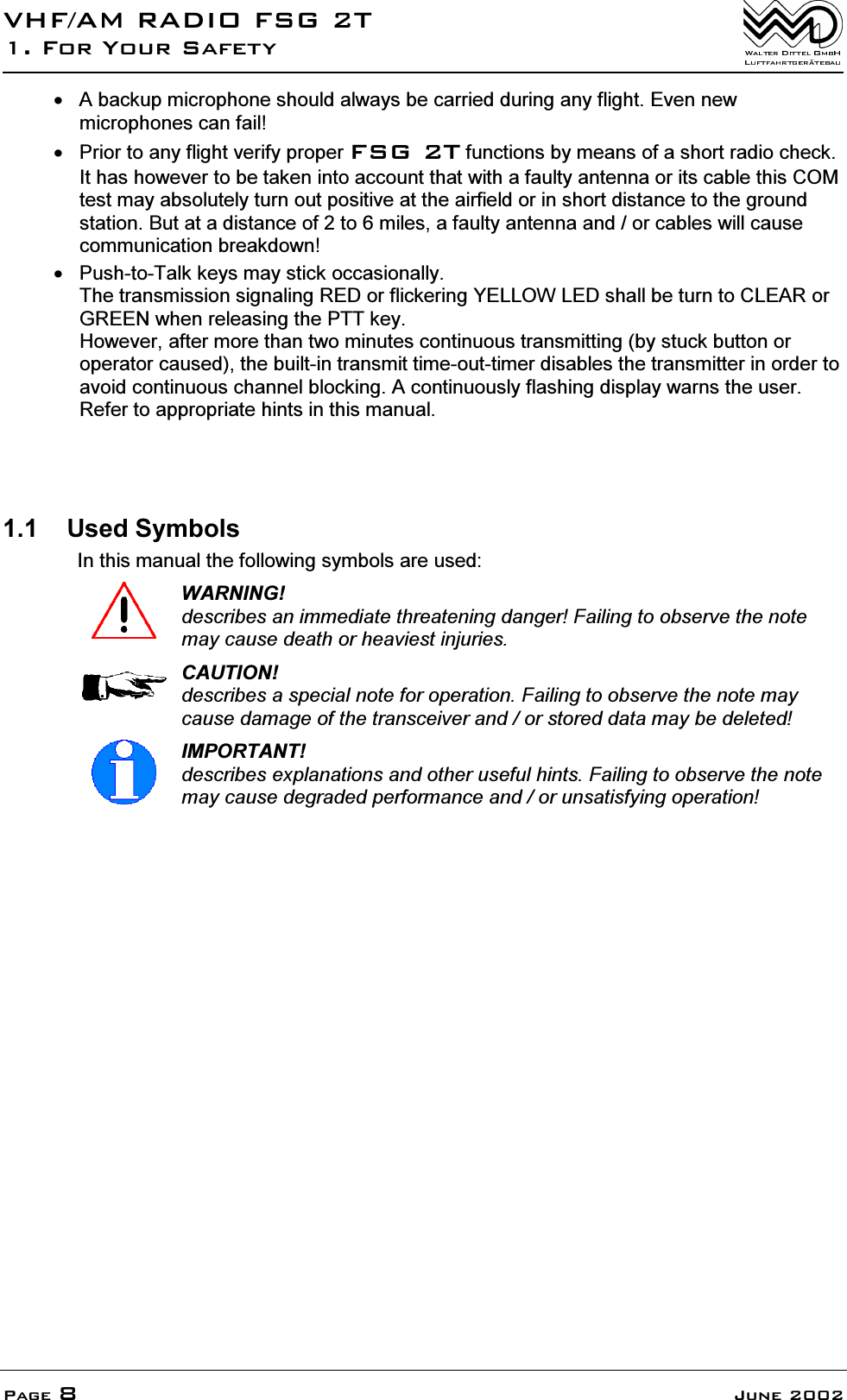 f.u.n.k.e. AVIONICS GmbH VHF/AM COM Transceiver FSG 2T 2T Installation Manual Part 1