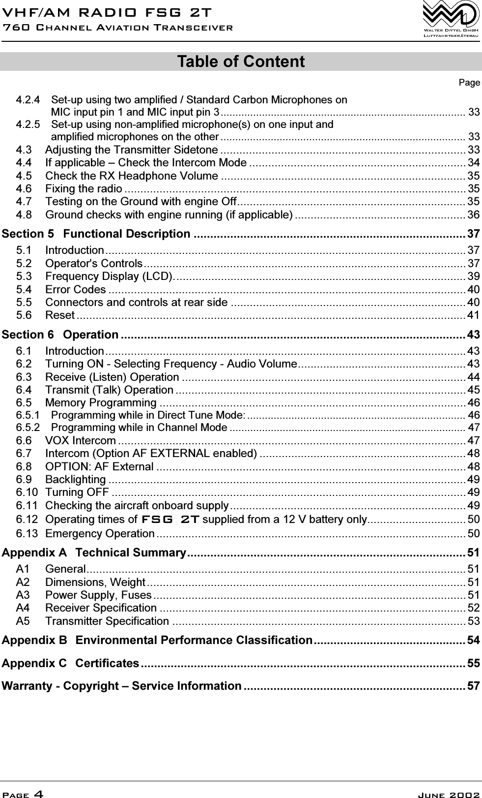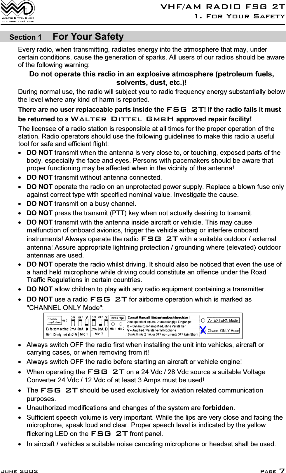 ![9+)$05$',2)6*7)RU<RXU6DIHW\-XQH 3DJH6HFWLRQ )RU<RXU6DIHW\(YHU\UDGLRZKHQWUDQVPLWWLQJUDGLDWHVHQHUJ\LQWRWKHDWPRVSKHUHWKDWPD\XQGHUFHUWDLQFRQGLWLRQVFDXVHWKHJHQHUDWLRQRIVSDUNV$OOXVHUVRIRXUUDGLRVVKRXOGEHDZDUHRIWKHIROORZLQJZDUQLQJ'RQRWRSHUDWHWKLVUDGLRLQDQH[SORVLYHDWPRVSKHUHSHWUROHXPIXHOVVROYHQWVGXVWHWF'XULQJQRUPDOXVHWKHUDGLRZLOOVXEMHFW\RXWRUDGLRIUHTXHQF\HQHUJ\VXEVWDQWLDOO\EHORZWKHOHYHOZKHUHDQ\NLQGRIKDUPLVUHSRUWHG7KHUHDUHQRXVHUUHSODFHDEOHSDUWVLQVLGHWKH)6*7,IWKHUDGLRIDLOVLWPXVWEHUHWXUQHGWRD:DOWHU'LWWHO*PE+DSSURYHGUHSDLUIDFLOLW\7KHOLFHQVHHRIDUDGLRVWDWLRQLVUHVSRQVLEOHDWDOOWLPHVIRUWKHSURSHURSHUDWLRQRIWKHVWDWLRQ5DGLRRSHUDWRUVVKRXOGXVHWKHIROORZLQJJXLGHOLQHVWRPDNHWKLVUDGLRDXVHIXOWRROIRUVDIHDQGHIILFLHQWIOLJKW'2127WUDQVPLWZKHQWKHDQWHQQDLVYHU\FORVHWRRUWRXFKLQJH[SRVHGSDUWVRIWKHERG\HVSHFLDOO\WKHIDFHDQGH\HV3HUVRQVZLWKSDFHPDNHUVVKRXOGEHDZDUHWKDWSURSHUIXQFWLRQLQJPD\EHDIIHFWHGZKHQLQWKHYLFLQLW\RIWKHDQWHQQD'2127WUDQVPLWZLWKRXWDQWHQQDFRQQHFWHG'2127RSHUDWHWKHUDGLRRQDQXQSURWHFWHGSRZHUVXSSO\5HSODFHDEORZQIXVHRQO\DJDLQVWFRUUHFWW\SHZLWKVSHFLILHGQRPLQDOYDOXH,QYHVWLJDWHWKHFDXVH'2127WUDQVPLWRQDEXV\FKDQQHO'2127SUHVVWKHWUDQVPLW377NH\ZKHQQRWDFWXDOO\GHVLULQJWRWUDQVPLW'2127WUDQVPLWZLWKWKHDQWHQQDLQVLGHDLUFUDIWRUYHKLFOH7KLVPD\FDXVHPDOIXQFWLRQRIRQERDUGDYLRQLFVWULJJHUWKHYHKLFOHDLUEDJRULQWHUIHUHRQERDUGLQVWUXPHQWV$OZD\VRSHUDWHWKHUDGLR)6*7ZLWKDVXLWDEOHRXWGRRUH[WHUQDODQWHQQD$VVXUHDSSURSULDWHOLJKWQLQJSURWHFWLRQJURXQGLQJZKHUHHOHYDWHGRXWGRRUDQWHQQDVDUHXVHG'2127RSHUDWHWKHUDGLRZKLOVWGULYLQJ,WVKRXOGDOVREHQRWLFHGWKDWHYHQWKHXVHRIDKDQGKHOGPLFURSKRQHZKLOHGULYLQJFRXOGFRQVWLWXWHDQRIIHQFHXQGHUWKH5RDG7UDIILF5HJXODWLRQVLQFHUWDLQFRXQWULHV'2127DOORZFKLOGUHQWRSOD\ZLWKDQ\UDGLRHTXLSPHQWFRQWDLQLQJDWUDQVPLWWHU'2127XVHDUDGLR)6*7IRUDLUERUQHRSHUDWLRQZKLFKLVPDUNHGDV&+$11(/21/<0RGH $OZD\VVZLWFK2))WKHUDGLRILUVWZKHQLQVWDOOLQJWKHXQLWLQWRYHKLFOHVDLUFUDIWRUFDUU\LQJFDVHVRUZKHQUHPRYLQJIURPLW $OZD\VVZLWFK2))WKHUDGLREHIRUHVWDUWLQJDQDLUFUDIWRUYHKLFOHHQJLQH :KHQRSHUDWLQJWKH)6*7RQD9GF9GFVRXUFHDVXLWDEOH9ROWDJH&RQYHUWHU9GF9GFRIDWOHDVW$PSVPXVWEHXVHG7KH)6*7VKRXOGEHXVHGH[FOXVLYHO\IRUDYLDWLRQUHODWHGFRPPXQLFDWLRQSXUSRVHV 8QDXWKRUL]HGPRGLILFDWLRQVDQGFKDQJHVRIWKHV\VWHPDUHIRUELGGHQ 6XIILFLHQWVSHHFKYROXPHLVYHU\LPSRUWDQW:KLOHWKHOLSVDUHYHU\FORVHDQGIDFLQJWKHPLFURSKRQHVSHDNORXGDQGFOHDU3URSHUVSHHFKOHYHOLVLQGLFDWHGE\WKH\HOORZIOLFNHULQJ/('RQWKH)6*7IURQWSDQHO ,QDLUFUDIWYHKLFOHVDVXLWDEOHQRLVHFDQFHOLQJPLFURSKRQHRUKHDGVHWVKDOOEHXVHG](https://usermanual.wiki/f-u-n-k-e-AVIONICS/FSG2T.2T-Installation-Manual-Part-1/User-Guide-268348-Page-7.png)