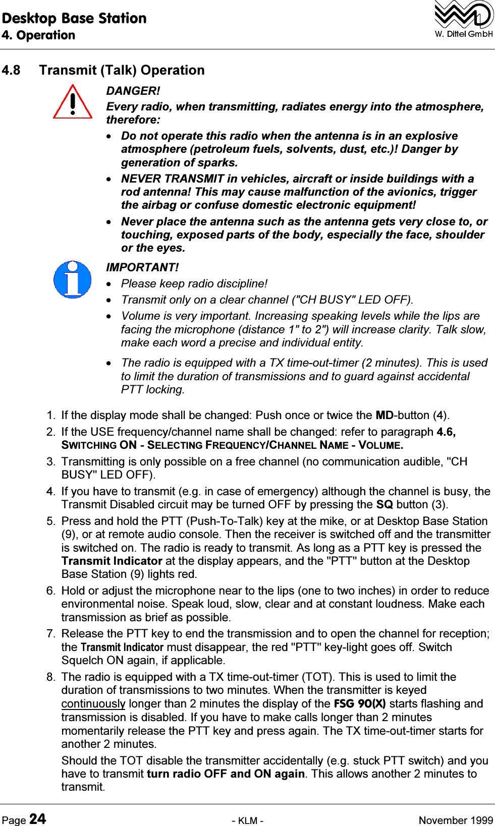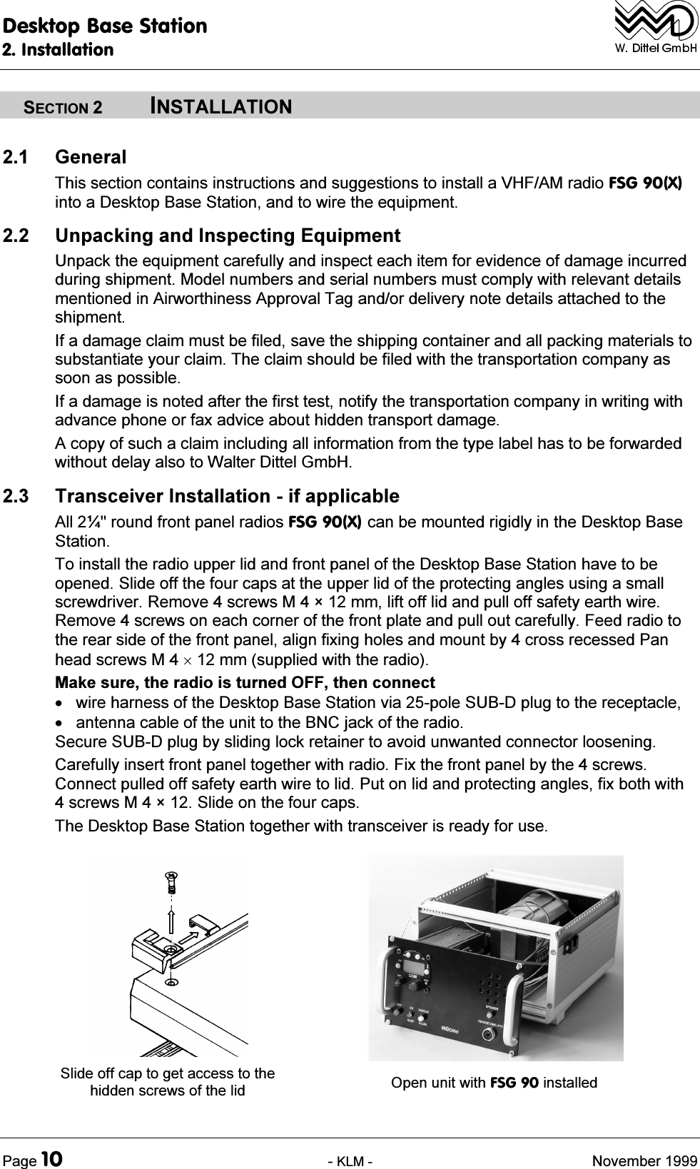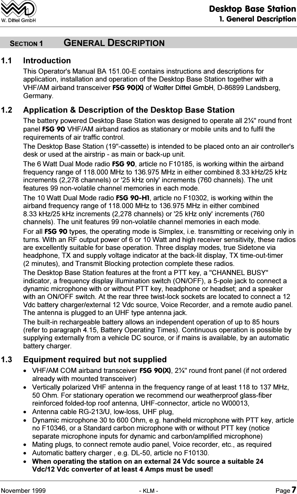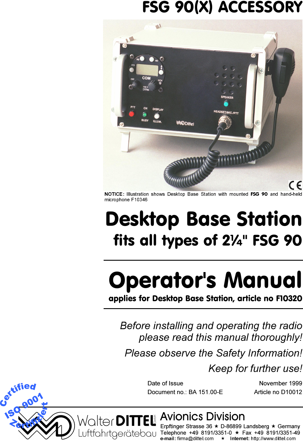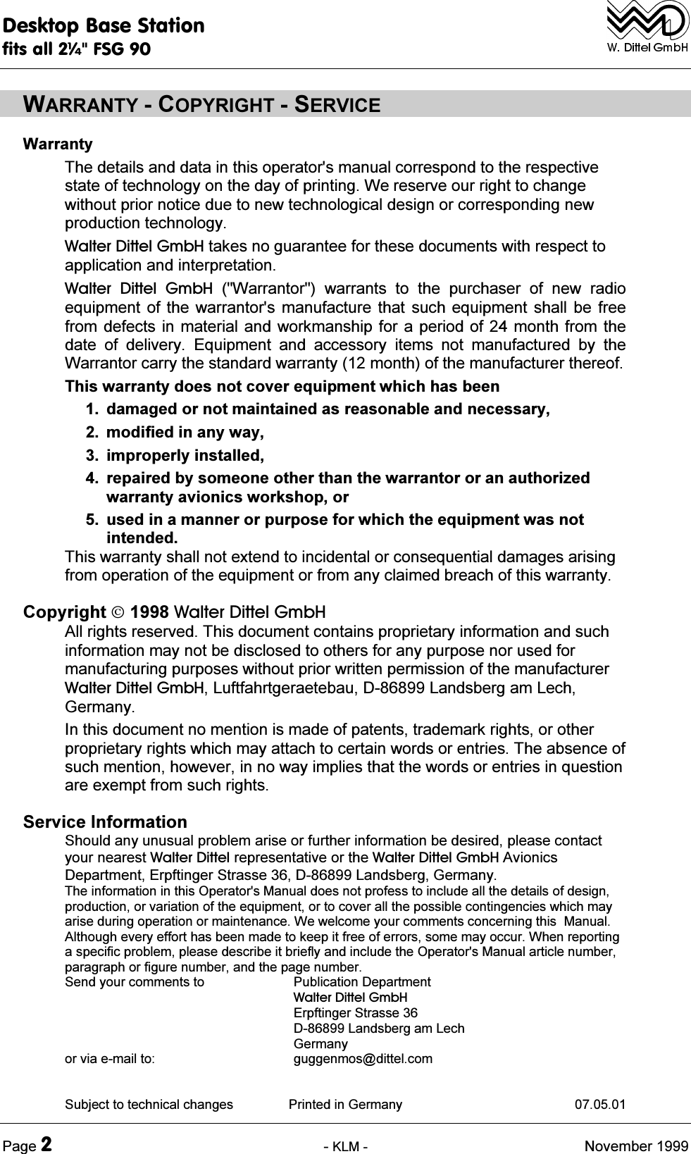 !['HVNWRS%DVH6WDWLRQILWVDOOõ)6*3DJH./0 1RYHPEHU:$55$17<&23<5,*+76(59,&(:DUUDQW\7KHGHWDLOVDQGGDWDLQWKLVRSHUDWRUVPDQXDOFRUUHVSRQGWRWKHUHVSHFWLYHVWDWHRIWHFKQRORJ\RQWKHGD\RISULQWLQJ:HUHVHUYHRXUULJKWWRFKDQJHZLWKRXWSULRUQRWLFHGXHWRQHZWHFKQRORJLFDOGHVLJQRUFRUUHVSRQGLQJQHZSURGXFWLRQWHFKQRORJ\:DOWHU'LWWHO*PE+WDNHVQRJXDUDQWHHIRUWKHVHGRFXPHQWVZLWKUHVSHFWWRDSSOLFDWLRQDQGLQWHUSUHWDWLRQ:DOWHU 'LWWHO *PE+:DUUDQWRUZDUUDQWVWRWKHSXUFKDVHURIQHZUDGLRHTXLSPHQW RI WKH ZDUUDQWRUV PDQXIDFWXUH WKDW VXFK HTXLSPHQW VKDOO EHIUHHIURPGHIHFWVLQPDWHULDODQGZRUNPDQVKLSIRUDSHULRGRIPRQWKIURPWKHGDWH RI GHOLYHU\ (TXLSPHQW DQG DFFHVVRU\ LWHPV QRW PDQXIDFWXUHG E\ WKH:DUUDQWRUFDUU\WKHVWDQGDUGZDUUDQW\PRQWKRIWKHPDQXIDFWXUHUWKHUHRI7KLVZDUUDQW\GRHVQRWFRYHUHTXLSPHQWZKLFKKDVEHHQ GDPDJHGRUQRWPDLQWDLQHGDVUHDVRQDEOHDQGQHFHVVDU\ PRGLILHGLQDQ\ZD\ LPSURSHUO\LQVWDOOHG UHSDLUHGE\VRPHRQHRWKHUWKDQWKHZDUUDQWRURUDQDXWKRUL]HGZDUUDQW\DYLRQLFVZRUNVKRSRU XVHGLQDPDQQHURUSXUSRVHIRUZKLFKWKHHTXLSPHQWZDVQRWLQWHQGHG7KLVZDUUDQW\VKDOOQRWH[WHQGWRLQFLGHQWDORUFRQVHTXHQWLDOGDPDJHVDULVLQJIURPRSHUDWLRQRIWKHHTXLSPHQWRUIURPDQ\FODLPHGEUHDFKRIWKLVZDUUDQW\&RS\ULJKW¸:DOWHU'LWWHO*PE+$OOULJKWVUHVHUYHG7KLVGRFXPHQWFRQWDLQVSURSULHWDU\LQIRUPDWLRQDQGVXFKLQIRUPDWLRQPD\QRWEHGLVFORVHGWRRWKHUVIRUDQ\SXUSRVHQRUXVHGIRUPDQXIDFWXULQJSXUSRVHVZLWKRXWSULRUZULWWHQSHUPLVVLRQRIWKHPDQXIDFWXUHU:DOWHU'LWWHO*PE+/XIWIDKUWJHUDHWHEDX'/DQGVEHUJDP/HFK*HUPDQ\,QWKLVGRFXPHQWQRPHQWLRQLVPDGHRISDWHQWVWUDGHPDUNULJKWVRURWKHUSURSULHWDU\ULJKWVZKLFKPD\DWWDFKWRFHUWDLQZRUGVRUHQWULHV7KHDEVHQFHRIVXFKPHQWLRQKRZHYHULQQRZD\LPSOLHVWKDWWKHZRUGVRUHQWULHVLQTXHVWLRQDUHH[HPSWIURPVXFKULJKWV6HUYLFH,QIRUPDWLRQ6KRXOGDQ\XQXVXDOSUREOHPDULVHRUIXUWKHULQIRUPDWLRQEHGHVLUHGSOHDVHFRQWDFW\RXUQHDUHVW:DOWHU'LWWHOUHSUHVHQWDWLYHRUWKH:DOWHU'LWWHO*PE+$YLRQLFV'HSDUWPHQW(USIWLQJHU6WUDVVH'/DQGVEHUJ*HUPDQ\7KHLQIRUPDWLRQLQWKLV2SHUDWRUV0DQXDOGRHVQRWSURIHVVWRLQFOXGHDOOWKHGHWDLOVRIGHVLJQSURGXFWLRQRUYDULDWLRQRIWKHHTXLSPHQWRUWRFRYHUDOOWKHSRVVLEOHFRQWLQJHQFLHVZKLFKPD\DULVHGXULQJRSHUDWLRQRUPDLQWHQDQFH:HZHOFRPH\RXUFRPPHQWVFRQFHUQLQJWKLV0DQXDO$OWKRXJKHYHU\HIIRUWKDVEHHQPDGHWRNHHSLWIUHHRIHUURUVVRPHPD\RFFXU:KHQUHSRUWLQJDVSHFLILFSUREOHPSOHDVHGHVFULEHLWEULHIO\DQGLQFOXGHWKH2SHUDWRUV0DQXDODUWLFOHQXPEHUSDUDJUDSKRUILJXUHQXPEHUDQGWKHSDJHQXPEHU6HQG\RXUFRPPHQWVWR 3XEOLFDWLRQ'HSDUWPHQW:DOWHU'LWWHO*PE+(USIWLQJHU6WUDVVH'/DQGVEHUJDP/HFK*HUPDQ\RUYLDHPDLOWR JXJJHQPRV#GLWWHOFRP6XEMHFWWRWHFKQLFDOFKDQJHV 3ULQWHGLQ*HUPDQ\ ](https://usermanual.wiki/f-u-n-k-e-AVIONICS/FSG90.Desktop-case-with-front-module-part-one/User-Guide-169916-Page-2.png)