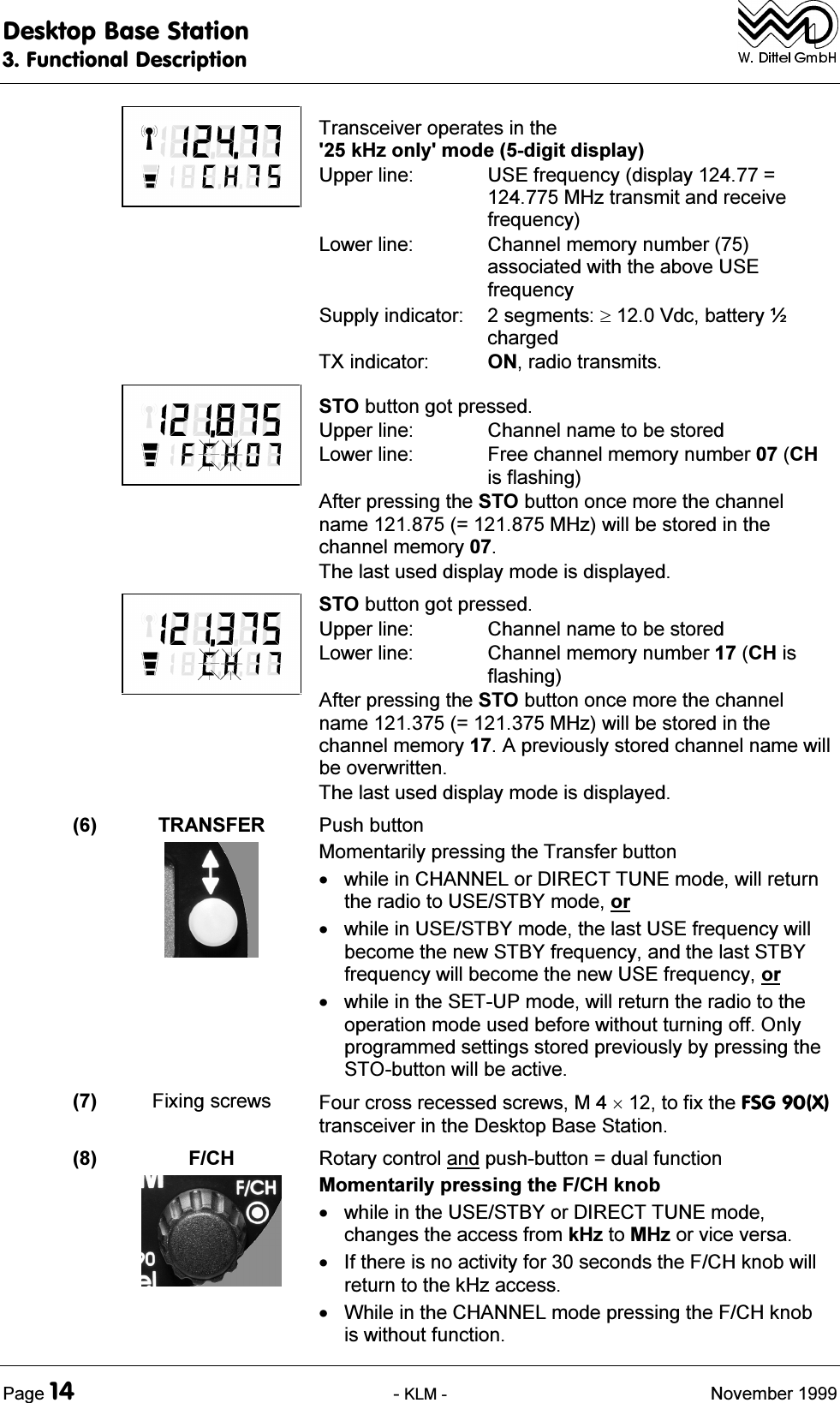 !['HVNWRS%DVH6WDWLRQ)XQFWLRQDO'HVFULSWLRQ3DJH ./0 1RYHPEHU7UDQVFHLYHURSHUDWHVLQWKHN+]RQO\PRGHGLJLWGLVSOD\8SSHUOLQH 86(IUHTXHQF\GLVSOD\ 0+]WUDQVPLWDQGUHFHLYHIUHTXHQF\/RZHUOLQH &KDQQHOPHPRU\QXPEHUDVVRFLDWHGZLWKWKHDERYH86(IUHTXHQF\6XSSO\LQGLFDWRU VHJPHQWV9GFEDWWHU\òFKDUJHG7;LQGLFDWRU 21UDGLRWUDQVPLWV672EXWWRQJRWSUHVVHG8SSHUOLQH &KDQQHOQDPHWREHVWRUHG/RZHUOLQH )UHHFKDQQHOPHPRU\QXPEHU&+LVIODVKLQJ$IWHUSUHVVLQJWKH672EXWWRQRQFHPRUHWKHFKDQQHOQDPH 0+]ZLOOEHVWRUHGLQWKHFKDQQHOPHPRU\7KHODVWXVHGGLVSOD\PRGHLVGLVSOD\HG672EXWWRQJRWSUHVVHG8SSHUOLQH &KDQQHOQDPHWREHVWRUHG/RZHUOLQH &KDQQHOPHPRU\QXPEHU&+LVIODVKLQJ$IWHUSUHVVLQJWKH672EXWWRQRQFHPRUHWKHFKDQQHOQDPH 0+]ZLOOEHVWRUHGLQWKHFKDQQHOPHPRU\$SUHYLRXVO\VWRUHGFKDQQHOQDPHZLOOEHRYHUZULWWHQ7KHODVWXVHGGLVSOD\PRGHLVGLVSOD\HG 75$16)(5 3XVKEXWWRQ0RPHQWDULO\SUHVVLQJWKH7UDQVIHUEXWWRQ ZKLOHLQ&+$11(/RU',5(&7781(PRGHZLOOUHWXUQWKHUDGLRWR86(67%<PRGHRU ZKLOHLQ86(67%<PRGHWKHODVW86(IUHTXHQF\ZLOOEHFRPHWKHQHZ67%<IUHTXHQF\DQGWKHODVW67%<IUHTXHQF\ZLOOEHFRPHWKHQHZ86(IUHTXHQF\RU ZKLOHLQWKH6(783PRGHZLOOUHWXUQWKHUDGLRWRWKHRSHUDWLRQPRGHXVHGEHIRUHZLWKRXWWXUQLQJRII2QO\SURJUDPPHGVHWWLQJVVWRUHGSUHYLRXVO\E\SUHVVLQJWKH672EXWWRQZLOOEHDFWLYH )L[LQJVFUHZV )RXUFURVVUHFHVVHGVFUHZV0WRIL[WKH)6*;WUDQVFHLYHULQWKH'HVNWRS%DVH6WDWLRQ )&+ 5RWDU\FRQWURODQGSXVKEXWWRQ GXDOIXQFWLRQ0RPHQWDULO\SUHVVLQJWKH)&+NQRE ZKLOHLQWKH86(67%<RU',5(&7781(PRGHFKDQJHVWKHDFFHVVIURPN+]WR0+]RUYLFHYHUVD ,IWKHUHLVQRDFWLYLW\IRUVHFRQGVWKH)&+NQREZLOOUHWXUQWRWKHN+]DFFHVV :KLOHLQWKH&+$11(/PRGHSUHVVLQJWKH)&+NQRELVZLWKRXWIXQFWLRQ](https://usermanual.wiki/f-u-n-k-e-AVIONICS/FSG90.Desktop-case-with-front-module-part-one/User-Guide-169916-Page-14.png)