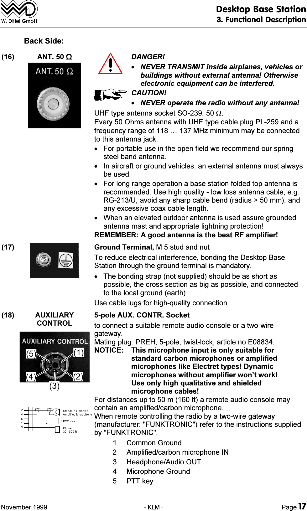 !['HVNWRS%DVH6WDWLRQ)XQFWLRQDO'HVFULSWLRQ1RYHPEHU ./0 3DJH%DFN6LGH '$1*(51(9(575$160,7LQVLGHDLUSODQHVYHKLFOHVRUEXLOGLQJVZLWKRXWH[WHUQDODQWHQQD2WKHUZLVHHOHFWURQLFHTXLSPHQWFDQEHLQWHUIHUHG&$87,211(9(5RSHUDWHWKHUDGLRZLWKRXWDQ\DQWHQQD$178+)W\SHDQWHQQDVRFNHW62W(YHU\2KPVDQWHQQDZLWK8+)W\SHFDEOHSOXJ3/DQGDIUHTXHQF\UDQJHRI¡0+]PLQLPXPPD\EHFRQQHFWHGWRWKLVDQWHQQDMDFN )RUSRUWDEOHXVHLQWKHRSHQILHOGZHUHFRPPHQGRXUVSULQJVWHHOEDQGDQWHQQD ,QDLUFUDIWRUJURXQGYHKLFOHVDQH[WHUQDODQWHQQDPXVWDOZD\VEHXVHG )RUORQJUDQJHRSHUDWLRQDEDVHVWDWLRQIROGHGWRSDQWHQQDLVUHFRPPHQGHG8VHKLJKTXDOLW\ORZORVVDQWHQQDFDEOHHJ5*8DYRLGDQ\VKDUSFDEOHEHQGUDGLXV!PPDQGDQ\H[FHVVLYHFRD[FDEOHOHQJWK :KHQDQHOHYDWHGRXWGRRUDQWHQQDLVXVHGDVVXUHJURXQGHGDQWHQQDPDVWDQGDSSURSULDWHOLJKWQLQJSURWHFWLRQ5(0(0%(5$JRRGDQWHQQDLVWKHEHVW5)DPSOLILHU *URXQG7HUPLQDO0VWXGDQGQXW7RUHGXFHHOHFWULFDOLQWHUIHUHQFHERQGLQJWKH'HVNWRS%DVH6WDWLRQWKURXJKWKHJURXQGWHUPLQDOLVPDQGDWRU\ 7KHERQGLQJVWUDSQRWVXSSOLHGVKRXOGEHDVVKRUWDVSRVVLEOHWKHFURVVVHFWLRQDVELJDVSRVVLEOHDQGFRQQHFWHGWRWKHORFDOJURXQGHDUWK8VHFDEOHOXJVIRUKLJKTXDOLW\FRQQHFWLRQ $8;,/,$5<&21752/SROH$8;&21756RFNHWWRFRQQHFWDVXLWDEOHUHPRWHDXGLRFRQVROHRUDWZRZLUHJDWHZD\0DWLQJSOXJ35(+SROHWZLVWORFNDUWLFOHQR(127,&( 7KLVPLFURSKRQHLQSXWLVRQO\VXLWDEOHIRUVWDQGDUGFDUERQPLFURSKRQHVRUDPSOLILHGPLFURSKRQHVOLNH(OHFWUHWW\SHV'\QDPLFPLFURSKRQHVZLWKRXWDPSOLILHUZRQ¶WZRUN8VHRQO\KLJKTXDOLWDWLYHDQGVKLHOGHGPLFURSKRQHFDEOHV)RUGLVWDQFHVXSWRPIWDUHPRWHDXGLRFRQVROHPD\FRQWDLQDQDPSOLILHGFDUERQPLFURSKRQH:KHQUHPRWHFRQWUROOLQJWKHUDGLRE\DWZRZLUHJDWHZD\PDQXIDFWXUHU)81.7521,&UHIHUWRWKHLQVWUXFWLRQVVXSSOLHGE\)81.7521,& &RPPRQ*URXQG $PSOLILHGFDUERQPLFURSKRQH,1 +HDGSKRQH$XGLR287 0LFURSKRQH*URXQG377NH\](https://usermanual.wiki/f-u-n-k-e-AVIONICS/FSG90.Desktop-case-with-front-module-part-one/User-Guide-169916-Page-17.png)