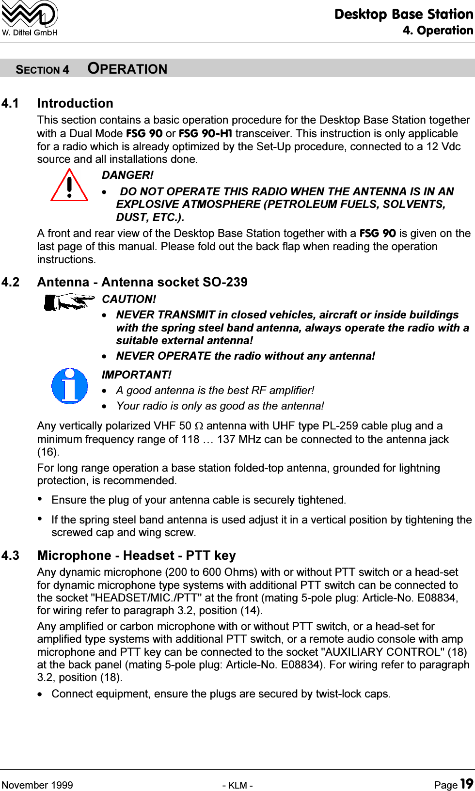 !['HVNWRS%DVH6WDWLRQ2SHUDWLRQ1RYHPEHU ./0 3DJH6(&7,2123(5$7,21 ,QWURGXFWLRQ7KLVVHFWLRQFRQWDLQVDEDVLFRSHUDWLRQSURFHGXUHIRUWKH'HVNWRS%DVH6WDWLRQWRJHWKHUZLWKD'XDO0RGH)6*RU)6*+WUDQVFHLYHU7KLVLQVWUXFWLRQLVRQO\DSSOLFDEOHIRUDUDGLRZKLFKLVDOUHDG\RSWLPL]HGE\WKH6HW8SSURFHGXUHFRQQHFWHGWRD9GFVRXUFHDQGDOOLQVWDOODWLRQVGRQH'$1*(5'212723(5$7(7+,65$',2:+(17+($17(11$,6,1$1(;3/26,9($70263+(5(3(752/(80)8(/662/9(176'867(7&$IURQWDQGUHDUYLHZRIWKH'HVNWRS%DVH6WDWLRQWRJHWKHUZLWKD)6*LVJLYHQRQWKHODVWSDJHRIWKLVPDQXDO3OHDVHIROGRXWWKHEDFNIODSZKHQUHDGLQJWKHRSHUDWLRQLQVWUXFWLRQV $QWHQQD$QWHQQDVRFNHW62&$87,211(9(575$160,7LQFORVHGYHKLFOHVDLUFUDIWRULQVLGHEXLOGLQJVZLWKWKHVSULQJVWHHOEDQGDQWHQQDDOZD\VRSHUDWHWKHUDGLRZLWKDVXLWDEOHH[WHUQDODQWHQQD1(9(523(5$7(WKHUDGLRZLWKRXWDQ\DQWHQQD,03257$17$JRRGDQWHQQDLVWKHEHVW5)DPSOLILHU<RXUUDGLRLVRQO\DVJRRGDVWKHDQWHQQD$Q\YHUWLFDOO\SRODUL]HG9+)WDQWHQQDZLWK8+)W\SH3/FDEOHSOXJDQGDPLQLPXPIUHTXHQF\UDQJHRI¡0+]FDQEHFRQQHFWHGWRWKHDQWHQQDMDFN)RUORQJUDQJHRSHUDWLRQDEDVHVWDWLRQIROGHGWRSDQWHQQDJURXQGHGIRUOLJKWQLQJSURWHFWLRQLVUHFRPPHQGHG(QVXUHWKHSOXJRI\RXUDQWHQQDFDEOHLVVHFXUHO\WLJKWHQHG,IWKHVSULQJVWHHOEDQGDQWHQQDLVXVHGDGMXVWLWLQDYHUWLFDOSRVLWLRQE\WLJKWHQLQJWKHVFUHZHGFDSDQGZLQJVFUHZ 0LFURSKRQH+HDGVHW377NH\$Q\G\QDPLFPLFURSKRQHWR2KPVZLWKRUZLWKRXW377VZLWFKRUDKHDGVHWIRUG\QDPLFPLFURSKRQHW\SHV\VWHPVZLWKDGGLWLRQDO377VZLWFKFDQEHFRQQHFWHGWRWKHVRFNHW+($'6(70,&377DWWKHIURQWPDWLQJSROHSOXJ$UWLFOH1R(IRUZLULQJUHIHUWRSDUDJUDSKSRVLWLRQ$Q\DPSOLILHGRUFDUERQPLFURSKRQHZLWKRUZLWKRXW377VZLWFKRUDKHDGVHWIRUDPSOLILHGW\SHV\VWHPVZLWKDGGLWLRQDO377VZLWFKRUDUHPRWHDXGLRFRQVROHZLWKDPSPLFURSKRQHDQG377NH\FDQEHFRQQHFWHGWRWKHVRFNHW$8;,/,$5<&21752/DWWKHEDFNSDQHOPDWLQJSROHSOXJ$UWLFOH1R()RUZLULQJUHIHUWRSDUDJUDSKSRVLWLRQ &RQQHFWHTXLSPHQWHQVXUHWKHSOXJVDUHVHFXUHGE\WZLVWORFNFDSV](https://usermanual.wiki/f-u-n-k-e-AVIONICS/FSG90.Desktop-case-with-front-module-part-one/User-Guide-169916-Page-19.png)
