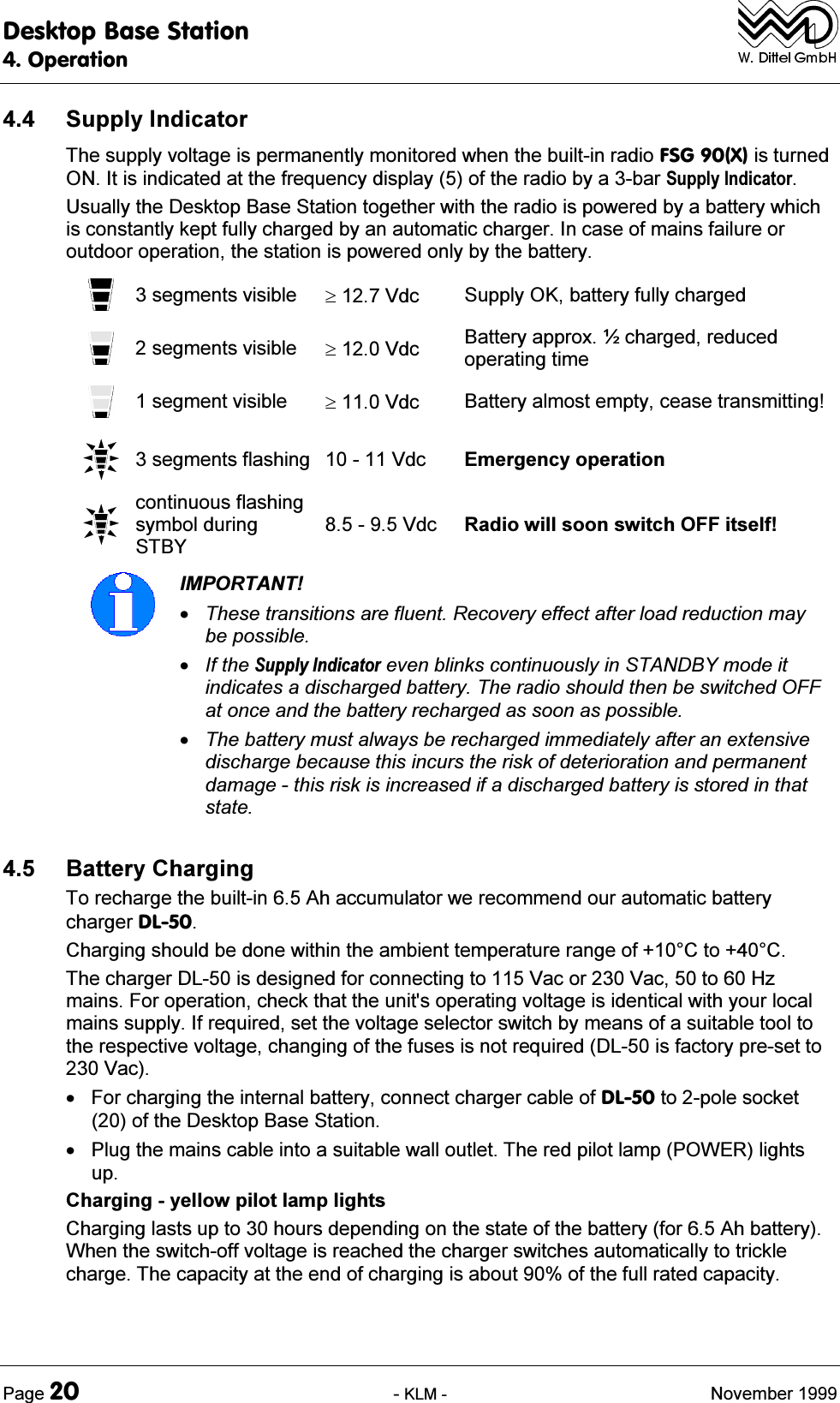 !['HVNWRS%DVH6WDWLRQ2SHUDWLRQ3DJH ./0 1RYHPEHU 6XSSO\,QGLFDWRU7KHVXSSO\YROWDJHLVSHUPDQHQWO\PRQLWRUHGZKHQWKHEXLOWLQUDGLR)6*;LVWXUQHG21,WLVLQGLFDWHGDWWKHIUHTXHQF\GLVSOD\RIWKHUDGLRE\DEDU6XSSO\,QGLFDWRU8VXDOO\WKH'HVNWRS%DVH6WDWLRQWRJHWKHUZLWKWKHUDGLRLVSRZHUHGE\DEDWWHU\ZKLFKLVFRQVWDQWO\NHSWIXOO\FKDUJHGE\DQDXWRPDWLFFKDUJHU,QFDVHRIPDLQVIDLOXUHRURXWGRRURSHUDWLRQWKHVWDWLRQLVSRZHUHGRQO\E\WKHEDWWHU\VHJPHQWVYLVLEOH 9GF 6XSSO\2.EDWWHU\IXOO\FKDUJHGVHJPHQWVYLVLEOH 9GF %DWWHU\DSSUR[òFKDUJHGUHGXFHGRSHUDWLQJWLPHVHJPHQWYLVLEOH 9GF %DWWHU\DOPRVWHPSW\FHDVHWUDQVPLWWLQJVHJPHQWVIODVKLQJ 9GF (PHUJHQF\RSHUDWLRQFRQWLQXRXVIODVKLQJV\PEROGXULQJ67%<9GF 5DGLRZLOOVRRQVZLWFK2))LWVHOI,03257$177KHVHWUDQVLWLRQVDUHIOXHQW5HFRYHU\HIIHFWDIWHUORDGUHGXFWLRQPD\EHSRVVLEOH,IWKH6XSSO\,QGLFDWRUHYHQEOLQNVFRQWLQXRXVO\LQ67$1'%<PRGHLWLQGLFDWHVDGLVFKDUJHGEDWWHU\7KHUDGLRVKRXOGWKHQEHVZLWFKHG2))DWRQFHDQGWKHEDWWHU\UHFKDUJHGDVVRRQDVSRVVLEOH7KHEDWWHU\PXVWDOZD\VEHUHFKDUJHGLPPHGLDWHO\DIWHUDQH[WHQVLYHGLVFKDUJHEHFDXVHWKLVLQFXUVWKHULVNRIGHWHULRUDWLRQDQGSHUPDQHQWGDPDJHWKLVULVNLVLQFUHDVHGLIDGLVFKDUJHGEDWWHU\LVVWRUHGLQWKDWVWDWH %DWWHU\&KDUJLQJ7RUHFKDUJHWKHEXLOWLQ$KDFFXPXODWRUZHUHFRPPHQGRXUDXWRPDWLFEDWWHU\FKDUJHU'/&KDUJLQJVKRXOGEHGRQHZLWKLQWKHDPELHQWWHPSHUDWXUHUDQJHRI&WR&7KHFKDUJHU'/LVGHVLJQHGIRUFRQQHFWLQJWR9DFRU9DFWR+]PDLQV)RURSHUDWLRQFKHFNWKDWWKHXQLWVRSHUDWLQJYROWDJHLVLGHQWLFDOZLWK\RXUORFDOPDLQVVXSSO\,IUHTXLUHGVHWWKHYROWDJHVHOHFWRUVZLWFKE\PHDQVRIDVXLWDEOHWRROWRWKHUHVSHFWLYHYROWDJHFKDQJLQJRIWKHIXVHVLVQRWUHTXLUHG'/LVIDFWRU\SUHVHWWR9DF )RUFKDUJLQJWKHLQWHUQDOEDWWHU\FRQQHFWFKDUJHUFDEOHRI'/WRSROHVRFNHWRIWKH'HVNWRS%DVH6WDWLRQ 3OXJWKHPDLQVFDEOHLQWRDVXLWDEOHZDOORXWOHW7KHUHGSLORWODPS32:(5OLJKWVXS&KDUJLQJ\HOORZSLORWODPSOLJKWV&KDUJLQJODVWVXSWRKRXUVGHSHQGLQJRQWKHVWDWHRIWKHEDWWHU\IRU$KEDWWHU\:KHQWKHVZLWFKRIIYROWDJHLVUHDFKHGWKHFKDUJHUVZLWFKHVDXWRPDWLFDOO\WRWULFNOHFKDUJH7KHFDSDFLW\DWWKHHQGRIFKDUJLQJLVDERXWRIWKHIXOOUDWHGFDSDFLW\](https://usermanual.wiki/f-u-n-k-e-AVIONICS/FSG90.Desktop-case-with-front-module-part-one/User-Guide-169916-Page-20.png)
