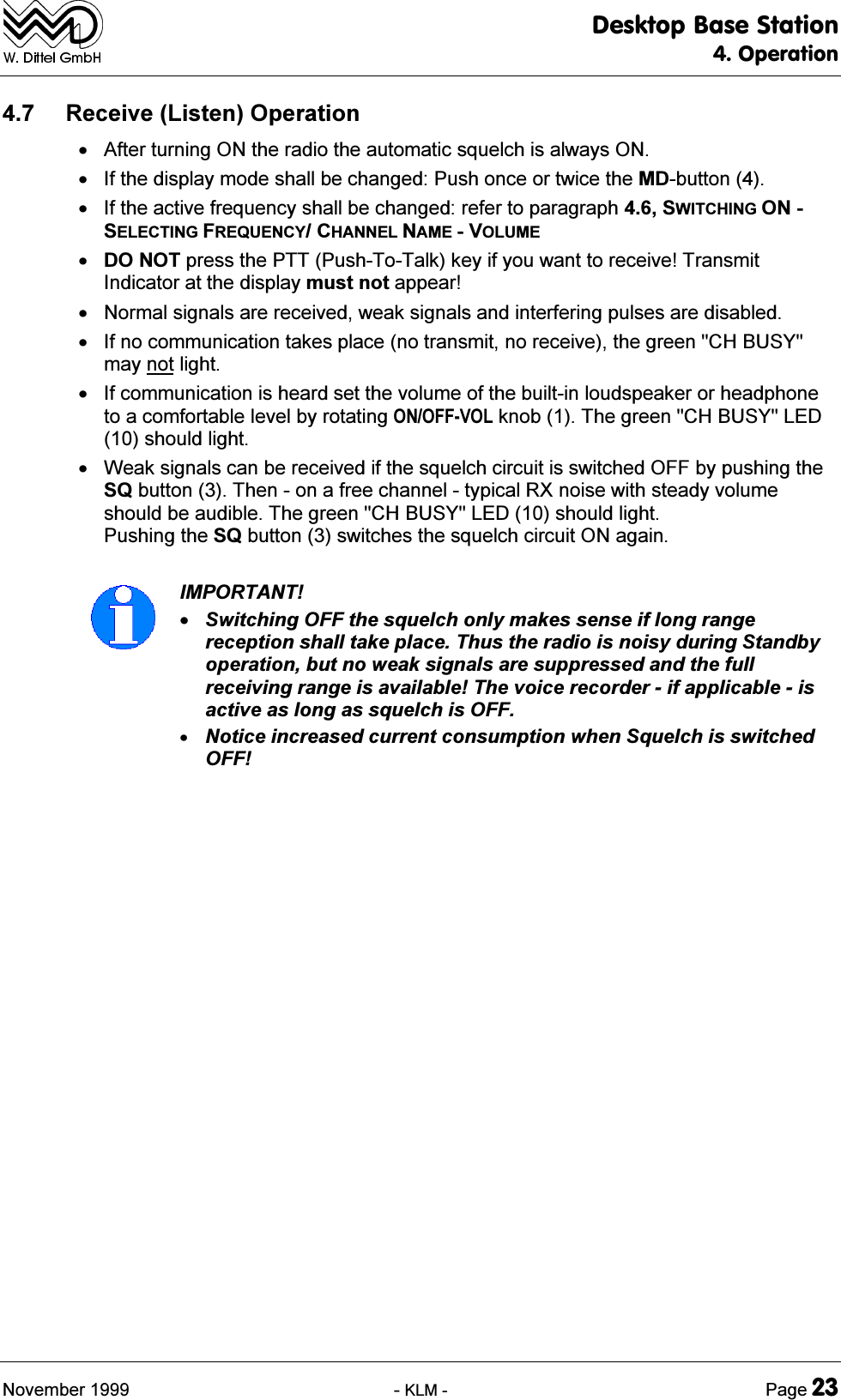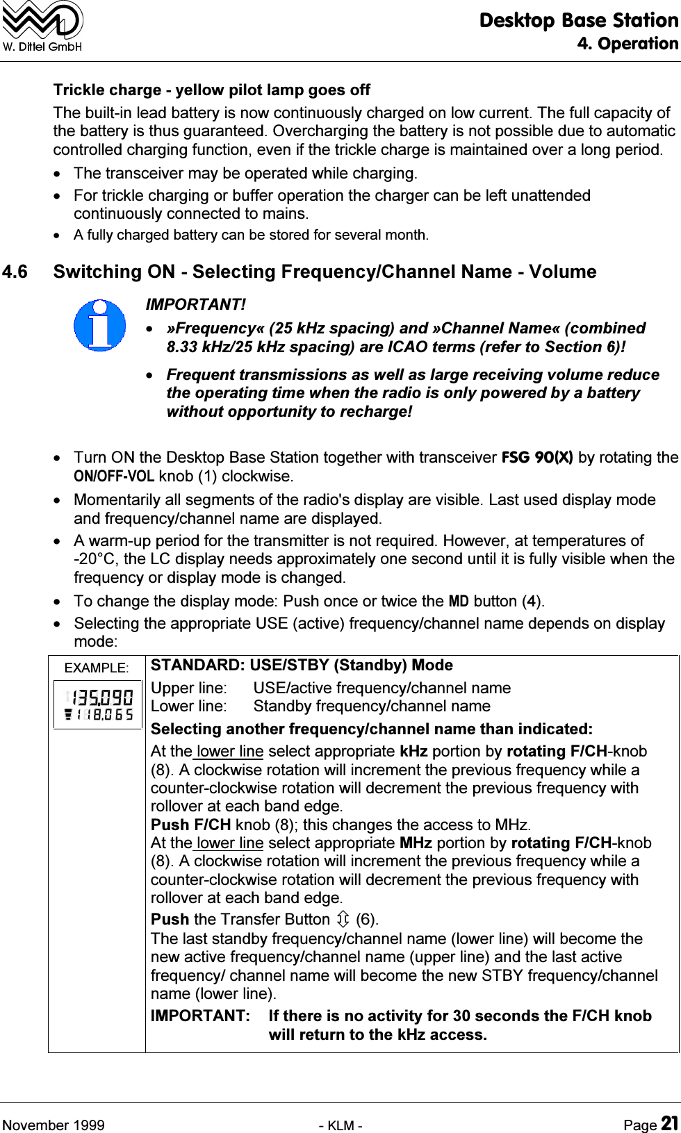 !['HVNWRS%DVH6WDWLRQ2SHUDWLRQ1RYHPEHU ./0 3DJH7ULFNOHFKDUJH\HOORZSLORWODPSJRHVRII7KHEXLOWLQOHDGEDWWHU\LVQRZFRQWLQXRXVO\FKDUJHGRQORZFXUUHQW7KHIXOOFDSDFLW\RIWKHEDWWHU\LVWKXVJXDUDQWHHG2YHUFKDUJLQJWKHEDWWHU\LVQRWSRVVLEOHGXHWRDXWRPDWLFFRQWUROOHGFKDUJLQJIXQFWLRQHYHQLIWKHWULFNOHFKDUJHLVPDLQWDLQHGRYHUDORQJSHULRG 7KHWUDQVFHLYHUPD\EHRSHUDWHGZKLOHFKDUJLQJ )RUWULFNOHFKDUJLQJRUEXIIHURSHUDWLRQWKHFKDUJHUFDQEHOHIWXQDWWHQGHGFRQWLQXRXVO\FRQQHFWHGWRPDLQV $IXOO\FKDUJHGEDWWHU\FDQEHVWRUHGIRUVHYHUDOPRQWK 6ZLWFKLQJ216HOHFWLQJ)UHTXHQF\&KDQQHO1DPH9ROXPH,03257$17ª)UHTXHQF\©N+]VSDFLQJDQGª&KDQQHO1DPH©FRPELQHGN+]N+]VSDFLQJDUH,&$2WHUPVUHIHUWR6HFWLRQ)UHTXHQWWUDQVPLVVLRQVDVZHOODVODUJHUHFHLYLQJYROXPHUHGXFHWKHRSHUDWLQJWLPHZKHQWKHUDGLRLVRQO\SRZHUHGE\DEDWWHU\ZLWKRXWRSSRUWXQLW\WRUHFKDUJH 7XUQ21WKH'HVNWRS%DVH6WDWLRQWRJHWKHUZLWKWUDQVFHLYHU)6*;E\URWDWLQJWKH212))92/NQREFORFNZLVH 0RPHQWDULO\DOOVHJPHQWVRIWKHUDGLRVGLVSOD\DUHYLVLEOH/DVWXVHGGLVSOD\PRGHDQGIUHTXHQF\FKDQQHOQDPHDUHGLVSOD\HG $ZDUPXSSHULRGIRUWKHWUDQVPLWWHULVQRWUHTXLUHG+RZHYHUDWWHPSHUDWXUHVRI&WKH/&GLVSOD\QHHGVDSSUR[LPDWHO\RQHVHFRQGXQWLOLWLVIXOO\YLVLEOHZKHQWKHIUHTXHQF\RUGLVSOD\PRGHLVFKDQJHG 7RFKDQJHWKHGLVSOD\PRGH3XVKRQFHRUWZLFHWKH0'EXWWRQ 6HOHFWLQJWKHDSSURSULDWH86(DFWLYHIUHTXHQF\FKDQQHOQDPHGHSHQGVRQGLVSOD\PRGH(;$03/( 67$1'$5'86(67%<6WDQGE\0RGH8SSHUOLQH 86(DFWLYHIUHTXHQF\FKDQQHOQDPH/RZHUOLQH 6WDQGE\IUHTXHQF\FKDQQHOQDPH6HOHFWLQJDQRWKHUIUHTXHQF\FKDQQHOQDPHWKDQLQGLFDWHG$WWKHORZHUOLQHVHOHFWDSSURSULDWHN+]SRUWLRQE\URWDWLQJ)&+NQRE$FORFNZLVHURWDWLRQZLOOLQFUHPHQWWKHSUHYLRXVIUHTXHQF\ZKLOHDFRXQWHUFORFNZLVHURWDWLRQZLOOGHFUHPHQWWKHSUHYLRXVIUHTXHQF\ZLWKUROORYHUDWHDFKEDQGHGJH3XVK)&+NQREWKLVFKDQJHVWKHDFFHVVWR0+]$WWKHORZHUOLQHVHOHFWDSSURSULDWH0+]SRUWLRQE\URWDWLQJ)&+NQRE$FORFNZLVHURWDWLRQZLOOLQFUHPHQWWKHSUHYLRXVIUHTXHQF\ZKLOHDFRXQWHUFORFNZLVHURWDWLRQZLOOGHFUHPHQWWKHSUHYLRXVIUHTXHQF\ZLWKUROORYHUDWHDFKEDQGHGJH3XVKWKH7UDQVIHU%XWWRQÙ7KHODVWVWDQGE\IUHTXHQF\FKDQQHOQDPHORZHUOLQHZLOOEHFRPHWKHQHZDFWLYHIUHTXHQF\FKDQQHOQDPHXSSHUOLQHDQGWKHODVWDFWLYHIUHTXHQF\FKDQQHOQDPHZLOOEHFRPHWKHQHZ67%<IUHTXHQF\FKDQQHOQDPHORZHUOLQH,03257$17 ,IWKHUHLVQRDFWLYLW\IRUVHFRQGVWKH)&+NQREZLOOUHWXUQWRWKHN+]DFFHVV](https://usermanual.wiki/f-u-n-k-e-AVIONICS/FSG90.Desktop-case-with-front-module-part-one/User-Guide-169916-Page-21.png)