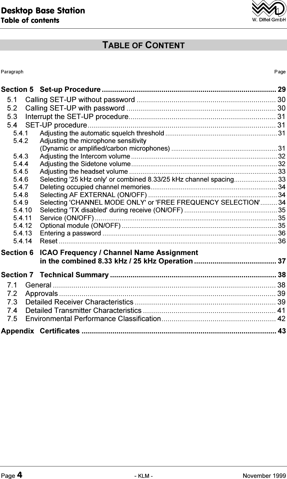 !['HVNWRS%DVH6WDWLRQ7DEOHRIFRQWHQWV3DJH./0 1RYHPEHU7$%/(2)&217(176HFWLRQ 6HWXS3URFHGXUH &DOOLQJ6(783ZLWKRXWSDVVZRUG &DOOLQJ6(783ZLWKSDVVZRUG ,QWHUUXSWWKH6(783SURFHGXUH 6(783SURFHGXUH $GMXVWLQJWKHDXWRPDWLFVTXHOFKWKUHVKROG $GMXVWLQJWKHPLFURSKRQHVHQVLWLYLW\'\QDPLFRUDPSOLILHGFDUERQPLFURSKRQHV $GMXVWLQJWKH,QWHUFRPYROXPH $GMXVWLQJWKH6LGHWRQHYROXPH $GMXVWLQJWKHKHDGVHWYROXPH 6HOHFWLQJN+]RQO\RUFRPELQHGN+]FKDQQHOVSDFLQJ 'HOHWLQJRFFXSLHGFKDQQHOPHPRULHV 6HOHFWLQJ$)(;7(51$/212)) 6HOHFWLQJ&+$11(/02'(21/<RU)5(()5(48(1&<6(/(&7,21 6HOHFWLQJ7;GLVDEOHGGXULQJUHFHLYH212)) 6HUYLFH212)) 2SWLRQDOPRGXOH212)) (QWHULQJDSDVVZRUG 5HVHW 6HFWLRQ ,&$2)UHTXHQF\&KDQQHO1DPH$VVLJQPHQWLQWKHFRPELQHGN+]N+]2SHUDWLRQ 6HFWLRQ 7HFKQLFDO6XPPDU\ *HQHUDO $SSURYDOV 'HWDLOHG5HFHLYHU&KDUDFWHULVWLFV 'HWDLOHG7UDQVPLWWHU&KDUDFWHULVWLFV (QYLURQPHQWDO3HUIRUPDQFH&ODVVLILFDWLRQ $SSHQGL[ &HUWLILFDWHV ](https://usermanual.wiki/f-u-n-k-e-AVIONICS/FSG90.Desktop-case-with-front-module-part-one/User-Guide-169916-Page-4.png)