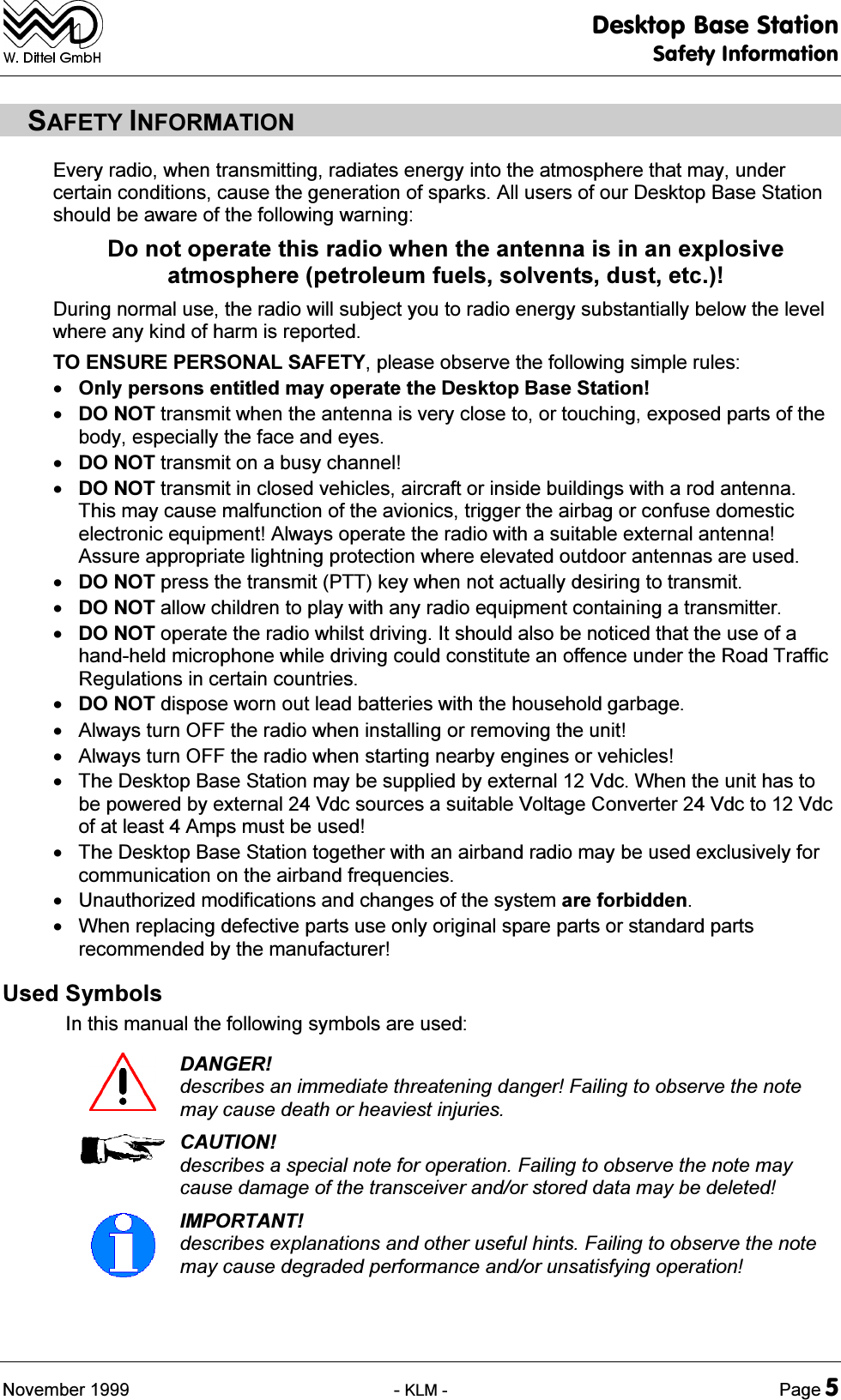 !['HVNWRS%DVH6WDWLRQ6DIHW\,QIRUPDWLRQ1RYHPEHU ./0 3DJH6$)(7<,1)250$7,21(YHU\UDGLRZKHQWUDQVPLWWLQJUDGLDWHVHQHUJ\LQWRWKHDWPRVSKHUHWKDWPD\XQGHUFHUWDLQFRQGLWLRQVFDXVHWKHJHQHUDWLRQRIVSDUNV$OOXVHUVRIRXU'HVNWRS%DVH6WDWLRQVKRXOGEHDZDUHRIWKHIROORZLQJZDUQLQJ'RQRWRSHUDWHWKLVUDGLRZKHQWKHDQWHQQDLVLQDQH[SORVLYHDWPRVSKHUHSHWUROHXPIXHOVVROYHQWVGXVWHWF'XULQJQRUPDOXVHWKHUDGLRZLOOVXEMHFW\RXWRUDGLRHQHUJ\VXEVWDQWLDOO\EHORZWKHOHYHOZKHUHDQ\NLQGRIKDUPLVUHSRUWHG72(1685(3(5621$/6$)(7<SOHDVHREVHUYHWKHIROORZLQJVLPSOHUXOHV2QO\SHUVRQVHQWLWOHGPD\RSHUDWHWKH'HVNWRS%DVH6WDWLRQ'2127WUDQVPLWZKHQWKHDQWHQQDLVYHU\FORVHWRRUWRXFKLQJH[SRVHGSDUWVRIWKHERG\HVSHFLDOO\WKHIDFHDQGH\HV'2127WUDQVPLWRQDEXV\FKDQQHO'2127WUDQVPLWLQFORVHGYHKLFOHVDLUFUDIWRULQVLGHEXLOGLQJVZLWKDURGDQWHQQD7KLVPD\FDXVHPDOIXQFWLRQRIWKHDYLRQLFVWULJJHUWKHDLUEDJRUFRQIXVHGRPHVWLFHOHFWURQLFHTXLSPHQW$OZD\VRSHUDWHWKHUDGLRZLWKDVXLWDEOHH[WHUQDODQWHQQD$VVXUHDSSURSULDWHOLJKWQLQJSURWHFWLRQZKHUHHOHYDWHGRXWGRRUDQWHQQDVDUHXVHG'2127SUHVVWKHWUDQVPLW377NH\ZKHQQRWDFWXDOO\GHVLULQJWRWUDQVPLW'2127DOORZFKLOGUHQWRSOD\ZLWKDQ\UDGLRHTXLSPHQWFRQWDLQLQJDWUDQVPLWWHU'2127RSHUDWHWKHUDGLRZKLOVWGULYLQJ,WVKRXOGDOVREHQRWLFHGWKDWWKHXVHRIDKDQGKHOGPLFURSKRQHZKLOHGULYLQJFRXOGFRQVWLWXWHDQRIIHQFHXQGHUWKH5RDG7UDIILF5HJXODWLRQVLQFHUWDLQFRXQWULHV'2127GLVSRVHZRUQRXWOHDGEDWWHULHVZLWKWKHKRXVHKROGJDUEDJH $OZD\VWXUQ2))WKHUDGLRZKHQLQVWDOOLQJRUUHPRYLQJWKHXQLW $OZD\VWXUQ2))WKHUDGLRZKHQVWDUWLQJQHDUE\HQJLQHVRUYHKLFOHV 7KH'HVNWRS%DVH6WDWLRQPD\EHVXSSOLHGE\H[WHUQDO9GF:KHQWKHXQLWKDVWREHSRZHUHGE\H[WHUQDO9GFVRXUFHVDVXLWDEOH9ROWDJH&RQYHUWHU9GFWR9GFRIDWOHDVW$PSVPXVWEHXVHG 7KH'HVNWRS%DVH6WDWLRQWRJHWKHUZLWKDQDLUEDQGUDGLRPD\EHXVHGH[FOXVLYHO\IRUFRPPXQLFDWLRQRQWKHDLUEDQGIUHTXHQFLHV 8QDXWKRUL]HGPRGLILFDWLRQVDQGFKDQJHVRIWKHV\VWHPDUHIRUELGGHQ :KHQUHSODFLQJGHIHFWLYHSDUWVXVHRQO\RULJLQDOVSDUHSDUWVRUVWDQGDUGSDUWVUHFRPPHQGHGE\WKHPDQXIDFWXUHU8VHG6\PEROV,QWKLVPDQXDOWKHIROORZLQJV\PEROVDUHXVHG'$1*(5GHVFULEHVDQLPPHGLDWHWKUHDWHQLQJGDQJHU)DLOLQJWRREVHUYHWKHQRWHPD\FDXVHGHDWKRUKHDYLHVWLQMXULHV&$87,21GHVFULEHVDVSHFLDOQRWHIRURSHUDWLRQ)DLOLQJWRREVHUYHWKHQRWHPD\FDXVHGDPDJHRIWKHWUDQVFHLYHUDQGRUVWRUHGGDWDPD\EHGHOHWHG,03257$17GHVFULEHVH[SODQDWLRQVDQGRWKHUXVHIXOKLQWV)DLOLQJWRREVHUYHWKHQRWHPD\FDXVHGHJUDGHGSHUIRUPDQFHDQGRUXQVDWLVI\LQJRSHUDWLRQ](https://usermanual.wiki/f-u-n-k-e-AVIONICS/FSG90.Desktop-case-with-front-module-part-one/User-Guide-169916-Page-5.png)