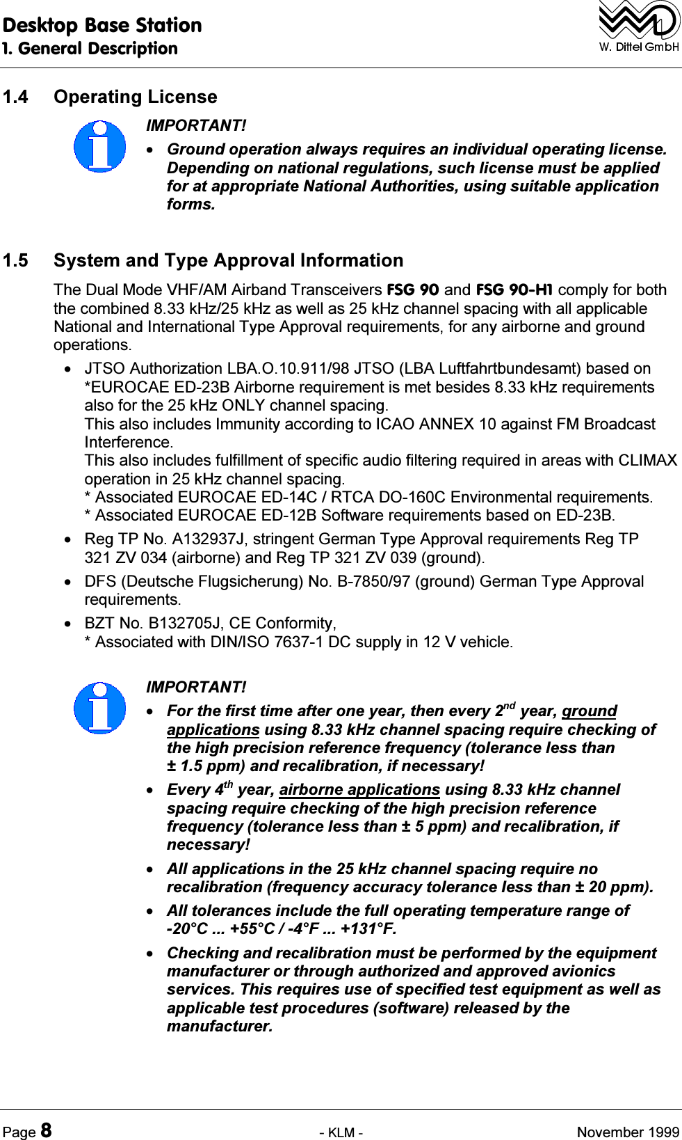 !['HVNWRS%DVH6WDWLRQ*HQHUDO'HVFULSWLRQ3DJH./0 1RYHPEHU 2SHUDWLQJ/LFHQVH,03257$17*URXQGRSHUDWLRQDOZD\VUHTXLUHVDQLQGLYLGXDORSHUDWLQJOLFHQVH'HSHQGLQJRQQDWLRQDOUHJXODWLRQVVXFKOLFHQVHPXVWEHDSSOLHGIRUDWDSSURSULDWH1DWLRQDO$XWKRULWLHVXVLQJVXLWDEOHDSSOLFDWLRQIRUPV 6\VWHPDQG7\SH$SSURYDO,QIRUPDWLRQ7KH'XDO0RGH9+)$0$LUEDQG7UDQVFHLYHUV)6*DQG)6*+FRPSO\IRUERWKWKHFRPELQHGN+]N+]DVZHOODVN+]FKDQQHOVSDFLQJZLWKDOODSSOLFDEOH1DWLRQDODQG,QWHUQDWLRQDO7\SH$SSURYDOUHTXLUHPHQWVIRUDQ\DLUERUQHDQGJURXQGRSHUDWLRQV -762$XWKRUL]DWLRQ/%$2-762/%$/XIWIDKUWEXQGHVDPWEDVHGRQ(852&$(('%$LUERUQHUHTXLUHPHQWLVPHWEHVLGHVN+]UHTXLUHPHQWVDOVRIRUWKHN+]21/<FKDQQHOVSDFLQJ7KLVDOVRLQFOXGHV,PPXQLW\DFFRUGLQJWR,&$2$11(;DJDLQVW)0%URDGFDVW,QWHUIHUHQFH7KLVDOVRLQFOXGHVIXOILOOPHQWRIVSHFLILFDXGLRILOWHULQJUHTXLUHGLQDUHDVZLWK&/,0$;RSHUDWLRQLQN+]FKDQQHOVSDFLQJ$VVRFLDWHG(852&$(('&57&$'2&(QYLURQPHQWDOUHTXLUHPHQWV$VVRFLDWHG(852&$(('%6RIWZDUHUHTXLUHPHQWVEDVHGRQ('% 5HJ731R$-VWULQJHQW*HUPDQ7\SH$SSURYDOUHTXLUHPHQWV5HJ73=9DLUERUQHDQG5HJ73=9JURXQG ')6'HXWVFKH)OXJVLFKHUXQJ1R%JURXQG*HUPDQ7\SH$SSURYDOUHTXLUHPHQWV %=71R%-&(&RQIRUPLW\$VVRFLDWHGZLWK',1,62'&VXSSO\LQ9YHKLFOH,03257$17)RUWKHILUVWWLPHDIWHURQH\HDUWKHQHYHU\ \HDUJURXQGDSSOLFDWLRQVXVLQJN+]FKDQQHOVSDFLQJUHTXLUHFKHFNLQJRIWKHKLJKSUHFLVLRQUHIHUHQFHIUHTXHQF\WROHUDQFHOHVVWKDQSSPDQGUHFDOLEUDWLRQLIQHFHVVDU\(YHU\ \HDUDLUERUQHDSSOLFDWLRQVXVLQJN+]FKDQQHOVSDFLQJUHTXLUHFKHFNLQJRIWKHKLJKSUHFLVLRQUHIHUHQFHIUHTXHQF\WROHUDQFHOHVVWKDQSSPDQGUHFDOLEUDWLRQLIQHFHVVDU\$OODSSOLFDWLRQVLQWKHN+]FKDQQHOVSDFLQJUHTXLUHQRUHFDOLEUDWLRQIUHTXHQF\DFFXUDF\WROHUDQFHOHVVWKDQSSP$OOWROHUDQFHVLQFOXGHWKHIXOORSHUDWLQJWHPSHUDWXUHUDQJHRI&&))&KHFNLQJDQGUHFDOLEUDWLRQPXVWEHSHUIRUPHGE\WKHHTXLSPHQWPDQXIDFWXUHURUWKURXJKDXWKRUL]HGDQGDSSURYHGDYLRQLFVVHUYLFHV7KLVUHTXLUHVXVHRIVSHFLILHGWHVWHTXLSPHQWDVZHOODVDSSOLFDEOHWHVWSURFHGXUHVVRIWZDUHUHOHDVHGE\WKHPDQXIDFWXUHU](https://usermanual.wiki/f-u-n-k-e-AVIONICS/FSG90.Desktop-case-with-front-module-part-one/User-Guide-169916-Page-8.png)