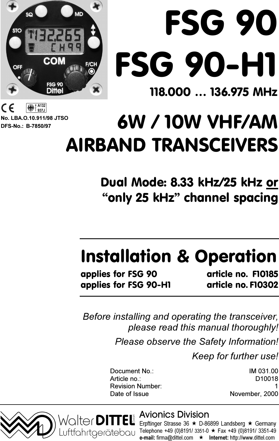 f u n k e AVIONICS FSG90 VHF/AM aviation analogue voice COMM transceiver User Manual