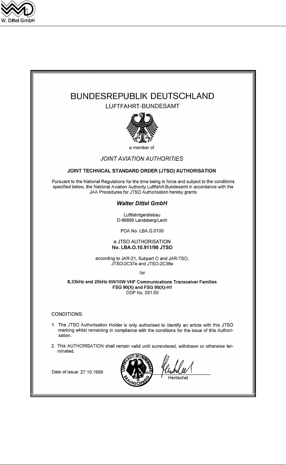 f u n k e AVIONICS FSG90 VHF/AM aviation analogue voice COMM transceiver User Manual Standard Maintenance REV 1