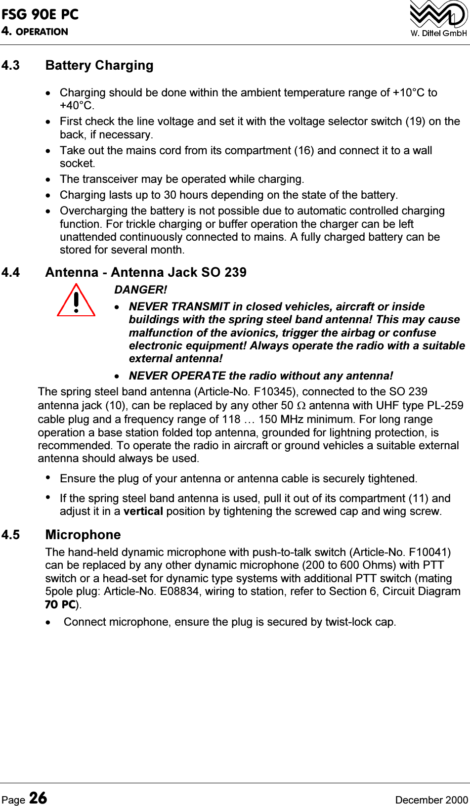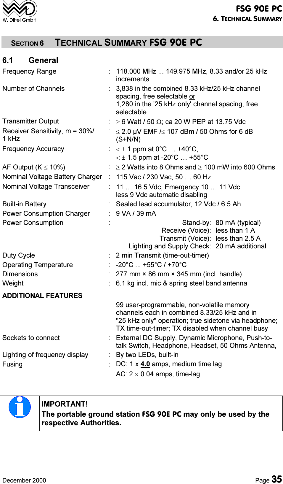 ![)6*(3&7(&+1,&$/6800$5<'HFHPEHU 3DJH6(&7,217(&+1,&$/6800$5<)6*(3& *HQHUDO)UHTXHQF\5DQJH 0+]0+]DQGRUN+]LQFUHPHQWV1XPEHURI&KDQQHOV LQWKHFRPELQHGN+]N+]FKDQQHOVSDFLQJIUHHVHOHFWDEOHRULQWKHN+]RQO\FKDQQHOVSDFLQJIUHHVHOHFWDEOH7UDQVPLWWHU2XWSXW :DWWWFD:3(3DW9GF5HFHLYHU6HQVLWLYLW\P N+]9(0)G%P2KPVIRUG%611)UHTXHQF\$FFXUDF\ <SSPDW&¡&<SSPDW&¡&$)2XWSXW. :DWWVLQWR2KPVDQGP:LQWR2KPV1RPLQDO9ROWDJH%DWWHU\&KDUJHU 9DF9DF¡+]1RPLQDO9ROWDJH7UDQVFHLYHU ¡9GF(PHUJHQF\¡9GFOHVV9GFDXWRPDWLFGLVDEOLQJ%XLOWLQ%DWWHU\ 6HDOHGOHDGDFFXPXODWRU9GF$K3RZHU&RQVXPSWLRQ&KDUJHU 9$P$3RZHU&RQVXPSWLRQ 6WDQGE\5HFHLYH9RLFH7UDQVPLW9RLFH/LJKWLQJDQG6XSSO\&KHFNP$W\SLFDOOHVVWKDQ$OHVVWKDQ$P$DGGLWLRQDO'XW\&\FOH PLQ7UDQVPLWWLPHRXWWLPHU2SHUDWLQJ7HPSHUDWXUH &&&'LPHQVLRQV PPîPPîPPLQFOKDQGOH:HLJKW NJLQFOPLFVSULQJVWHHOEDQGDQWHQQD$'',7,21$/)($785(6XVHUSURJUDPPDEOHQRQYRODWLOHPHPRU\FKDQQHOVHDFKLQFRPELQHGN+]DQGLQN+]RQO\RSHUDWLRQWUXHVLGHWRQHYLDKHDGSKRQH7;WLPHRXWWLPHU7;GLVDEOHGZKHQFKDQQHOEXV\6RFNHWVWRFRQQHFW ([WHUQDO'&6XSSO\'\QDPLF0LFURSKRQH3XVKWRWDON6ZLWFK+HDGSKRQH+HDGVHW2KPV$QWHQQD/LJKWLQJRIIUHTXHQF\GLVSOD\ %\WZR/('VEXLOWLQ)XVLQJ '&[DPSVPHGLXPWLPHODJ$&DPSVWLPHODJ,03257$177KHSRUWDEOHJURXQGVWDWLRQ)6*(3&PD\RQO\EHXVHGE\WKHUHVSHFWLYH$XWKRULWLHV](https://usermanual.wiki/f-u-n-k-e-AVIONICS/FSG90.FSG-90EPC-Portable-case-manual-part-two/User-Guide-169891-Page-11.png)