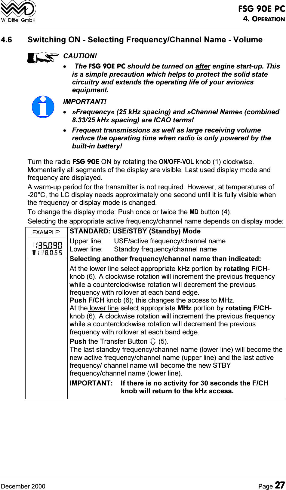 ![)6*(3&23(5$7,213DJH 'HFHPEHU(;$03/( &KDQQHO0RGH8SSHUOLQH 86(DFWLYHIUHTXHQF\FKDQQHOQDPH/RZHUOLQH &KDQQHOPHPRU\QXPEHUDVVRFLDWHG6HOHFWLQJDQRWKHUIUHTXHQF\FKDQQHOQDPHWKDQLQGLFDWHG,03257$17 7KHDSSURSULDWH86(IUHTXHQF\FKDQQHOQDPHPXVWEHVWRUHGDOUHDG\LQDFKDQQHOPHPRU\UHIHUWRSDUDJUDSK6725,1*$1(:)5(48(1&<&+$11(/1$0(6HOHFWDSSURSULDWHFKDQQHOPHPRU\QXPEHUWRJHWKHUZLWKWKHDVVRFLDWHGIUHTXHQF\FKDQQHOQDPHE\URWDWLQJWKH)&+NQRE(;$03/( 'LUHFWWXQH0RGH8SSHUOLQH 86(DFWLYHIUHTXHQF\FKDQQHOQDPH/RZHUOLQH EODQN6HOHFWLQJDQRWKHUIUHTXHQF\FKDQQHOQDPHWKDQLQGLFDWHG6HOHFWDSSURSULDWHN+]SRUWLRQE\URWDWLQJ)&+NQRE$FORFNZLVHURWDWLRQZLOOLQFUHPHQWWKHSUHYLRXVIUHTXHQF\ZKLOHDFRXQWHUFORFNZLVHURWDWLRQZLOOGHFUHPHQWWKHSUHYLRXVIUHTXHQF\ZLWKUROORYHUDWHDFKEDQGHGJH3XVK)&+NQREWKLVFKDQJHVWKHDFFHVVWR0+]6HOHFWDSSURSULDWH0+]SRUWLRQE\URWDWLQJ)&+NQRE$FORFNZLVHURWDWLRQZLOOLQFUHPHQWWKHSUHYLRXVIUHTXHQF\ZKLOHDFRXQWHUFORFNZLVHURWDWLRQZLOOGHFUHPHQWWKHSUHYLRXVIUHTXHQF\ZLWKUROORYHUDWHDFKEDQGHGJH7KHVHWWLQJLVWKHQHZDFWLYHIUHTXHQF\FKDQQHOQDPH,03257$17 ,IWKHUHLVQRDFWLYLW\IRUVHFRQGVWKH)&+NQREZLOOUHWXUQWRWKHN+]DFFHVV5RWDWH212))92/NQREFORFNZLVHDERXWKDOIZD\&RQWLQXHZLWKHLWKHU5HFHLYHRU7UDQVPLW2SHUDWLRQ](https://usermanual.wiki/f-u-n-k-e-AVIONICS/FSG90.FSG-90EPC-Portable-case-manual-part-two/User-Guide-169891-Page-4.png)