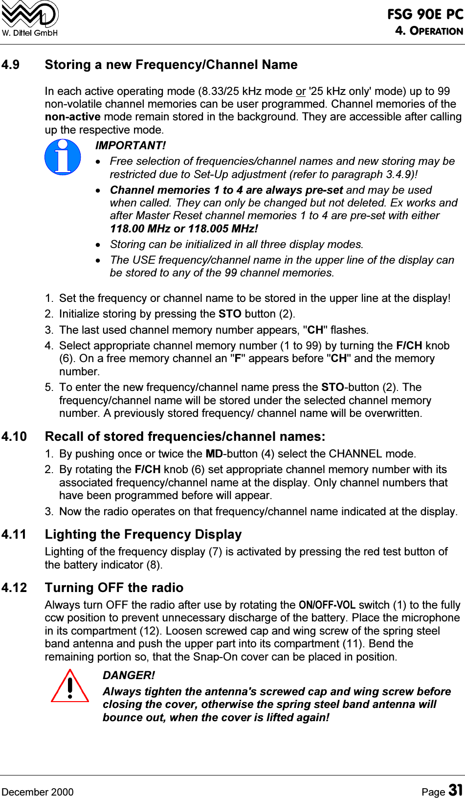 ![)6*(3&23(5$7,21'HFHPEHU 3DJH 6WRULQJDQHZ)UHTXHQF\&KDQQHO1DPH,QHDFKDFWLYHRSHUDWLQJPRGHN+]PRGHRUN+]RQO\PRGHXSWRQRQYRODWLOHFKDQQHOPHPRULHVFDQEHXVHUSURJUDPPHG&KDQQHOPHPRULHVRIWKHQRQDFWLYHPRGHUHPDLQVWRUHGLQWKHEDFNJURXQG7KH\DUHDFFHVVLEOHDIWHUFDOOLQJXSWKHUHVSHFWLYHPRGH,03257$17)UHHVHOHFWLRQRIIUHTXHQFLHVFKDQQHOQDPHVDQGQHZVWRULQJPD\EHUHVWULFWHGGXHWR6HW8SDGMXVWPHQWUHIHUWRSDUDJUDSK&KDQQHOPHPRULHVWRDUHDOZD\VSUHVHWDQGPD\EHXVHGZKHQFDOOHG7KH\FDQRQO\EHFKDQJHGEXWQRWGHOHWHG([ZRUNVDQGDIWHU0DVWHU5HVHWFKDQQHOPHPRULHVWRDUHSUHVHWZLWKHLWKHU0+]RU0+]6WRULQJFDQEHLQLWLDOL]HGLQDOOWKUHHGLVSOD\PRGHV7KH86(IUHTXHQF\FKDQQHOQDPHLQWKHXSSHUOLQHRIWKHGLVSOD\FDQEHVWRUHGWRDQ\RIWKHFKDQQHOPHPRULHV 6HWWKHIUHTXHQF\RUFKDQQHOQDPHWREHVWRUHGLQWKHXSSHUOLQHDWWKHGLVSOD\ ,QLWLDOL]HVWRULQJE\SUHVVLQJWKH672EXWWRQ 7KHODVWXVHGFKDQQHOPHPRU\QXPEHUDSSHDUV&+IODVKHV 6HOHFWDSSURSULDWHFKDQQHOPHPRU\QXPEHUWRE\WXUQLQJWKH)&+NQRE2QDIUHHPHPRU\FKDQQHODQ)DSSHDUVEHIRUH&+DQGWKHPHPRU\QXPEHU 7RHQWHUWKHQHZIUHTXHQF\FKDQQHOQDPHSUHVVWKH672EXWWRQ7KHIUHTXHQF\FKDQQHOQDPHZLOOEHVWRUHGXQGHUWKHVHOHFWHGFKDQQHOPHPRU\QXPEHU$SUHYLRXVO\VWRUHGIUHTXHQF\FKDQQHOQDPHZLOOEHRYHUZULWWHQ 5HFDOORIVWRUHGIUHTXHQFLHVFKDQQHOQDPHV %\SXVKLQJRQFHRUWZLFHWKH0'EXWWRQVHOHFWWKH&+$11(/PRGH %\URWDWLQJWKH)&+NQREVHWDSSURSULDWHFKDQQHOPHPRU\QXPEHUZLWKLWVDVVRFLDWHGIUHTXHQF\FKDQQHOQDPHDWWKHGLVSOD\2QO\FKDQQHOQXPEHUVWKDWKDYHEHHQSURJUDPPHGEHIRUHZLOODSSHDU 1RZWKHUDGLRRSHUDWHVRQWKDWIUHTXHQF\FKDQQHOQDPHLQGLFDWHGDWWKHGLVSOD\ /LJKWLQJWKH)UHTXHQF\'LVSOD\/LJKWLQJRIWKHIUHTXHQF\GLVSOD\LVDFWLYDWHGE\SUHVVLQJWKHUHGWHVWEXWWRQRIWKHEDWWHU\LQGLFDWRU 7XUQLQJ2))WKHUDGLR$OZD\VWXUQ2))WKHUDGLRDIWHUXVHE\URWDWLQJWKH212))92/VZLWFKWRWKHIXOO\FFZSRVLWLRQWRSUHYHQWXQQHFHVVDU\GLVFKDUJHRIWKHEDWWHU\3ODFHWKHPLFURSKRQHLQLWVFRPSDUWPHQW/RRVHQVFUHZHGFDSDQGZLQJVFUHZRIWKHVSULQJVWHHOEDQGDQWHQQDDQGSXVKWKHXSSHUSDUWLQWRLWVFRPSDUWPHQW%HQGWKHUHPDLQLQJSRUWLRQVRWKDWWKH6QDS2QFRYHUFDQEHSODFHGLQSRVLWLRQ'$1*(5$OZD\VWLJKWHQWKHDQWHQQDVVFUHZHGFDSDQGZLQJVFUHZEHIRUHFORVLQJWKHFRYHURWKHUZLVHWKHVSULQJVWHHOEDQGDQWHQQDZLOOERXQFHRXWZKHQWKHFRYHULVOLIWHGDJDLQ](https://usermanual.wiki/f-u-n-k-e-AVIONICS/FSG90.FSG-90EPC-Portable-case-manual-part-two/User-Guide-169891-Page-7.png)