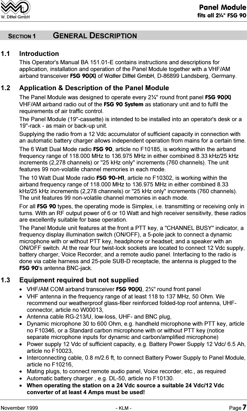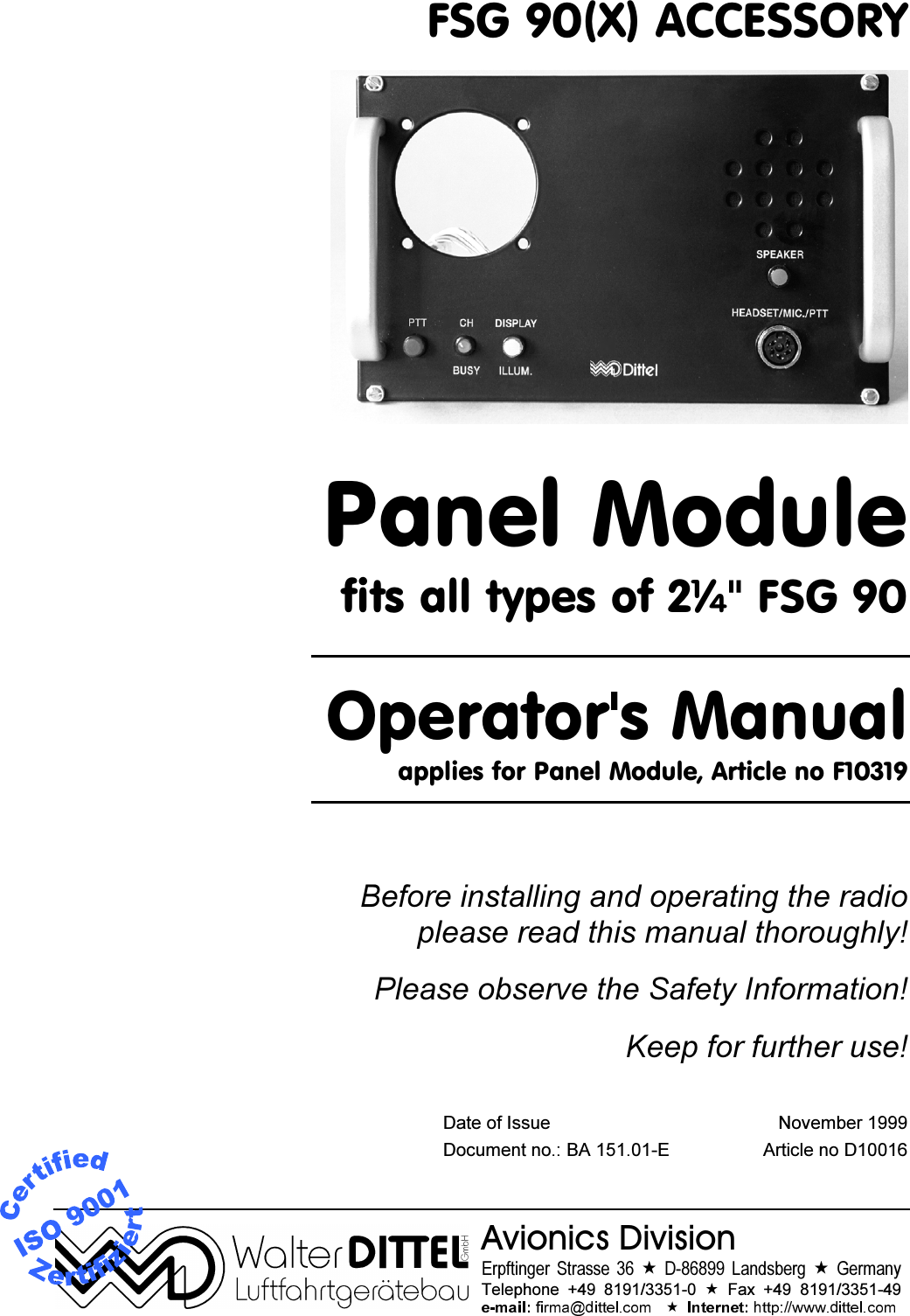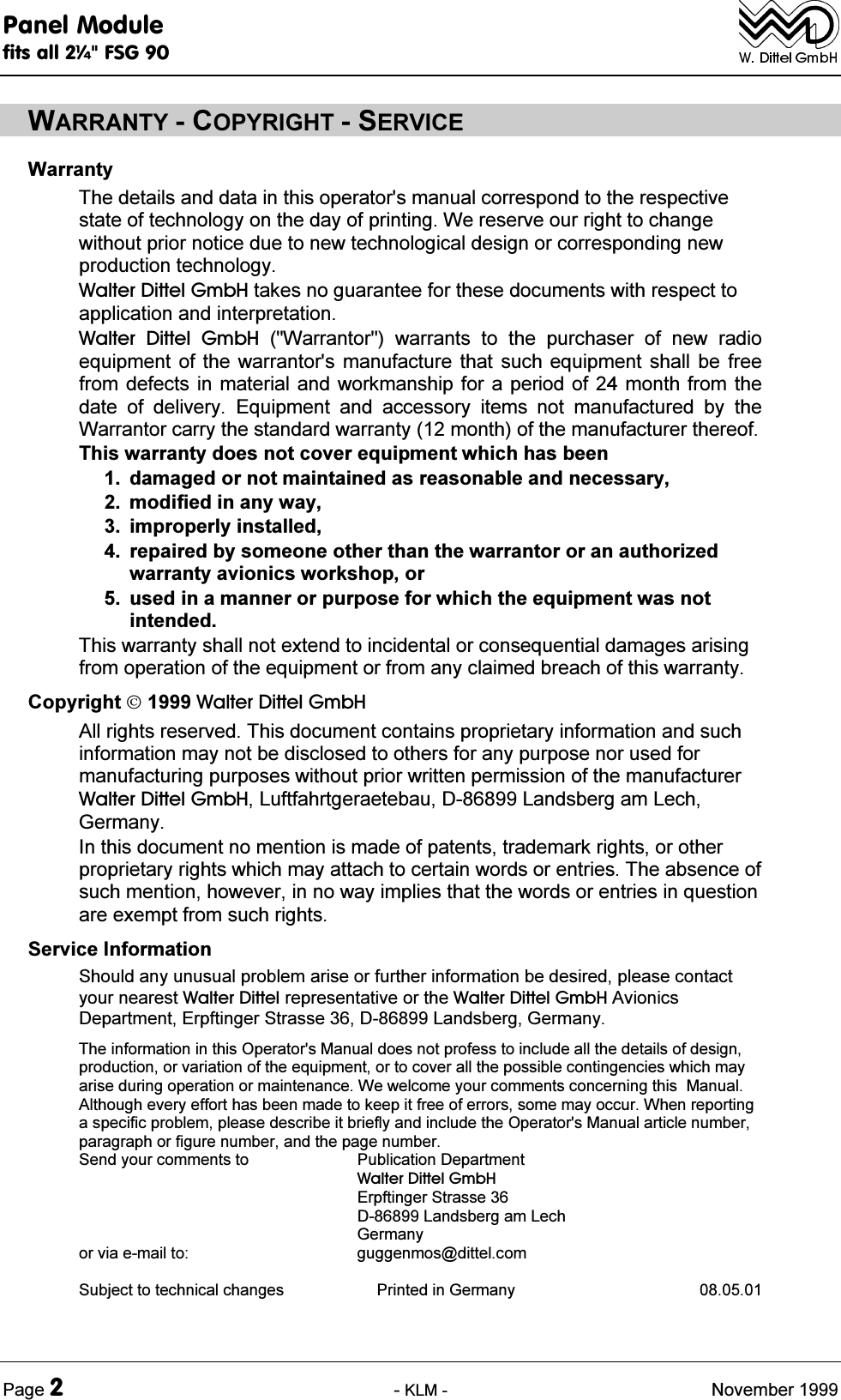 ![3DQHO0RGXOHILWVDOOõ)6*3DJH./0 1RYHPEHU:$55$17<&23<5,*+76(59,&(:DUUDQW\7KHGHWDLOVDQGGDWDLQWKLVRSHUDWRUVPDQXDOFRUUHVSRQGWRWKHUHVSHFWLYHVWDWHRIWHFKQRORJ\RQWKHGD\RISULQWLQJ:HUHVHUYHRXUULJKWWRFKDQJHZLWKRXWSULRUQRWLFHGXHWRQHZWHFKQRORJLFDOGHVLJQRUFRUUHVSRQGLQJQHZSURGXFWLRQWHFKQRORJ\:DOWHU'LWWHO*PE+WDNHVQRJXDUDQWHHIRUWKHVHGRFXPHQWVZLWKUHVSHFWWRDSSOLFDWLRQDQGLQWHUSUHWDWLRQ:DOWHU 'LWWHO *PE+ :DUUDQWRU ZDUUDQWV WR WKH SXUFKDVHU RI QHZ UDGLRHTXLSPHQW RIWKH ZDUUDQWRUV PDQXIDFWXUH WKDW VXFK HTXLSPHQWVKDOO EH IUHHIURPGHIHFWVLQPDWHULDODQGZRUNPDQVKLSIRUDSHULRGRIPRQWKIURPWKHGDWH RI GHOLYHU\ (TXLSPHQW DQG DFFHVVRU\ LWHPV QRW PDQXIDFWXUHG E\ WKH:DUUDQWRUFDUU\WKHVWDQGDUGZDUUDQW\PRQWKRIWKHPDQXIDFWXUHUWKHUHRI7KLVZDUUDQW\GRHVQRWFRYHUHTXLSPHQWZKLFKKDVEHHQ GDPDJHGRUQRWPDLQWDLQHGDVUHDVRQDEOHDQGQHFHVVDU\ PRGLILHGLQDQ\ZD\ LPSURSHUO\LQVWDOOHG UHSDLUHGE\VRPHRQHRWKHUWKDQWKHZDUUDQWRURUDQDXWKRUL]HGZDUUDQW\DYLRQLFVZRUNVKRSRU XVHGLQDPDQQHURUSXUSRVHIRUZKLFKWKHHTXLSPHQWZDVQRWLQWHQGHG7KLVZDUUDQW\VKDOOQRWH[WHQGWRLQFLGHQWDORUFRQVHTXHQWLDOGDPDJHVDULVLQJIURPRSHUDWLRQRIWKHHTXLSPHQWRUIURPDQ\FODLPHGEUHDFKRIWKLVZDUUDQW\&RS\ULJKW¸:DOWHU'LWWHO*PE+$OOULJKWVUHVHUYHG7KLVGRFXPHQWFRQWDLQVSURSULHWDU\LQIRUPDWLRQDQGVXFKLQIRUPDWLRQPD\QRWEHGLVFORVHGWRRWKHUVIRUDQ\SXUSRVHQRUXVHGIRUPDQXIDFWXULQJSXUSRVHVZLWKRXWSULRUZULWWHQSHUPLVVLRQRIWKHPDQXIDFWXUHU:DOWHU'LWWHO*PE+/XIWIDKUWJHUDHWHEDX'/DQGVEHUJDP/HFK*HUPDQ\,QWKLVGRFXPHQWQRPHQWLRQLVPDGHRISDWHQWVWUDGHPDUNULJKWVRURWKHUSURSULHWDU\ULJKWVZKLFKPD\DWWDFKWRFHUWDLQZRUGVRUHQWULHV7KHDEVHQFHRIVXFKPHQWLRQKRZHYHULQQRZD\LPSOLHVWKDWWKHZRUGVRUHQWULHVLQTXHVWLRQDUHH[HPSWIURPVXFKULJKWV6HUYLFH,QIRUPDWLRQ6KRXOGDQ\XQXVXDOSUREOHPDULVHRUIXUWKHULQIRUPDWLRQEHGHVLUHGSOHDVHFRQWDFW\RXUQHDUHVW:DOWHU'LWWHOUHSUHVHQWDWLYHRUWKH:DOWHU'LWWHO*PE+$YLRQLFV'HSDUWPHQW(USIWLQJHU6WUDVVH'/DQGVEHUJ*HUPDQ\7KHLQIRUPDWLRQLQWKLV2SHUDWRUV0DQXDOGRHVQRWSURIHVVWRLQFOXGHDOOWKHGHWDLOVRIGHVLJQSURGXFWLRQRUYDULDWLRQRIWKHHTXLSPHQWRUWRFRYHUDOOWKHSRVVLEOHFRQWLQJHQFLHVZKLFKPD\DULVHGXULQJRSHUDWLRQRUPDLQWHQDQFH:HZHOFRPH\RXUFRPPHQWVFRQFHUQLQJWKLV0DQXDO$OWKRXJKHYHU\HIIRUWKDVEHHQPDGHWRNHHSLWIUHHRIHUURUVVRPHPD\RFFXU:KHQUHSRUWLQJDVSHFLILFSUREOHPSOHDVHGHVFULEHLWEULHIO\DQGLQFOXGHWKH2SHUDWRUV0DQXDODUWLFOHQXPEHUSDUDJUDSKRUILJXUHQXPEHUDQGWKHSDJHQXPEHU6HQG\RXUFRPPHQWVWR 3XEOLFDWLRQ'HSDUWPHQW:DOWHU'LWWHO*PE+(USIWLQJHU6WUDVVH'/DQGVEHUJDP/HFK*HUPDQ\RUYLDHPDLOWR JXJJHQPRV#GLWWHOFRP6XEMHFWWRWHFKQLFDOFKDQJHV 3ULQWHGLQ*HUPDQ\ ](https://usermanual.wiki/f-u-n-k-e-AVIONICS/FSG90.Frontpanel-Module-without-case-part-one/User-Guide-169914-Page-2.png)
