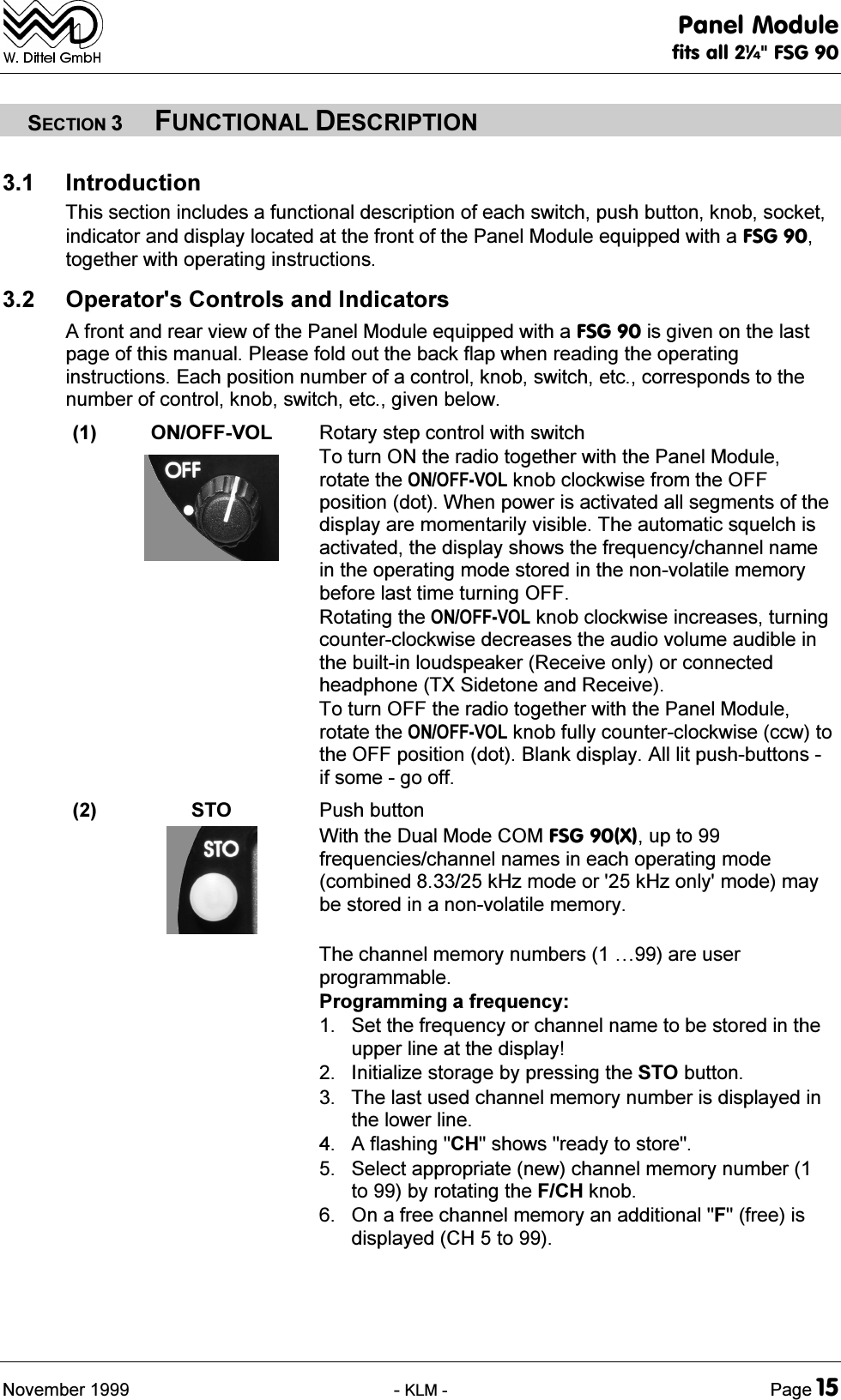 ![3DQHO0RGXOHILWVDOOõ)6*1RYHPEHU ./0 3DJH6(&7,21)81&7,21$/'(6&5,37,21 ,QWURGXFWLRQ7KLVVHFWLRQLQFOXGHVDIXQFWLRQDOGHVFULSWLRQRIHDFKVZLWFKSXVKEXWWRQNQREVRFNHWLQGLFDWRUDQGGLVSOD\ORFDWHGDWWKHIURQWRIWKH3DQHO0RGXOHHTXLSSHGZLWKD)6*WRJHWKHUZLWKRSHUDWLQJLQVWUXFWLRQV 2SHUDWRUV&RQWUROVDQG,QGLFDWRUV$IURQWDQGUHDUYLHZRIWKH3DQHO0RGXOHHTXLSSHGZLWKD)6*LVJLYHQRQWKHODVWSDJHRIWKLVPDQXDO3OHDVHIROGRXWWKHEDFNIODSZKHQUHDGLQJWKHRSHUDWLQJLQVWUXFWLRQV(DFKSRVLWLRQQXPEHURIDFRQWURONQREVZLWFKHWFFRUUHVSRQGVWRWKHQXPEHURIFRQWURONQREVZLWFKHWFJLYHQEHORZ 212))92/ 5RWDU\VWHSFRQWUROZLWKVZLWFK7RWXUQ21WKHUDGLRWRJHWKHUZLWKWKH3DQHO0RGXOHURWDWHWKH212))92/NQREFORFNZLVHIURPWKH2))SRVLWLRQGRW:KHQSRZHULVDFWLYDWHGDOOVHJPHQWVRIWKHGLVSOD\DUHPRPHQWDULO\YLVLEOH7KHDXWRPDWLFVTXHOFKLVDFWLYDWHGWKHGLVSOD\VKRZVWKHIUHTXHQF\FKDQQHOQDPHLQWKHRSHUDWLQJPRGHVWRUHGLQWKHQRQYRODWLOHPHPRU\EHIRUHODVWWLPHWXUQLQJ2))5RWDWLQJWKH212))92/NQREFORFNZLVHLQFUHDVHVWXUQLQJFRXQWHUFORFNZLVHGHFUHDVHVWKHDXGLRYROXPHDXGLEOHLQWKHEXLOWLQORXGVSHDNHU5HFHLYHRQO\RUFRQQHFWHGKHDGSKRQH7;6LGHWRQHDQG5HFHLYH7RWXUQ2))WKHUDGLRWRJHWKHUZLWKWKH3DQHO0RGXOHURWDWHWKH212))92/NQREIXOO\FRXQWHUFORFNZLVHFFZWRWKH2))SRVLWLRQGRW%ODQNGLVSOD\$OOOLWSXVKEXWWRQVLIVRPHJRRII 672 3XVKEXWWRQ:LWKWKH'XDO0RGH&20)6*;XSWRIUHTXHQFLHVFKDQQHOQDPHVLQHDFKRSHUDWLQJPRGHFRPELQHGN+]PRGHRUN+]RQO\PRGHPD\EHVWRUHGLQDQRQYRODWLOHPHPRU\7KHFKDQQHOPHPRU\QXPEHUV¡DUHXVHUSURJUDPPDEOH3URJUDPPLQJDIUHTXHQF\ 6HWWKHIUHTXHQF\RUFKDQQHOQDPHWREHVWRUHGLQWKHXSSHUOLQHDWWKHGLVSOD\ ,QLWLDOL]HVWRUDJHE\SUHVVLQJWKH672EXWWRQ 7KHODVWXVHGFKDQQHOPHPRU\QXPEHULVGLVSOD\HGLQWKHORZHUOLQH $IODVKLQJ&+VKRZVUHDG\WRVWRUH 6HOHFWDSSURSULDWHQHZFKDQQHOPHPRU\QXPEHUWRE\URWDWLQJWKH)&+NQRE 2QDIUHHFKDQQHOPHPRU\DQDGGLWLRQDO)IUHHLVGLVSOD\HG&+WR](https://usermanual.wiki/f-u-n-k-e-AVIONICS/FSG90.Frontpanel-Module-without-case-part-one/User-Guide-169914-Page-15.png)