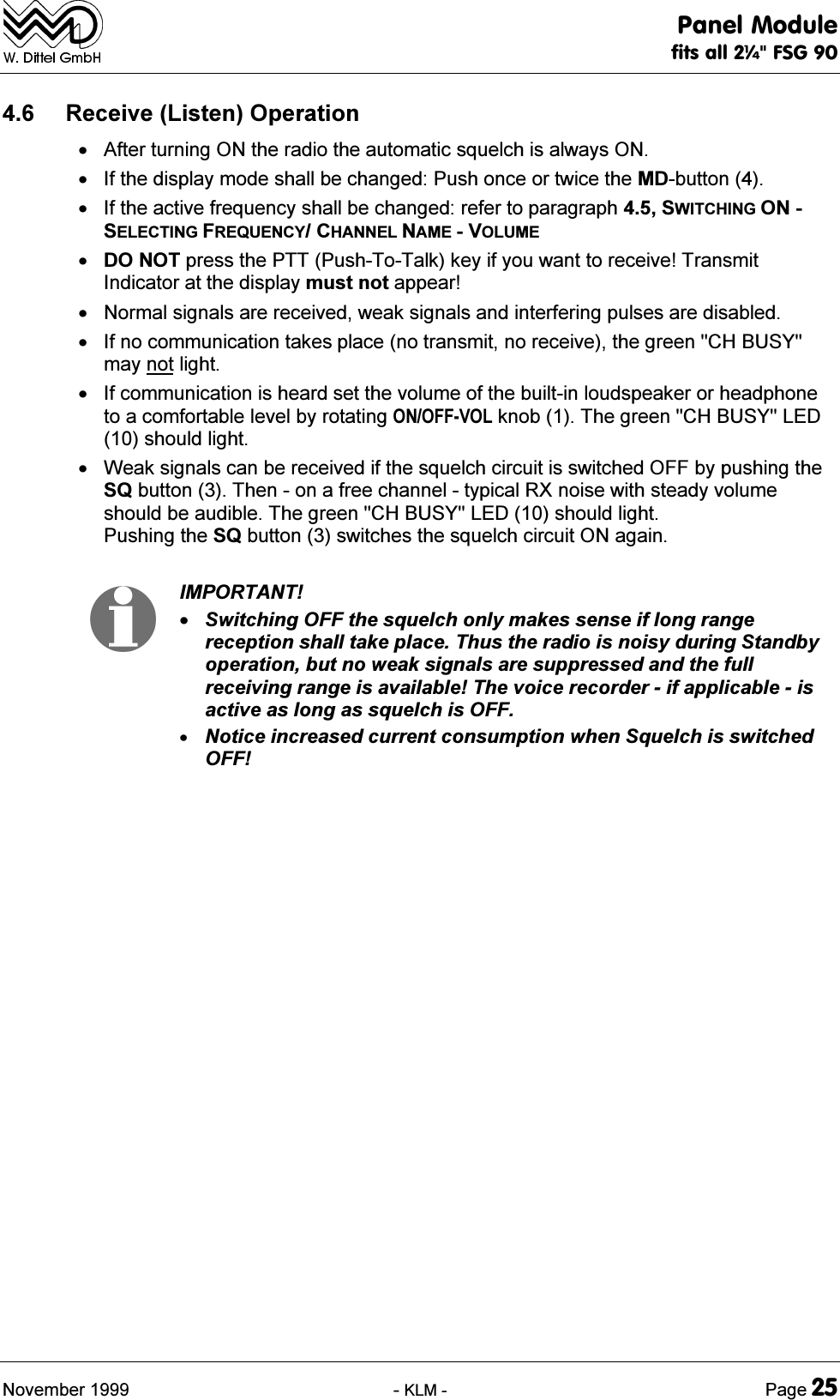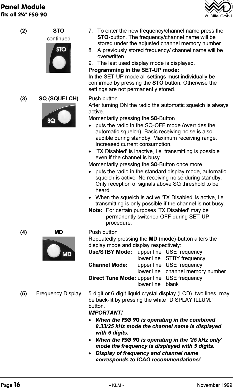 ![3DQHO0RGXOHILWVDOOõ)6*3DJH ./0 1RYHPEHU 672FRQWLQXHG 7RHQWHUWKHQHZIUHTXHQF\FKDQQHOQDPHSUHVVWKH672EXWWRQ7KHIUHTXHQF\FKDQQHOQDPHZLOOEHVWRUHGXQGHUWKHDGMXVWHGFKDQQHOPHPRU\QXPEHU $SUHYLRXVO\VWRUHGIUHTXHQF\FKDQQHOQDPHZLOOEHRYHUZULWWHQ 7KHODVWXVHGGLVSOD\PRGHLVGLVSOD\HG3URJUDPPLQJLQWKH6(783PRGH,QWKH6(783PRGHDOOVHWWLQJVPXVWLQGLYLGXDOO\EHFRQILUPHGE\SUHVVLQJWKH672EXWWRQ2WKHUZLVHWKHVHWWLQJVDUHQRWSHUPDQHQWO\VWRUHG 64648(/&+ 3XVKEXWWRQ$IWHUWXUQLQJ21WKHUDGLRWKHDXWRPDWLFVTXHOFKLVDOZD\VDFWLYH0RPHQWDULO\SUHVVLQJWKH64%XWWRQ SXWVWKHUDGLRLQWKH642))PRGHRYHUULGHVWKHDXWRPDWLFVTXHOFK%DVLFUHFHLYLQJQRLVHLVDOVRDXGLEOHGXULQJVWDQGE\0D[LPXPUHFHLYLQJUDQJH,QFUHDVHGFXUUHQWFRQVXPSWLRQ 7;'LVDEOHGLVLQDFWLYHLHWUDQVPLWWLQJLVSRVVLEOHHYHQLIWKHFKDQQHOLVEXV\0RPHQWDULO\SUHVVLQJWKH64%XWWRQRQFHPRUH SXWVWKHUDGLRLQWKHVWDQGDUGGLVSOD\PRGHDXWRPDWLFVTXHOFKLVDFWLYH1RUHFHLYLQJQRLVHGXULQJVWDQGE\2QO\UHFHSWLRQRIVLJQDOVDERYH64WKUHVKROGWREHKHDUG :KHQWKHVTXHOFKLVDFWLYH7;'LVDEOHGLVDFWLYHLHWUDQVPLWWLQJLVRQO\SRVVLEOHLIWKHFKDQQHOLVQRWEXV\1RWH )RUFHUWDLQSXUSRVHV7;'LVDEOHGPD\EHSHUPDQHQWO\VZLWFKHG2))GXULQJ6(783SURFHGXUH 0' 3XVKEXWWRQ5HSHDWHGO\SUHVVLQJWKH0'PRGHEXWWRQDOWHUVWKHGLVSOD\PRGHDQGGLVSOD\UHVSHFWLYHO\8VH67%<0RGH XSSHUOLQH 86(IUHTXHQF\ORZHUOLQH 67%<IUHTXHQF\&KDQQHO0RGH XSSHUOLQH 86(IUHTXHQF\ORZHUOLQH FKDQQHOPHPRU\QXPEHU'LUHFW7XQH0RGH XSSHUOLQH 86(IUHTXHQF\ORZHUOLQH EODQN )UHTXHQF\'LVSOD\ GLJLWRUGLJLWOLTXLGFU\VWDOGLVSOD\/&'WZROLQHVPD\EHEDFNOLWE\SUHVVLQJWKHZKLWH',63/$<,//80EXWWRQ,03257$17:KHQWKH)6*LVRSHUDWLQJLQWKHFRPELQHGN+]PRGHWKHFKDQQHOQDPHLVGLVSOD\HGZLWKGLJLWV:KHQWKH)6*LVRSHUDWLQJLQWKHN+]RQO\PRGHWKHIUHTXHQF\LVGLVSOD\HGZLWKGLJLWV'LVSOD\RIIUHTXHQF\DQGFKDQQHOQDPHFRUUHVSRQGVWR,&$2UHFRPPHQGDWLRQV](https://usermanual.wiki/f-u-n-k-e-AVIONICS/FSG90.Frontpanel-Module-without-case-part-one/User-Guide-169914-Page-16.png)