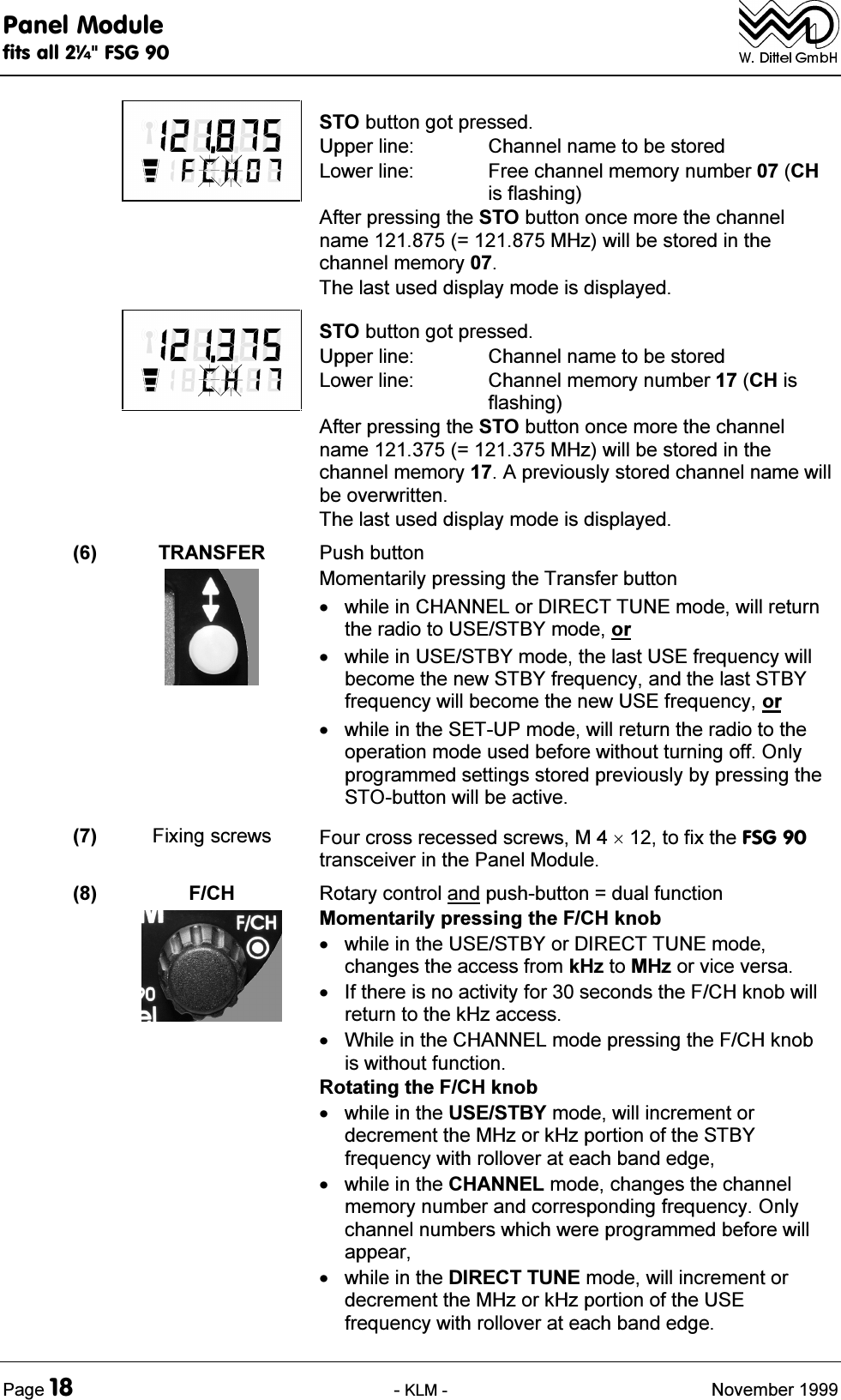 ![3DQHO0RGXOHILWVDOOõ)6*3DJH ./0 1RYHPEHU672EXWWRQJRWSUHVVHG8SSHUOLQH &KDQQHOQDPHWREHVWRUHG/RZHUOLQH )UHHFKDQQHOPHPRU\QXPEHU&+LVIODVKLQJ$IWHUSUHVVLQJWKH672EXWWRQRQFHPRUHWKHFKDQQHOQDPH 0+]ZLOOEHVWRUHGLQWKHFKDQQHOPHPRU\7KHODVWXVHGGLVSOD\PRGHLVGLVSOD\HG672EXWWRQJRWSUHVVHG8SSHUOLQH &KDQQHOQDPHWREHVWRUHG/RZHUOLQH &KDQQHOPHPRU\QXPEHU&+LVIODVKLQJ$IWHUSUHVVLQJWKH672EXWWRQRQFHPRUHWKHFKDQQHOQDPH 0+]ZLOOEHVWRUHGLQWKHFKDQQHOPHPRU\$SUHYLRXVO\VWRUHGFKDQQHOQDPHZLOOEHRYHUZULWWHQ7KHODVWXVHGGLVSOD\PRGHLVGLVSOD\HG 75$16)(5 3XVKEXWWRQ0RPHQWDULO\SUHVVLQJWKH7UDQVIHUEXWWRQ ZKLOHLQ&+$11(/RU',5(&7781(PRGHZLOOUHWXUQWKHUDGLRWR86(67%<PRGHRU ZKLOHLQ86(67%<PRGHWKHODVW86(IUHTXHQF\ZLOOEHFRPHWKHQHZ67%<IUHTXHQF\DQGWKHODVW67%<IUHTXHQF\ZLOOEHFRPHWKHQHZ86(IUHTXHQF\RU ZKLOHLQWKH6(783PRGHZLOOUHWXUQWKHUDGLRWRWKHRSHUDWLRQPRGHXVHGEHIRUHZLWKRXWWXUQLQJRII2QO\SURJUDPPHGVHWWLQJVVWRUHGSUHYLRXVO\E\SUHVVLQJWKH672EXWWRQZLOOEHDFWLYH )L[LQJVFUHZV )RXUFURVVUHFHVVHGVFUHZV0WRIL[WKH)6*WUDQVFHLYHULQWKH3DQHO0RGXOH )&+ 5RWDU\FRQWURODQGSXVKEXWWRQ GXDOIXQFWLRQ0RPHQWDULO\SUHVVLQJWKH)&+NQRE ZKLOHLQWKH86(67%<RU',5(&7781(PRGHFKDQJHVWKHDFFHVVIURPN+]WR0+]RUYLFHYHUVD ,IWKHUHLVQRDFWLYLW\IRUVHFRQGVWKH)&+NQREZLOOUHWXUQWRWKHN+]DFFHVV :KLOHLQWKH&+$11(/PRGHSUHVVLQJWKH)&+NQRELVZLWKRXWIXQFWLRQ5RWDWLQJWKH)&+NQRE ZKLOHLQWKH86(67%<PRGHZLOOLQFUHPHQWRUGHFUHPHQWWKH0+]RUN+]SRUWLRQRIWKH67%<IUHTXHQF\ZLWKUROORYHUDWHDFKEDQGHGJH ZKLOHLQWKH&+$11(/PRGHFKDQJHVWKHFKDQQHOPHPRU\QXPEHUDQGFRUUHVSRQGLQJIUHTXHQF\2QO\FKDQQHOQXPEHUVZKLFKZHUHSURJUDPPHGEHIRUHZLOODSSHDU ZKLOHLQWKH',5(&7781(PRGHZLOOLQFUHPHQWRUGHFUHPHQWWKH0+]RUN+]SRUWLRQRIWKH86(IUHTXHQF\ZLWKUROORYHUDWHDFKEDQGHGJH](https://usermanual.wiki/f-u-n-k-e-AVIONICS/FSG90.Frontpanel-Module-without-case-part-one/User-Guide-169914-Page-18.png)