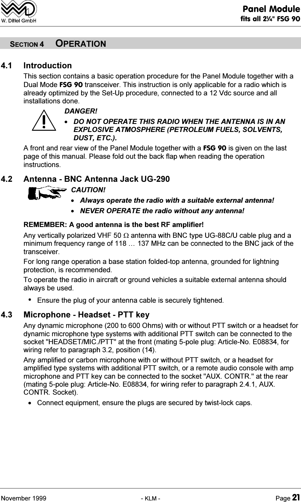 ![3DQHO0RGXOHILWVDOOõ)6*1RYHPEHU ./0 3DJH6(&7,2123(5$7,21 ,QWURGXFWLRQ7KLVVHFWLRQFRQWDLQVDEDVLFRSHUDWLRQSURFHGXUHIRUWKH3DQHO0RGXOHWRJHWKHUZLWKD'XDO0RGH)6*WUDQVFHLYHU7KLVLQVWUXFWLRQLVRQO\DSSOLFDEOHIRUDUDGLRZKLFKLVDOUHDG\RSWLPL]HGE\WKH6HW8SSURFHGXUHFRQQHFWHGWRD9GFVRXUFHDQGDOOLQVWDOODWLRQVGRQH'$1*(5'212723(5$7(7+,65$',2:+(17+($17(11$,6,1$1(;3/26,9($70263+(5(3(752/(80)8(/662/9(176'867(7&$IURQWDQGUHDUYLHZRIWKH3DQHO0RGXOHWRJHWKHUZLWKD)6*LVJLYHQRQWKHODVWSDJHRIWKLVPDQXDO3OHDVHIROGRXWWKHEDFNIODSZKHQUHDGLQJWKHRSHUDWLRQLQVWUXFWLRQV $QWHQQD%1&$QWHQQD-DFN8*&$87,21$OZD\VRSHUDWHWKHUDGLRZLWKDVXLWDEOHH[WHUQDODQWHQQD1(9(523(5$7(WKHUDGLRZLWKRXWDQ\DQWHQQD5(0(0%(5$JRRGDQWHQQDLVWKHEHVW5)DPSOLILHU$Q\YHUWLFDOO\SRODUL]HG9+)WDQWHQQDZLWK%1&W\SH8*&8FDEOHSOXJDQGDPLQLPXPIUHTXHQF\UDQJHRI«0+]FDQEHFRQQHFWHGWRWKH%1&MDFNRIWKHWUDQVFHLYHU)RUORQJUDQJHRSHUDWLRQDEDVHVWDWLRQIROGHGWRSDQWHQQDJURXQGHGIRUOLJKWQLQJSURWHFWLRQLVUHFRPPHQGHG7RRSHUDWHWKHUDGLRLQDLUFUDIWRUJURXQGYHKLFOHVDVXLWDEOHH[WHUQDODQWHQQDVKRXOGDOZD\VEHXVHG(QVXUHWKHSOXJRI\RXUDQWHQQDFDEOHLVVHFXUHO\WLJKWHQHG 0LFURSKRQH+HDGVHW377NH\$Q\G\QDPLFPLFURSKRQHWR2KPVZLWKRUZLWKRXW377VZLWFKRUDKHDGVHWIRUG\QDPLFPLFURSKRQHW\SHV\VWHPVZLWKDGGLWLRQDO377VZLWFKFDQEHFRQQHFWHGWRWKHVRFNHW+($'6(70,&377DWWKHIURQWPDWLQJSROHSOXJ$UWLFOH1R(IRUZLULQJUHIHUWRSDUDJUDSKSRVLWLRQ$Q\DPSOLILHGRUFDUERQPLFURSKRQHZLWKRUZLWKRXW377VZLWFKRUDKHDGVHWIRUDPSOLILHGW\SHV\VWHPVZLWKDGGLWLRQDO377VZLWFKRUDUHPRWHDXGLRFRQVROHZLWKDPSPLFURSKRQHDQG377NH\FDQEHFRQQHFWHGWRWKHVRFNHW$8;&2175DWWKHUHDUPDWLQJSROHSOXJ$UWLFOH1R(IRUZLULQJUHIHUWRSDUDJUDSK$8;&21756RFNHW &RQQHFWHTXLSPHQWHQVXUHWKHSOXJVDUHVHFXUHGE\WZLVWORFNFDSV](https://usermanual.wiki/f-u-n-k-e-AVIONICS/FSG90.Frontpanel-Module-without-case-part-one/User-Guide-169914-Page-21.png)