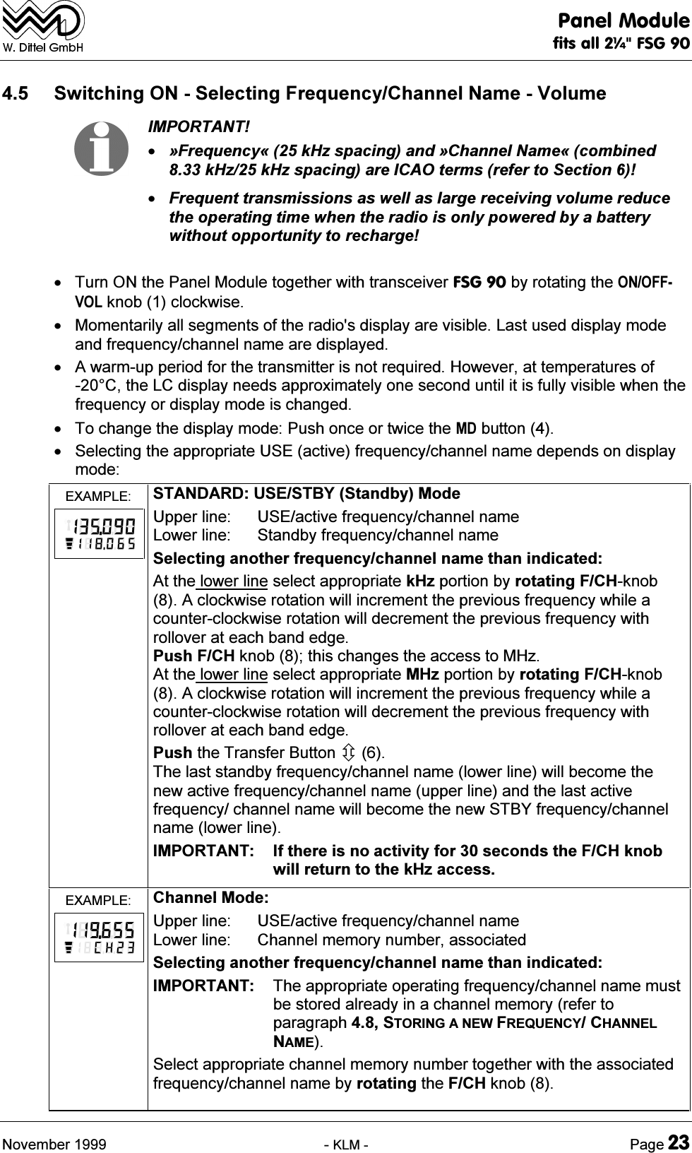 ![3DQHO0RGXOHILWVDOOõ)6*1RYHPEHU ./0 3DJH 6ZLWFKLQJ216HOHFWLQJ)UHTXHQF\&KDQQHO1DPH9ROXPH,03257$17ª)UHTXHQF\©N+]VSDFLQJDQGª&KDQQHO1DPH©FRPELQHGN+]N+]VSDFLQJDUH,&$2WHUPVUHIHUWR6HFWLRQ)UHTXHQWWUDQVPLVVLRQVDVZHOODVODUJHUHFHLYLQJYROXPHUHGXFHWKHRSHUDWLQJWLPHZKHQWKHUDGLRLVRQO\SRZHUHGE\DEDWWHU\ZLWKRXWRSSRUWXQLW\WRUHFKDUJH 7XUQ21WKH3DQHO0RGXOHWRJHWKHUZLWKWUDQVFHLYHU)6*E\URWDWLQJWKH212))92/NQREFORFNZLVH 0RPHQWDULO\DOOVHJPHQWVRIWKHUDGLRVGLVSOD\DUHYLVLEOH/DVWXVHGGLVSOD\PRGHDQGIUHTXHQF\FKDQQHOQDPHDUHGLVSOD\HG $ZDUPXSSHULRGIRUWKHWUDQVPLWWHULVQRWUHTXLUHG+RZHYHUDWWHPSHUDWXUHVRI&WKH/&GLVSOD\QHHGVDSSUR[LPDWHO\RQHVHFRQGXQWLOLWLVIXOO\YLVLEOHZKHQWKHIUHTXHQF\RUGLVSOD\PRGHLVFKDQJHG 7RFKDQJHWKHGLVSOD\PRGH3XVKRQFHRUWZLFHWKH0'EXWWRQ 6HOHFWLQJWKHDSSURSULDWH86(DFWLYHIUHTXHQF\FKDQQHOQDPHGHSHQGVRQGLVSOD\PRGH(;$03/( 67$1'$5'86(67%<6WDQGE\0RGH8SSHUOLQH 86(DFWLYHIUHTXHQF\FKDQQHOQDPH/RZHUOLQH 6WDQGE\IUHTXHQF\FKDQQHOQDPH6HOHFWLQJDQRWKHUIUHTXHQF\FKDQQHOQDPHWKDQLQGLFDWHG$WWKHORZHUOLQHVHOHFWDSSURSULDWHN+]SRUWLRQE\URWDWLQJ)&+NQRE$FORFNZLVHURWDWLRQZLOOLQFUHPHQWWKHSUHYLRXVIUHTXHQF\ZKLOHDFRXQWHUFORFNZLVHURWDWLRQZLOOGHFUHPHQWWKHSUHYLRXVIUHTXHQF\ZLWKUROORYHUDWHDFKEDQGHGJH3XVK)&+NQREWKLVFKDQJHVWKHDFFHVVWR0+]$WWKHORZHUOLQHVHOHFWDSSURSULDWH0+]SRUWLRQE\URWDWLQJ)&+NQRE$FORFNZLVHURWDWLRQZLOOLQFUHPHQWWKHSUHYLRXVIUHTXHQF\ZKLOHDFRXQWHUFORFNZLVHURWDWLRQZLOOGHFUHPHQWWKHSUHYLRXVIUHTXHQF\ZLWKUROORYHUDWHDFKEDQGHGJH3XVKWKH7UDQVIHU%XWWRQÙ7KHODVWVWDQGE\IUHTXHQF\FKDQQHOQDPHORZHUOLQHZLOOEHFRPHWKHQHZDFWLYHIUHTXHQF\FKDQQHOQDPHXSSHUOLQHDQGWKHODVWDFWLYHIUHTXHQF\FKDQQHOQDPHZLOOEHFRPHWKHQHZ67%<IUHTXHQF\FKDQQHOQDPHORZHUOLQH,03257$17 ,IWKHUHLVQRDFWLYLW\IRUVHFRQGVWKH)&+NQREZLOOUHWXUQWRWKHN+]DFFHVV(;$03/( &KDQQHO0RGH8SSHUOLQH 86(DFWLYHIUHTXHQF\FKDQQHOQDPH/RZHUOLQH &KDQQHOPHPRU\QXPEHUDVVRFLDWHG6HOHFWLQJDQRWKHUIUHTXHQF\FKDQQHOQDPHWKDQLQGLFDWHG,03257$17 7KHDSSURSULDWHRSHUDWLQJIUHTXHQF\FKDQQHOQDPHPXVWEHVWRUHGDOUHDG\LQDFKDQQHOPHPRU\UHIHUWRSDUDJUDSK6725,1*$1(:)5(48(1&<&+$11(/1$0(6HOHFWDSSURSULDWHFKDQQHOPHPRU\QXPEHUWRJHWKHUZLWKWKHDVVRFLDWHGIUHTXHQF\FKDQQHOQDPHE\URWDWLQJWKH)&+NQRE](https://usermanual.wiki/f-u-n-k-e-AVIONICS/FSG90.Frontpanel-Module-without-case-part-one/User-Guide-169914-Page-23.png)