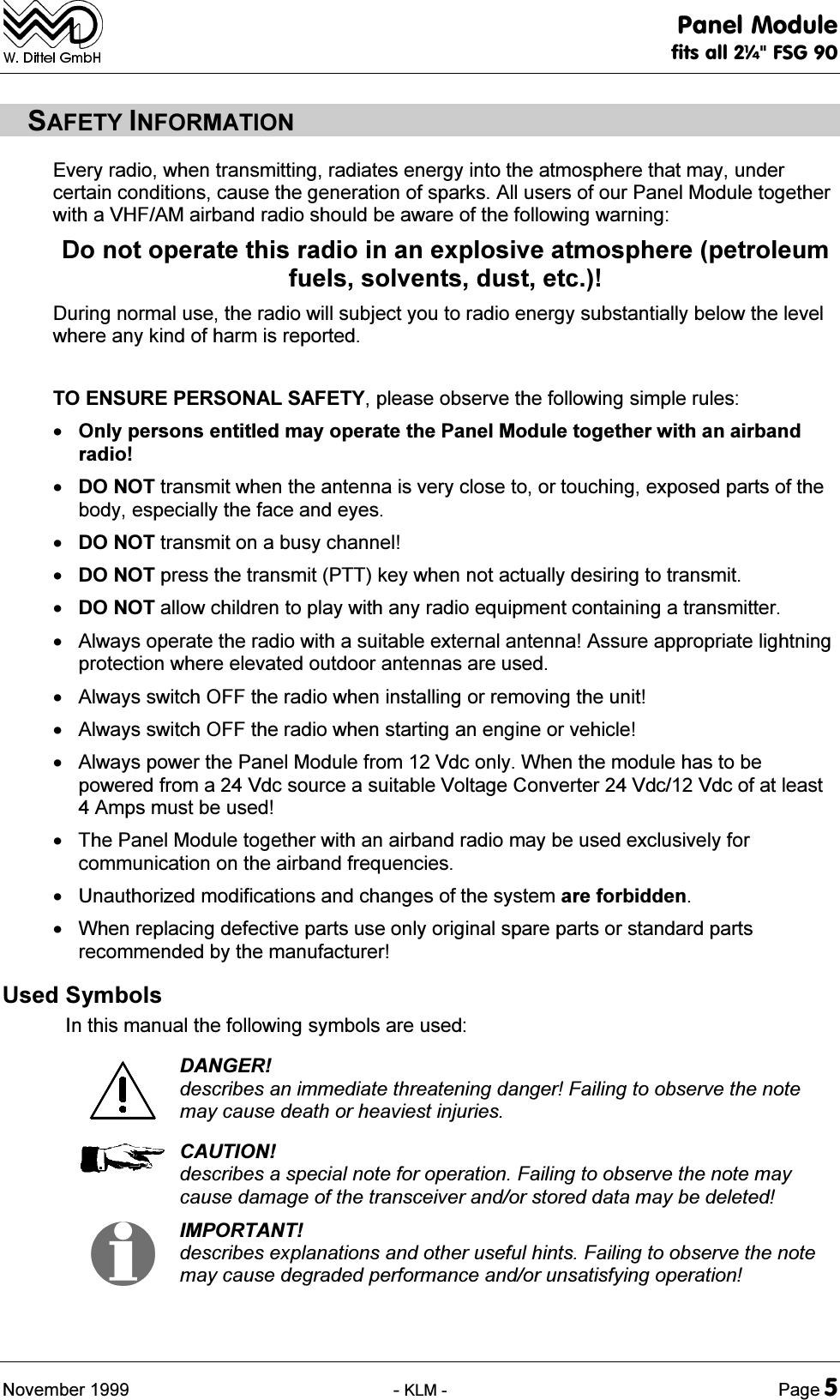 ![3DQHO0RGXOHILWVDOOõ)6*1RYHPEHU ./0 3DJH6$)(7<,1)250$7,21(YHU\UDGLRZKHQWUDQVPLWWLQJUDGLDWHVHQHUJ\LQWRWKHDWPRVSKHUHWKDWPD\XQGHUFHUWDLQFRQGLWLRQVFDXVHWKHJHQHUDWLRQRIVSDUNV$OOXVHUVRIRXU3DQHO0RGXOHWRJHWKHUZLWKD9+)$0DLUEDQGUDGLRVKRXOGEHDZDUHRIWKHIROORZLQJZDUQLQJ'RQRWRSHUDWHWKLVUDGLRLQDQH[SORVLYHDWPRVSKHUHSHWUROHXPIXHOVVROYHQWVGXVWHWF'XULQJQRUPDOXVHWKHUDGLRZLOOVXEMHFW\RXWRUDGLRHQHUJ\VXEVWDQWLDOO\EHORZWKHOHYHOZKHUHDQ\NLQGRIKDUPLVUHSRUWHG72(1685(3(5621$/6$)(7<SOHDVHREVHUYHWKHIROORZLQJVLPSOHUXOHV2QO\SHUVRQVHQWLWOHGPD\RSHUDWHWKH3DQHO0RGXOHWRJHWKHUZLWKDQDLUEDQGUDGLR'2127WUDQVPLWZKHQWKHDQWHQQDLVYHU\FORVHWRRUWRXFKLQJH[SRVHGSDUWVRIWKHERG\HVSHFLDOO\WKHIDFHDQGH\HV'2127WUDQVPLWRQDEXV\FKDQQHO'2127SUHVVWKHWUDQVPLW377NH\ZKHQQRWDFWXDOO\GHVLULQJWRWUDQVPLW'2127DOORZFKLOGUHQWRSOD\ZLWKDQ\UDGLRHTXLSPHQWFRQWDLQLQJDWUDQVPLWWHU $OZD\VRSHUDWHWKHUDGLRZLWKDVXLWDEOHH[WHUQDODQWHQQD$VVXUHDSSURSULDWHOLJKWQLQJSURWHFWLRQZKHUHHOHYDWHGRXWGRRUDQWHQQDVDUHXVHG $OZD\VVZLWFK2))WKHUDGLRZKHQLQVWDOOLQJRUUHPRYLQJWKHXQLW $OZD\VVZLWFK2))WKHUDGLRZKHQVWDUWLQJDQHQJLQHRUYHKLFOH $OZD\VSRZHUWKH3DQHO0RGXOHIURP9GFRQO\:KHQWKHPRGXOHKDVWREHSRZHUHGIURPD9GFVRXUFHDVXLWDEOH9ROWDJH&RQYHUWHU9GF9GFRIDWOHDVW$PSVPXVWEHXVHG 7KH3DQHO0RGXOHWRJHWKHUZLWKDQDLUEDQGUDGLRPD\EHXVHGH[FOXVLYHO\IRUFRPPXQLFDWLRQRQWKHDLUEDQGIUHTXHQFLHV 8QDXWKRUL]HGPRGLILFDWLRQVDQGFKDQJHVRIWKHV\VWHPDUHIRUELGGHQ :KHQUHSODFLQJGHIHFWLYHSDUWVXVHRQO\RULJLQDOVSDUHSDUWVRUVWDQGDUGSDUWVUHFRPPHQGHGE\WKHPDQXIDFWXUHU8VHG6\PEROV,QWKLVPDQXDOWKHIROORZLQJV\PEROVDUHXVHG'$1*(5GHVFULEHVDQLPPHGLDWHWKUHDWHQLQJGDQJHU)DLOLQJWRREVHUYHWKHQRWHPD\FDXVHGHDWKRUKHDYLHVWLQMXULHV&$87,21GHVFULEHVDVSHFLDOQRWHIRURSHUDWLRQ)DLOLQJWRREVHUYHWKHQRWHPD\FDXVHGDPDJHRIWKHWUDQVFHLYHUDQGRUVWRUHGGDWDPD\EHGHOHWHG,03257$17GHVFULEHVH[SODQDWLRQVDQGRWKHUXVHIXOKLQWV)DLOLQJWRREVHUYHWKHQRWHPD\FDXVHGHJUDGHGSHUIRUPDQFHDQGRUXQVDWLVI\LQJRSHUDWLRQ](https://usermanual.wiki/f-u-n-k-e-AVIONICS/FSG90.Frontpanel-Module-without-case-part-one/User-Guide-169914-Page-5.png)