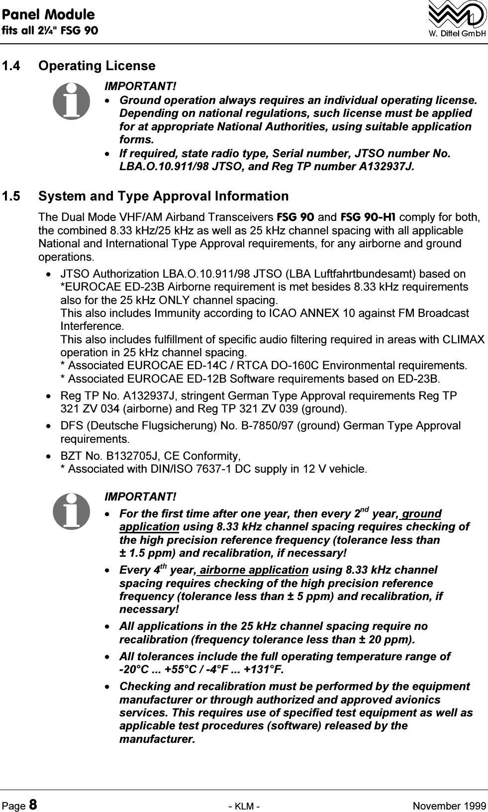 ![3DQHO0RGXOHILWVDOOõ)6*3DJH./0 1RYHPEHU 2SHUDWLQJ/LFHQVH,03257$17*URXQGRSHUDWLRQDOZD\VUHTXLUHVDQLQGLYLGXDORSHUDWLQJOLFHQVH'HSHQGLQJRQQDWLRQDOUHJXODWLRQVVXFKOLFHQVHPXVWEHDSSOLHGIRUDWDSSURSULDWH1DWLRQDO$XWKRULWLHVXVLQJVXLWDEOHDSSOLFDWLRQIRUPV,IUHTXLUHGVWDWHUDGLRW\SH6HULDOQXPEHU-762QXPEHU1R/%$2-762DQG5HJ73QXPEHU$- 6\VWHPDQG7\SH$SSURYDO,QIRUPDWLRQ7KH'XDO0RGH9+)$0$LUEDQG7UDQVFHLYHUV)6*DQG)6*+FRPSO\IRUERWKWKHFRPELQHGN+]N+]DVZHOODVN+]FKDQQHOVSDFLQJZLWKDOODSSOLFDEOH1DWLRQDODQG,QWHUQDWLRQDO7\SH$SSURYDOUHTXLUHPHQWVIRUDQ\DLUERUQHDQGJURXQGRSHUDWLRQV -762$XWKRUL]DWLRQ/%$2-762/%$/XIWIDKUWEXQGHVDPWEDVHGRQ(852&$(('%$LUERUQHUHTXLUHPHQWLVPHWEHVLGHVN+]UHTXLUHPHQWVDOVRIRUWKHN+]21/<FKDQQHOVSDFLQJ7KLVDOVRLQFOXGHV,PPXQLW\DFFRUGLQJWR,&$2$11(;DJDLQVW)0%URDGFDVW,QWHUIHUHQFH7KLVDOVRLQFOXGHVIXOILOOPHQWRIVSHFLILFDXGLRILOWHULQJUHTXLUHGLQDUHDVZLWK&/,0$;RSHUDWLRQLQN+]FKDQQHOVSDFLQJ$VVRFLDWHG(852&$(('&57&$'2&(QYLURQPHQWDOUHTXLUHPHQWV$VVRFLDWHG(852&$(('%6RIWZDUHUHTXLUHPHQWVEDVHGRQ('% 5HJ731R$-VWULQJHQW*HUPDQ7\SH$SSURYDOUHTXLUHPHQWV5HJ73=9DLUERUQHDQG5HJ73=9JURXQG ')6'HXWVFKH)OXJVLFKHUXQJ1R%JURXQG*HUPDQ7\SH$SSURYDOUHTXLUHPHQWV %=71R%-&(&RQIRUPLW\$VVRFLDWHGZLWK',1,62'&VXSSO\LQ9YHKLFOH,03257$17)RUWKHILUVWWLPHDIWHURQH\HDUWKHQHYHU\ \HDUJURXQGDSSOLFDWLRQXVLQJN+]FKDQQHOVSDFLQJUHTXLUHVFKHFNLQJRIWKHKLJKSUHFLVLRQUHIHUHQFHIUHTXHQF\WROHUDQFHOHVVWKDQSSPDQGUHFDOLEUDWLRQLIQHFHVVDU\(YHU\ \HDUDLUERUQHDSSOLFDWLRQXVLQJN+]FKDQQHOVSDFLQJUHTXLUHVFKHFNLQJRIWKHKLJKSUHFLVLRQUHIHUHQFHIUHTXHQF\WROHUDQFHOHVVWKDQSSPDQGUHFDOLEUDWLRQLIQHFHVVDU\$OODSSOLFDWLRQVLQWKHN+]FKDQQHOVSDFLQJUHTXLUHQRUHFDOLEUDWLRQIUHTXHQF\WROHUDQFHOHVVWKDQSSP$OOWROHUDQFHVLQFOXGHWKHIXOORSHUDWLQJWHPSHUDWXUHUDQJHRI&&))&KHFNLQJDQGUHFDOLEUDWLRQPXVWEHSHUIRUPHGE\WKHHTXLSPHQWPDQXIDFWXUHURUWKURXJKDXWKRUL]HGDQGDSSURYHGDYLRQLFVVHUYLFHV7KLVUHTXLUHVXVHRIVSHFLILHGWHVWHTXLSPHQWDVZHOODVDSSOLFDEOHWHVWSURFHGXUHVVRIWZDUHUHOHDVHGE\WKHPDQXIDFWXUHU](https://usermanual.wiki/f-u-n-k-e-AVIONICS/FSG90.Frontpanel-Module-without-case-part-one/User-Guide-169914-Page-8.png)