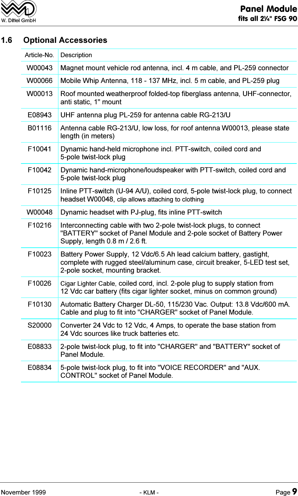 ![3DQHO0RGXOHILWVDOOõ)6*1RYHPEHU ./0 3DJH 2SWLRQDO$FFHVVRULHV$UWLFOH1R 'HVFULSWLRQ: 0DJQHWPRXQWYHKLFOHURGDQWHQQDLQFOPFDEOHDQG3/FRQQHFWRU: 0RELOH:KLS$QWHQQD0+]LQFOPFDEOHDQG3/SOXJ: 5RRIPRXQWHGZHDWKHUSURRIIROGHGWRSILEHUJODVVDQWHQQD8+)FRQQHFWRUDQWLVWDWLFPRXQW( 8+)DQWHQQDSOXJ3/IRUDQWHQQDFDEOH5*8% $QWHQQDFDEOH5*8ORZORVVIRUURRIDQWHQQD:SOHDVHVWDWHOHQJWKLQPHWHUV) '\QDPLFKDQGKHOGPLFURSKRQHLQFO377VZLWFKFRLOHGFRUGDQGSROHWZLVWORFNSOXJ) '\QDPLFKDQGPLFURSKRQHORXGVSHDNHUZLWK377VZLWFKFRLOHGFRUGDQGSROHWZLVWORFNSOXJ) ,QOLQH377VZLWFK8$8FRLOHGFRUGSROHWZLVWORFNSOXJWRFRQQHFWKHDGVHW:FOLSDOORZVDWWDFKLQJWRFORWKLQJ: '\QDPLFKHDGVHWZLWK3-SOXJILWVLQOLQH377VZLWFK) ,QWHUFRQQHFWLQJFDEOHZLWKWZRSROHWZLVWORFNSOXJVWRFRQQHFW%$77(5<VRFNHWRI3DQHO0RGXOHDQGSROHVRFNHWRI%DWWHU\3RZHU6XSSO\OHQJWKPIW) %DWWHU\3RZHU6XSSO\9GF$KOHDGFDOFLXPEDWWHU\JDVWLJKWFRPSOHWHZLWKUXJJHGVWHHODOXPLQXPFDVHFLUFXLWEUHDNHU/('WHVWVHWSROHVRFNHWPRXQWLQJEUDFNHW) &LJDU/LJKWHU&DEOHFRLOHGFRUGLQFOSROHSOXJWRVXSSO\VWDWLRQIURP9GFFDUEDWWHU\ILWVFLJDUOLJKWHUVRFNHWPLQXVRQFRPPRQJURXQG) $XWRPDWLF%DWWHU\&KDUJHU'/9DF2XWSXW9GFP$&DEOHDQGSOXJWRILWLQWR&+$5*(5VRFNHWRI3DQHO0RGXOH6 &RQYHUWHU9GFWR9GF$PSVWRRSHUDWHWKHEDVHVWDWLRQIURP9GFVRXUFHVOLNHWUXFNEDWWHULHVHWF( SROHWZLVWORFNSOXJWRILWLQWR&+$5*(5DQG%$77(5<VRFNHWRI3DQHO0RGXOH( SROHWZLVWORFNSOXJWRILWLQWR92,&(5(&25'(5DQG$8;&21752/VRFNHWRI3DQHO0RGXOH](https://usermanual.wiki/f-u-n-k-e-AVIONICS/FSG90.Frontpanel-Module-without-case-part-one/User-Guide-169914-Page-9.png)