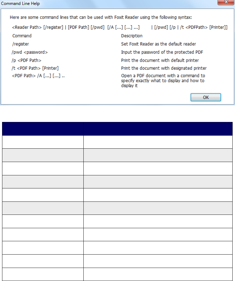 To check the command lines that can be used in Foxit Reader, please go to Help > Command Line