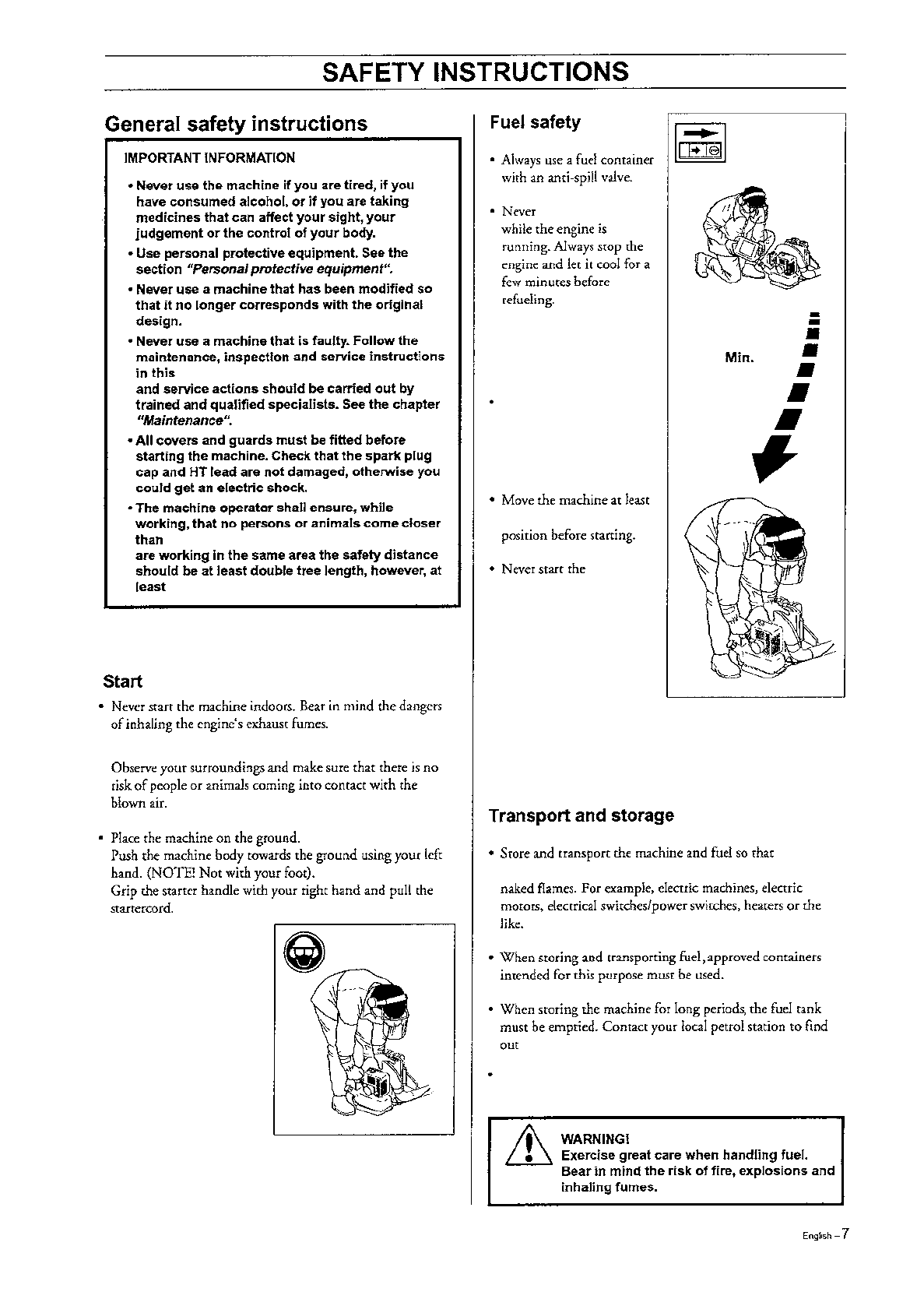 - Never overfill fuel tank. Always wipe off any spilled