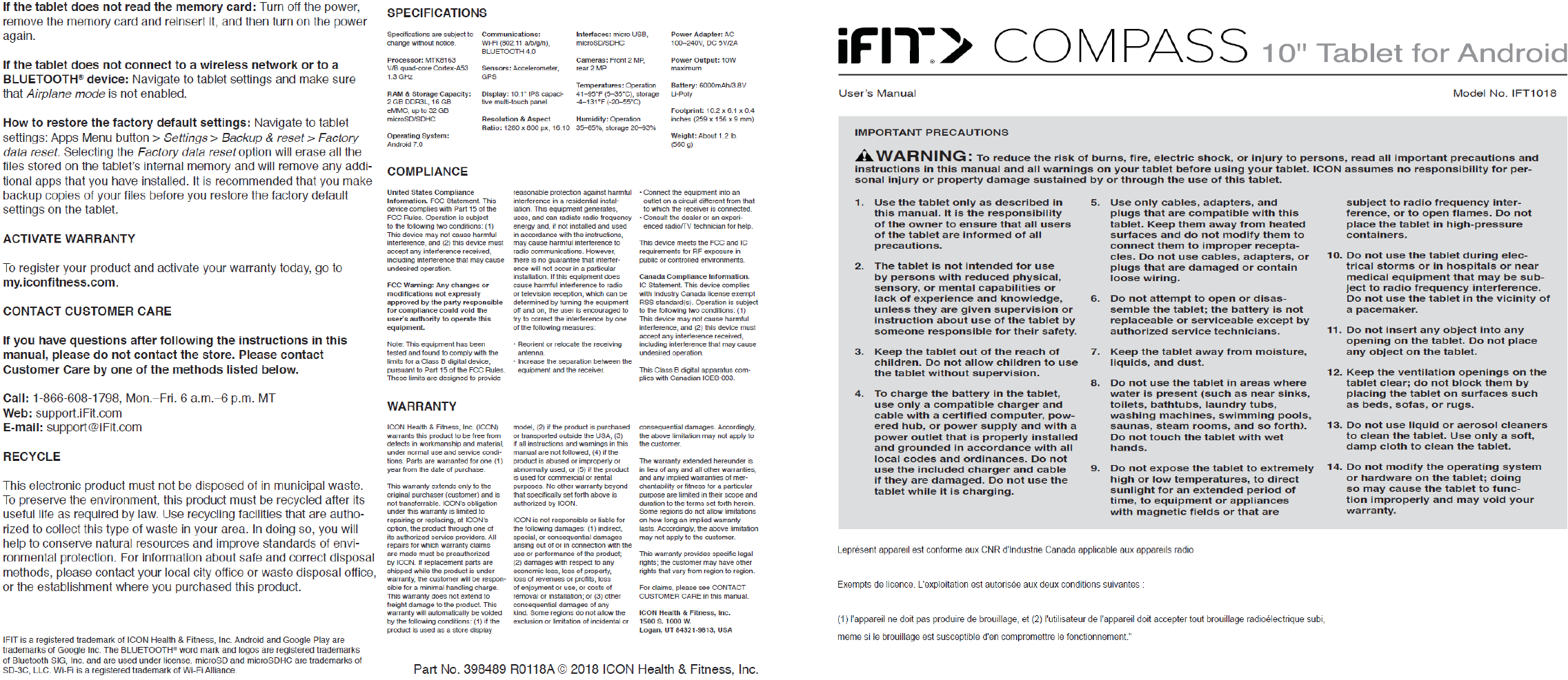 iFIT Health and Fitness IFT1018 Tablet with BT/WIFI functions User Manual
