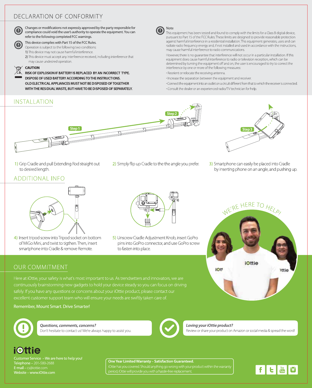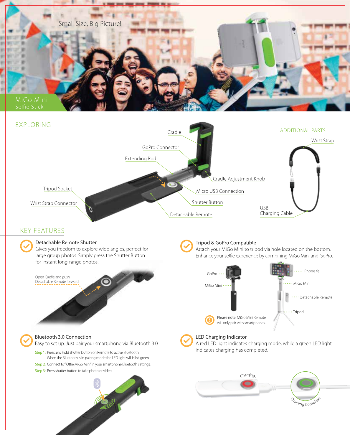 iOttie Inc iOttie MiGo Mini Selfie Stick, GoPro Pole for iPhone 6s Plus, Galaxy S6 5 Note 5, Android Smartphones, HERO4 Session with Built in Bluetooth Remote Shutter, Tripod Mount Manual MiGo Mini AllStyles v3 REFERENCE