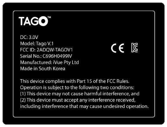 object. Access to the battery is below the Tago cover that displays the Tago logo. Place the