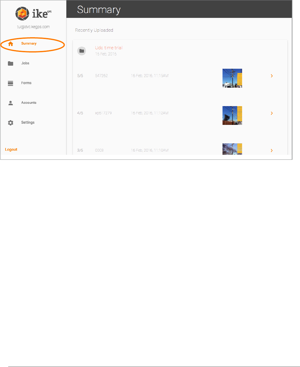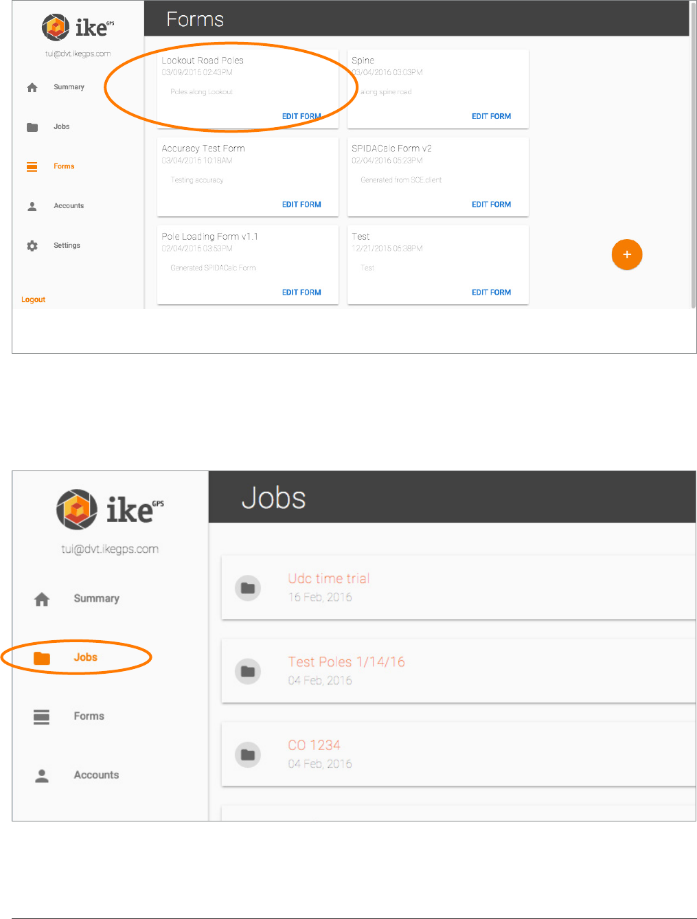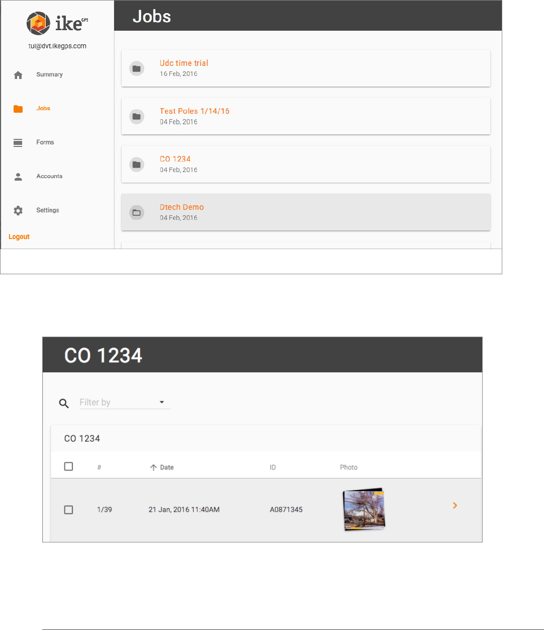 The Jobs screen shows all the data uploaded from the IKE 4 device to the specic account. Jobs