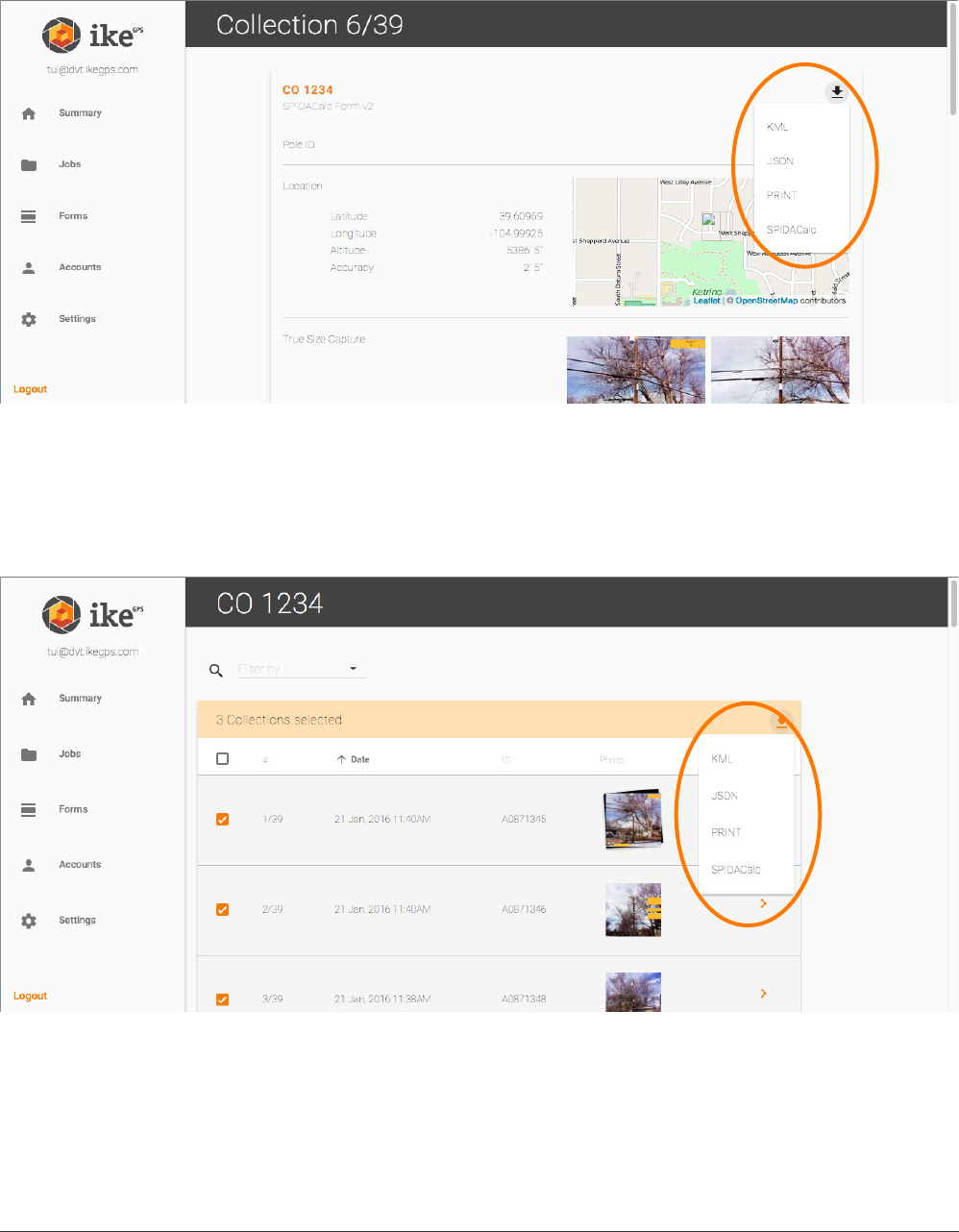 An individual collection can be exported to KML, JSON, Print (PDF) or to SPIDACalc format.