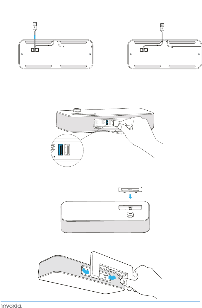1. Plug the cord of the handset into the right USB port at the back of the base. Slide the cord into place through