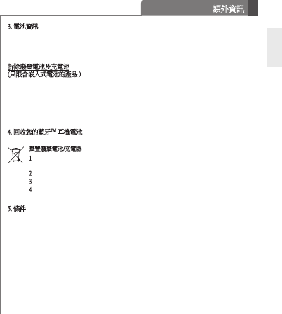 您的藍牙TM耳機電池必須正確棄置,絕不可棄於一般廢棄物內。