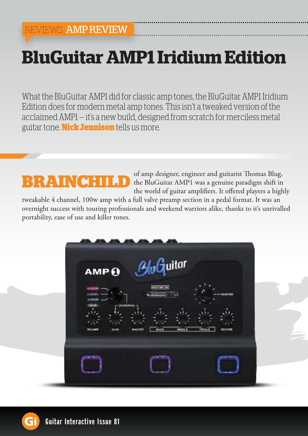 REVIEWS_AMP REVIEW BluGuitar AMP1 Iridium Edition What the BluGuitar AMP1 did for classic amp tones, the BluGuitar AMP1 Iridium Edition does for modern metal amp tones. This isn't a tweaked version of the acclaimed AMP1 -- it's a new build, designed from scratch for merciless metal guitar tone. Nick Jennison tells us more. BRAINCHILD of amp designer, engineer and guitarist Thomas Blug, the BluGuitar AMP1 was a genuine paradigm shift in the world of guitar amplifiers. It offered players a highly tweakable 4 channel, 100w amp with a full valve preamp section in a pedal format. It was an overnight success with touring professionals and weekend warriors alike, thanks to it's unrivalled portability, ease of use and killer tones. Guitar Interactive Issue 81 THE REVIEWS BLUGUITAR AMP1 IRIDIUM EDITION That said, the original "silver" AMP1 had a distinctly "classic" voicing. It certainly wasn't lacking gain, with tons of saturation on tap, but the tone was perhaps a little "old school" for more aggressive styles. Enter the new Mercury and Iridium editions of the AMP1 - tweaked versions of the original to suit players with different tastes. While the Mercury is tighter and more aggressive than the original "Silver" version, the Iridium is pure balls-to-the-wall metal in a a sexy, nonemore-black package. Offering a high-headroom clean channel and three distortion channels with independent tone and volume controls, an on-board boost to further tighten and saturate your tone, two flavours of gate and a lush digital reverb, the AMP1 Iridium is a veritable Swiss army knife of heavy tones. To be honest, it's hard to imagine needing anything else for a metal gig, except maybe a wah, a tuner and delay - which you can plumb in via the FX loop. Metal tones are deceptively hard to get right. There needs to be ample low end, but it has to be tight and articulate. The highs need to bite hard, but they can't be abrasive. The mids need to be focussed, but not pinched and honky. I'm happy to report that the AMP1 Iridium strikes this delicate balance superbly well across all three of its overdrive channels. Each offers a different dynamic feel and compression: "vintage" is perfect for classic 80s metal, while "classic" is open and articulate and "modern" is tight and focussed. The trim pots on the side of the pedal make it very easy to tailor the sound of each mode to your tastes. I found that boosting the highs on one mode for rhythms and rolling off the highs and boosting the volume of another for leads worked very well indeed. You can switch between any of these modes using either MIDI or the optional Remote1 footswitch. » RECOMMEND ED PRODUCT ED PRODUCT RECOMMEND BluGuitar AMP1 Iridium Edition The Breakdown Vintage Modern Specialised Versatile Affordable High-end Studio Stadium For fans of Vintage tones with a modern twist 100w in a tiny format. Excellent boost, reverb and gate For more information, please visit: bluguitar.com www.guitarinteractivemagazine.com REVIEWS_AMP REVIEW The clean channel, by contrast, is extremely clean and headroomy, with a distinct midrange scoop that will help even the most congested of humbuckers to sparkle. It's ideal for arpeggiated clean parts and eerie ambient parts, but you might want to look elsewhere if you need broken-up tweed tones. The three onboard effects are excellent, and tuned perfectly to work with the sounds on the AMP1 Iridium. The boost is similar to the ubiquitous Tube Screamer, but with a slightly more aggressive upper midrange presence - it's ideal for taking solo tones over the top, or for further tightening up the already tight tones this amp offers. The reverb is rich and immersive with warm highs and clear lows, and it works equally well to add space to clean and lead tones. It's activated by the onboard reverb footswitch, and this switch also sets the gate to "soft" - this is a super clever feature, allowing you to use the "metal" gate for tight staccato passages and switching straight to the sustain-preserving "soft" mode for reverb-laden leads. Of course, all of this is no good if you can't be heard, and the AMP1 Iridium delivers Guitar Interactive Issue 81 THE REVIEWS BLUGUITAR AMP1 IRIDIUM EDITION "It's also a supremely comfortable guitar to play thanks to the 25" scale length, PRS `Wide Fat' neck profile and beautiful fretwork...." here in spades. The poweramp reconfigures to offer a full 100w through either 8 or 16ohm cabs, and it can get brutally loud if you need to. There's also a recording out for running direct, which offers analogue speaker simulation that can be defeated if you'd prefer to use your own IRs. » BluGuitar AMP1 Iridium Edition www.guitarinteractivemagazine.com REVIEWS_AMP REVIEW The BluGuitar AMP1 Iridium offers the kind of tone, attack and versatility you'd expect from a big heavy 4-channel amp head, but in a pedalboard format. If you're a touring musician, the portability is a godsend, but even if you're not, this little amp offers some of the most convincing metal tones I've heard in a long time for a fraction of the cost of most high-gain amps. Very highly recommended! END << 90 Guitar Interactive Issue 81PDFs:376017a8-2ec0-4266-8103-5686c793dedd;PDFTron PDFNet build 5.22.143.46