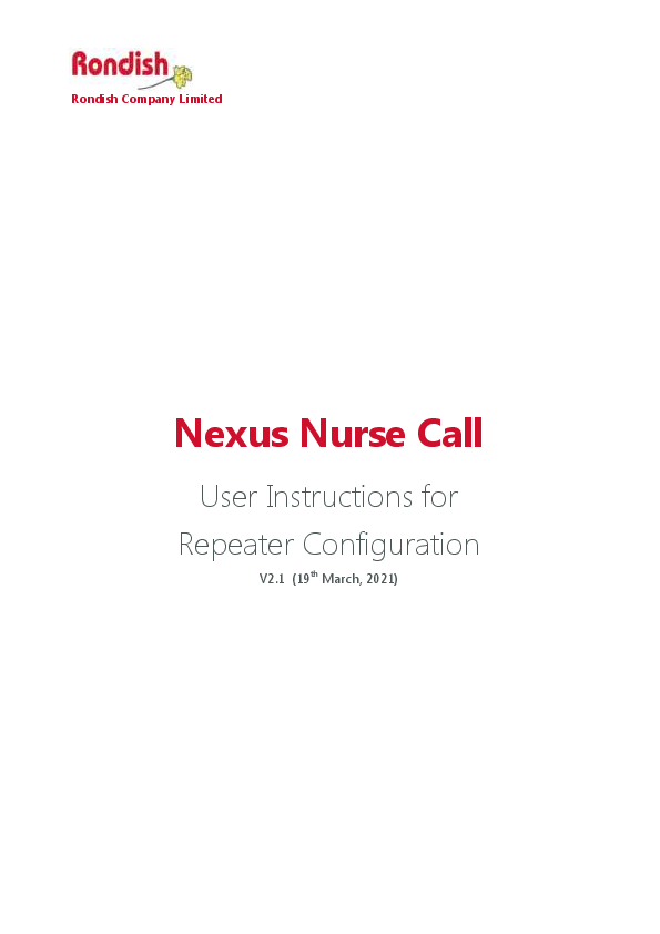 Rondish Company Limited Nexus Nurse Call User Instructions for Repeater Configuration V2.1 (19th March, 2021) NEXUS CALL SYSTEM by Rondish Contents Contents ............................................................................................................................................................................... 2 1. PRODUCT OVERVIEW..............................................................................................................................................4 1.1 System Layout with Dongle ...........................................................................................................................4 1.2 System Layout with Repeaters ......................................................................................................................5 1.3 General Operation .............................................................................................................................................8 1.3.1 Nexus Behavior Table ...............................................................................................................................8 1.3.2 Dongle/Repeater Status ..........................................................................................................................8 1.3.3 Lost Device Behavior.................................................................................................................................9 2. INSTALLING NEXUS............................................................................................................................................... 10 2.1 The Nexus Display .......................................................................................................................................... 11 2.1.1 Registering Nexus................................................................................................................................... 11 2.1.2 Android Options...................................................................................................................................... 11 2.2 Configuring a Repeater Network .............................................................................................................. 13 2.2.1 Network ID................................................................................................................................................. 13 2.2.2 Wireless Channel ..................................................................................................................................... 14 2.2.3 Target Address ......................................................................................................................................... 14 2.2.4 Repeater Address.................................................................................................................................... 14 2.3 Call Points .......................................................................................................................................................... 16 2.4 Indication Lights .............................................................................................................................................. 17 2.4.1 Operation Modes .................................................................................................................................... 17 2.4.2 Programming............................................................................................................................................ 18 2.4.3 Call Forward .............................................................................................................................................. 19 2.4.4 Pairing Call Points ................................................................................................................................... 19 2.5 Messaging Options ........................................................................................................................................ 20 3. USER INTERFACE .................................................................................................................................................... 21 3.1 Home Screen .................................................................................................................................................... 21 3.2 Alarm Screen..................................................................................................................................................... 22 3.2.1 Display Details .......................................................................................................................................... 22 P2 NEXUS CALL SYSTEM by Rondish 3.2.2 Admin Reset.............................................................................................................................................. 23 3.3 Device Management...................................................................................................................................... 24 3.3.1 Add New Device ...................................................................................................................................... 24 3.3.2 Device Location........................................................................................................................................ 25 3.3.3 Delete Device............................................................................................................................................ 25 3.4 Event Log............................................................................................................................................................ 26 3.5 Settings ............................................................................................................................................................... 26 3.5.1 Change Settings ..............................................................................................