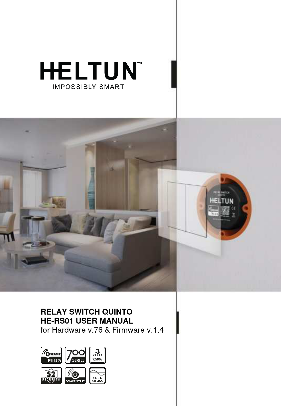 This is the user manual for the HELTUN HE-RS01 Advanced Programmable Relay Switch `Quinto' (i.e. five-channel). It is designed to fit inside standard round, square, or rectangular electrical junction boxes installed behind an existing in-wall switch or inside a circuit breaker panel. Relay Switch Quinto enables On/Off controls of lights, dimmers, blinds, doors, gates, valves, and motors either manually by a direct-connected switch, or remotely through a ZWaveTM network.