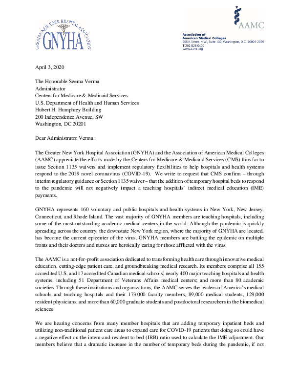 The Greater New York Hospital Association (GNYHA) and the Association of American Medical Colleges (AAMC) appreciate the efforts made by the Centers for Medicare & Medicaid Services (CMS) thus far to issue Section 1135 waivers and implement regulatory flexibilities to help hospitals and health systems respond to the 2019 novel coronavirus (COVID-19). We write to request that CMS confirm ­ through interim regulatory guidance or Section 1135 waiver ­ that the addition of temporary hospital beds to respond to the pandemic will not negatively impact a teaching hospitals' indirect medical education (IME) payments.