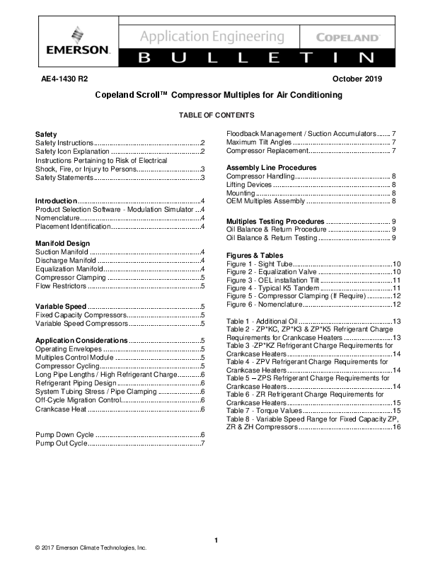 AE4-1430 R2 October 2019 Copeland ScrollTM Compressor Multiples for Air Conditioning TABLE OF CONTENTS Safety Safety Instructions.......................................................2 Safety Icon Explanation ..............................................2 Instructions Pertaining to Risk of Electrical Shock, Fire, or Injury to Persons.................................3 Safety Statements.......................................................3 Introduction ...............................................................4 Product Selection Software - Modulation Simulator ...4 Nomenclature..............................................................4 Placement Identification..............................................4 Manifold Design Suction Manifold .........................................................4 Discharge Manifold .....................................................4 Equalization Manifold ..................................................4 Compressor Clamping ................................................5 Flow Restrictors ..........................................................5 Variable Speed ..........................................................5 Fixed Capacity Compressors......................................5 Variable Speed Compressors .....................................5 Application Considerations .....................................5 Operating Envelopes ..................................................5 Multiples Control Module ............................................5 Compressor Cycling....................................................5 Long Pipe Lengths / High Refrigerant Charge............6 Refrigerant Piping Design ...........................................6 System Tubing Stress / Pipe Clamping ......................6 Off-Cycle Migration Control.........................................6 Crankcase Heat ..........................................................6 Pump Down Cycle ......................................................6 Pump Out Cycle ..........................................................7 Floodback Management / Suction Accumulators ....... 7 Maximum Tilt Angles .................................................. 7 Compressor Replacement.......................................... 7 Assembly Line Procedures Compressor Handling................................................. 8 Lifting Devices ............................................................ 8 Mounting ..................................................................... 8 OEM Multiples Assembly ........................................... 8 Multiples Testing Procedures ................................. 9 Oil Balance & Return Procedure ................................ 9 Oil Balance & Return Testing ..................................... 9 Figures & Tables Figure 1 - Sight Tube...................................................10 Figure 2 - Equalization Valve ......................................10 Figure 3 - OEL installation Tilt .....................................11 Figure 4 - Typical K5 Tandem .....................................11 Figure 5 - Compressor Clamping (If Require) .............12 Figure 6 - Nomenclature..............................................12 Table 1 - Additional Oil ................................................13 Table 2 - ZP*KC, ZP*K3 & ZP*K5 Refrigerant Charge Requirements for Crankcase Heaters .........................13 Table 3 -ZP*KZ Refrigerant Charge Requirements for Crankcase Heaters......................................................14 Table 4 - ZPV Refrigerant Charge Requirements for Crankcase Heaters......................................................14 Table 5 ZPS Refrigerant Charge Requirements for Crankcase Heaters......................................................14 Table 6 - ZR Refrigerant Charge Requirements for Crankcase Heaters......................................................15 Table 7 - Torque Values ..............................................15 Table 8 - Variable Speed Range for Fixed Capacity ZP, ZR & ZH Compressors ................................................16 1 © 2017 Emerson Climate Technologies, Inc. AE4-1430 Safety Instructions Copeland ScrollTM compressors are manufactured according to the latest U.S. and European Safety Standards. Emphasis has been placed on the user's safety. Safety icons are explained below and safety instructions applicable to the products in this bulletin are grouped on Page 3. These instructions should be retained throughout the lifetime of the compressor. You are strongly advised to follow these safety instructions. Safety Icon Explanation DANGER DANGER indicates a hazardous situation which, if not avoided, will result in death or serious injury. WARNING WARNING indicates a hazardous situation which, if not avoided, could result in death or serious injury. CAUTION CAUTION, used with the safety alert symbol, indicates a hazardous situation which, if not avoided, could result in minor or moderate injury. NOTICE NOTICE is used to address practices not related to personal injury. CAUTION CAUTION, without the safety alert symbol, is used to address practices not related to personal injury. 2 © 2017 Emerson Climate Technologies, Inc. AE4-1430 Instructions Pertaining to Risk of Electrical Shock, Fire, or Injury to Persons WARNING ELECTRICAL SHOCK HAZARD · Disconnect and lock out power before servicing. · Discharge all capacitors before servicing. · Use compressor with grounded system only. · Molded electrical plug must be used when required. · Refer to original equipment wiring diagrams. · Electrical connections must be made by qualified electrical personnel. · Failure to follow these warnings could result in serious personal injury. WARNING PRESSURIZED SYSTEM HAZARD · System contains refrigerant and oil under pressure. · Remove refrigerant from both the high and low compressor side before removing compressor. · Never install a system and leave it unattended when it has 