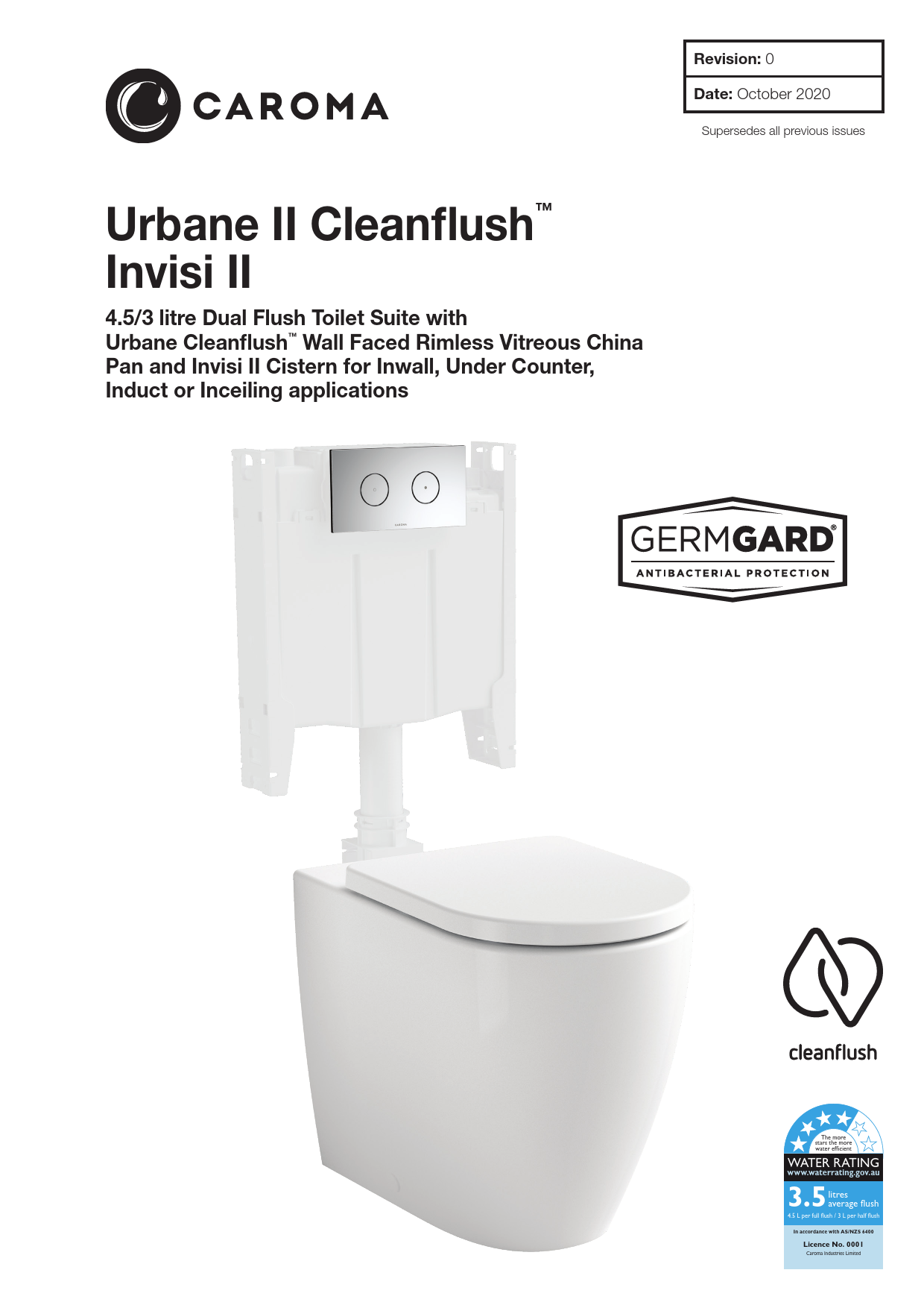 Revision: 0 Date: October 2020 Supersedes all previous issues Urbane II CleanflushTM Invisi II 4.5/3 litre Dual Flush Toilet Suite with Urbane CleanflushTM Wall Faced Rimless Vitreous China Pan and Invisi II Cistern for Inwall, Under Counter, Induct or Inceiling applications The more stars the more water efficient WATER RATING www.waterrating.gov.au 3.5 litres average flush 4.5 L per full flush / 3 L per half flush In accordance with AS/NZS 6400 Licence No. 0001 Caroma Industries Limited Urbane II CleanflushTM Invisi II 4.5/3 litre Dual Flush Toilet Suite with Urbane CleanflushTM Vitreous China Wall Faced Rimless Pan and Invisi II Cistern for Inwall, Under Counter, Induct or Inceiling applications Pictured with Caroma Vogue soft close seat Combining universal design and rimless pan technology, the Urbane II CleanflushTM is a superior flushing system suitable for domestic and commercial applications. Incorporating several patented technologies: Caroma Flow SplitterTM, Caroma Flow BalancerTM and Caroma Uni-Orbital® Connector, the Cleanflush pan is innovative and the next evolution in toilets. The Flow Splitter evenly flows water around the top of the bowl to meet at the Flow Balancer which directs the water powerfully into the sump, reducing the need for brush cleaning. The rimless pan is easy to clean and unlike traditional pan profiles, provides full visibility of any grime build up. Caroma CleanflushTM provides a cleaner clean for peace of mind. The adjustable flush pipe is a new feature for the Invisi II system. If the pan inlet hole is higher than the flush pipe due to floor tiling height variations, the flush pipe can be raised by up to 25mm. Pan: Traps: Inlet: Cisterns and Flushvalves: Fixing: Seats: Colours: Installation: Dimensions: Urbane CleanflushTM wall faced back inlet 4.5 litre full flush rimless pan. Universal trap for S or P-trap installations. Fully glazed 50mm back inlet for concealed cistern. Invisi II Cistern suitable for inwall, under counter, induct and inceiling applications. The Vogue Round Push Buttons and Access Plate (supplied separately) are available in 5 finishes: Chrome (C), Black (B), Brushed Brass (BB), Brushed Nickel (BN) and Gunmetal Grey (GM). Code No.687071. The pan can be fixed to the floor by either bedding into mortar or using the supplied D82 Concealed Fixing Bracket. The Vogue soft close quick release thermoset toilet seat with GermGard® Antibacterial Protection; a unique technology which kills harmful bacteria, is provided as standard with seat caps in Stainless Steel (SS). Optional seat caps are available in 3 finishes, Brushed Brass (BB), Black (B) or Gunmetal Grey (GM). Code No.254213. White only. The installation of the toilet suite shall be in accordance with the normal minimum drainline grade requirements in AS/NZS 3500.2. All dimensions are in millimetres and are subject to normal manufacturing variations. Caroma pursues a policy of continuing improvement in design and performance of its products. The right is therefore reserved to vary specifications without notice. Urbane II CleanflushTM Invisi II Wall Faced Suite Inwall/Under Counter Installations Adjustable flush pipe included Urbane II CleanflushTM Invisi II 4.5/3 litre Wall Faced Toilet Suite with Back Inlet Pan, Internal Overflow Cistern and Seat with Stainless Steel Seat Caps: Inwall/Under Counter/Induct/Inceiling with Vogue Soft Close Quick Release Seat Button options: see 6.15.1 Code No. 746280W Inwall Installation 400 420 Frame 45 Integrated isolating valve supplied 55 min. to underside of noggin 582 6 min. 45 max. wall thickness 90 min Under Counter Installation (optional under counter flush pipe 237222 is required) Access plate and buttons 210 570 25 110 90mm min. front button installation 100mm min. top button installation Access plate front mount buttons Note: Seat will partially cover push button in this installation Invisi II cistern Finished wall 45mm max. for top push buttons Access plate Top mount buttons 940 (adjustable from 812 982) 55 min. 440 55 (adjustable from 882 982) centre of inlet (adjustable from 482 582) 25 to top of flush pipe support noggin 982 400 90 recommended setout, range 60 120 (up to 50mm sideways adjustment) Caroma Industries Limited ABN 35 000 189 499 185 Uni-Orbital® connector Integrated flush pipe support Note: access to cistern internals can be achieved through either front or top mount button plate option. Sales Offices in all States.Adobe PDF Library 15.0 Adobe InDesign 15.1 (Windows)