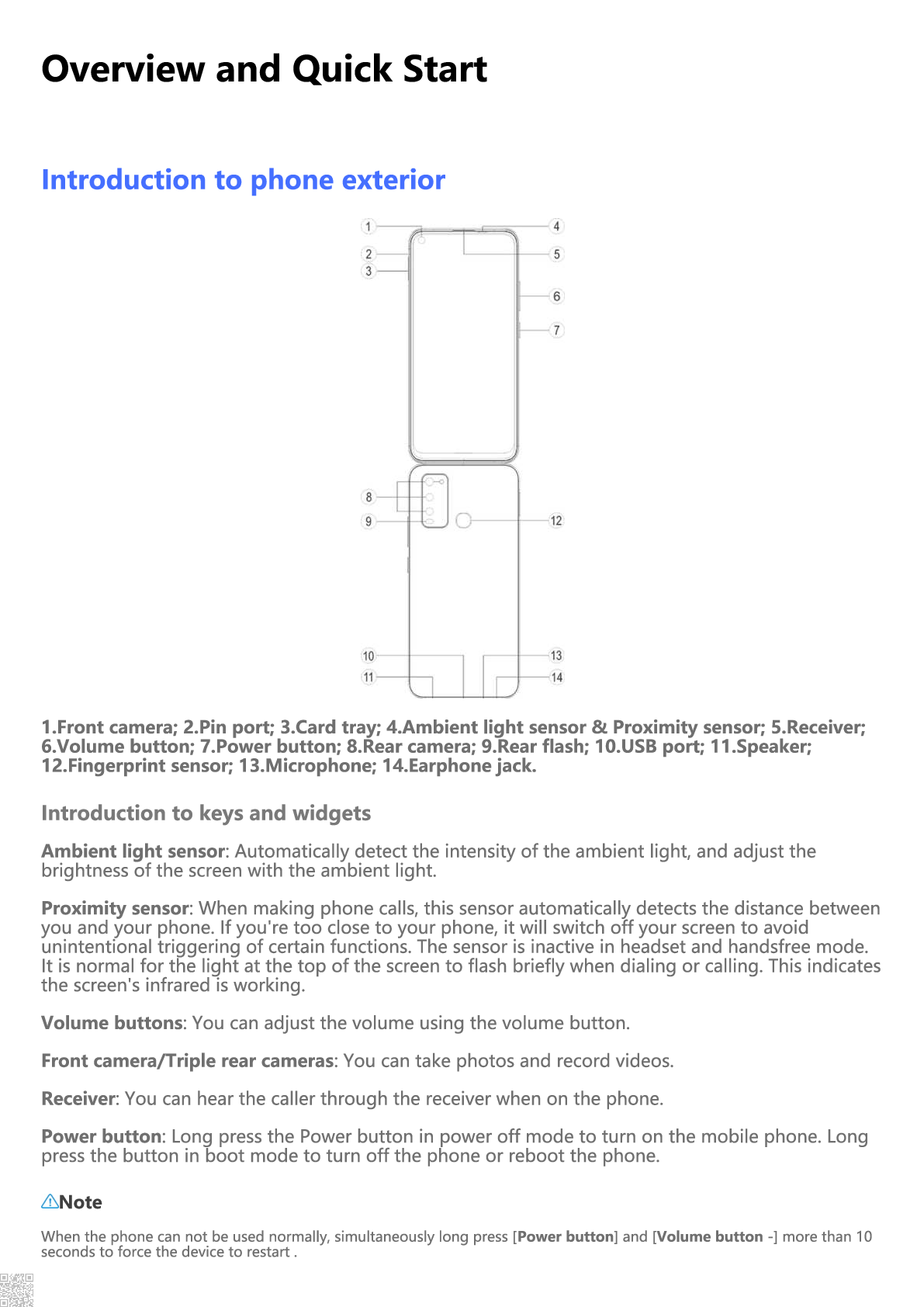 Overview. Introduction to phone exterior. 1. Front camera; 2. Pin port; 3. Card tray; 6. Volume button; 7. Power button; 8. Rear camera; 9. Rear flash; 10. USB port; 11.Speaker; 12. Fingerprint sensor...
