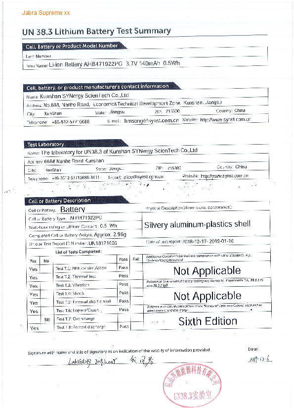 Reference to the revised edition of the Manual of Tests and Criteria used and to amendments thereto, if any. Sixth Edition Yes NO Yes Yes Yes Yes Yes Yes No Yes Pass Pass Pass Pass Pass Pass Pass Pass Altitude simulation Test T.l: Thermal test Test T.2: Vibration Test -r.3: Shock Test -r.4. External short circuit Test T.5: Impact/Crush Test T.6: