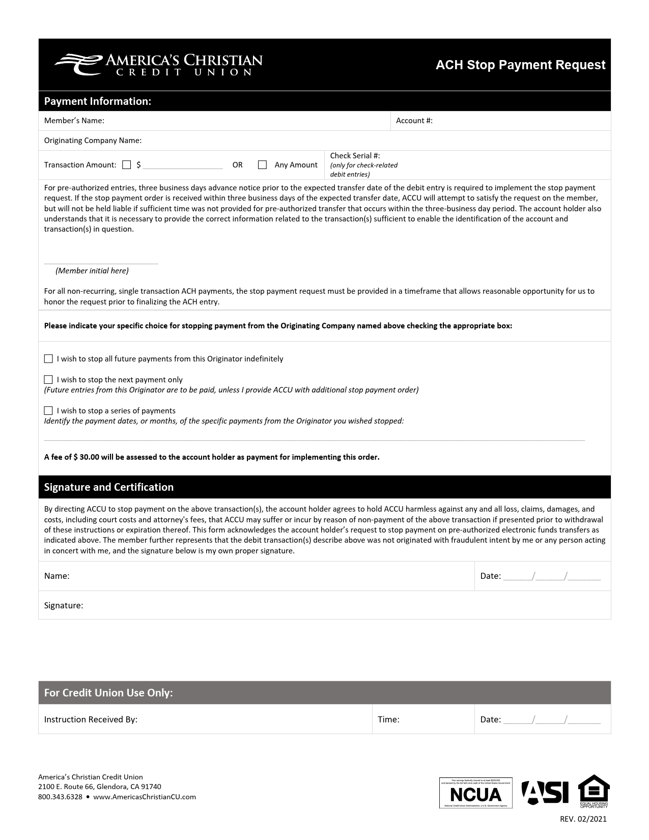 ACH Stop Payment Request Payment Information: Member's Name: Account #: Originating Company Name: Transaction Amount: $ ___________________ OR Any Amount Check Serial #: (only for check-related debit entries) For pre-authorized entries, three business days advance notice prior to the expected transfer date of the debit entry is required to implement the stop payment request. If the stop payment order is received within three business days of the expected transfer date, ACCU will attempt to satisfy the request on the member, but will not be held liable if sufficient time was not provided for pre-authorized transfer that occurs within the three-business day period. The account holder also understands that it is necessary to provide the correct information related to the transaction(s) sufficient to enable the identification of the account and transaction(s) in question. ___________________________ (Member initial here) For all non-recurring, single transaction ACH payments, the stop payment request must be provided in a timeframe that allows reasonable opportunity for us to honor the request prior to finalizing the ACH entry. Please indicate your specific choice for stopping payment from the Originating Company named above checking the appropriate box: I wish to stop all future payments from this Originator indefinitely I wish to stop the next payment only (Future entries from this Originator are to be paid, unless I provide ACCU with additional stop payment order) I wish to stop a series of payments Identify the payment dates, or months, of the specific payments from the Originator you wished stopped: ________________________________________________________________________________________________________________________________ A fee of $ 30.00 will be assessed to the account holder as payment for implementing this order. Signature and Certification By directing ACCU to stop payment on the above transaction(s), the account holder agrees to hold ACCU harmless against any and all loss, claims, damages, and costs, including court costs and attorney's fees, that ACCU may suffer or incur by reason of non-payment of the above transaction if presented prior to withdrawal of these instructions or expiration thereof. This form acknowledges the account holder's request to stop payment on pre-authorized electronic funds transfers as indicated above. The member further represents that the debit transaction(s) describe above was not originated with fraudulent intent by me or any person acting in concert with me, and the signature below is my own proper signature. Name: Date: ______/______/_______ Signature: For Credit Union Use Only: Instruction Received By: America's Christian Credit Union 2100 E. Route 66, Glendora, CA 91740 800.343.6328 · www.AmericasChristianCU.com Time: Date: ______/______/_______ REV. 02/2021Adobe PDF Library 21.1.170