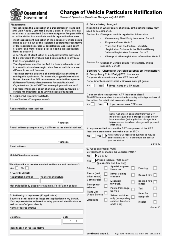 Print Form Reset Form Change of Vehicle Particulars Notification Transport Operations (Road Use Management) Act 1995 Please note: · You can lodge this application at a Department of Transport and Main Roads Customer Service Centre, or if you live in a rural area, a Queensland Government Agency Program Office or police station that conducts vehicle registration business. · A self-assessment inspection of the change of vehicle details must be carried out by the registered operator/representative of the registered operator, a departmental approved agent or authorised motor dealer prior to lodging this application. Refer to section B. · A Certificate of Modification or an Approval letter may need to be provided if the vehicle has been modified in any way from its original design. · The department must be notified if a heavy vehicle is used in a combination where registration fees or vehicle use are different to current fees/use. · You must provide evidence of identity (EOI) at the time of making this application. For example, original Queensland Driver Licence. For EOI requirements refer to the separate Evidence of Identity Requirements for Individuals and Organisations (form F4362) or www.qld.gov.au/transport/. · For more information about changing vehicle particulars or vehicle modifications go to www.qld.gov.au/transport/. 1. Registered Operator's details Private/Business/Company name/s Residential/Business address Postcode Postal address (complete only if different to residential address) Email address Mobile/Telephone number Postcode Would you like to receive emailed notification and reminders? Yes No 2. Vehicle details Registration number Year of manufacture Make/Model/Body shape (for example, Ford Falcon sedan) 3. Authority to represent (if applicable) I authorise this person to lodge the application on my behalf. Your representative will need to bring personal identification as well as proof of your identity. Name of representative 4. Details being changed Depending on what you are changing, both sections below may need to be completed. Section A - Change of vehicle registration information: · Compulsory Third Party insurance. Go to 5 · Purpose of use. Go to 6 · Transition from the Federal Interstate Registration Scheme to the National Heavy Vehicle Registration Scheme. Go to 7 · Change of other registration information. Go to 8 Section B - Change of vehicle details (for example, engine number). Go to 9 Section A - Change of vehicle registration information 5. Compulsory Third Party (CTP) insurance Do you wish to nominate a new CTP insurer? For a list of licenced insurers visit www.maic.qld.gov.au. No Yes If yes, name of CTP insurer Do you wish to change your CTP insurance class? The CTP Insurance class is determined according to the type and use of the vehicle. For details visit www.maic.qld.gov.au. No Yes If yes, record new CTP class Note: A change of class letter from your CTP insurer is required for a change to a higher CTP insurance class (not required for changes to a higher class at transfer or changes with payment of renewal). Is anyone entitled to claim the GST component of the CTP insurance premium for the vehicle as an ITC? No Yes Note: Only GST registered businesses may be able to claim an ITC - if unsure please consult your tax advisor. Go to 10 6. Purpose of use (POU) Do you want to change the vehicle's POU? No Go to 10 Yes Private Please indicate POU below (please tick one box only) Special purpose limousine Rental (self driver rental) Commercial Emergency vehicles TransLink Urban Service Limousine Driver training or tuition Licensed tow truck Public Passenger Service School activities only (transporting children teachers, and so on) Farming Booked hire Booked hire rental Taxi Used for non profit Dealer Go to 10 Signature Identification of representative Date / / continued page 2... Page 1 of 3 TRB Forms Area F3524 CFD V01 Jun 2018 Change of Vehicle Particulars Notification ... continued page 2 of 3 7. Federal Interstate Registration Scheme (FIRS) Are you transitioning your FIRS vehicle to the National Heavy Vehicle Registration Scheme? No Yes Vehicles transitioning to the National Heavy Vehicle Registration Scheme from 1 July 2018 to 30 June 2019 (inclusive) will be exempt from paying vehicle duty and the National Heavy Vehicle Registration plate fee. Note: You must surrender the vehicle's current number plates when lodging this application. Go to 10 Section B - Change of vehicle details 9. Do you want to change the vehicle's details? No Go to 10 Yes Please specify the vehicle details being changed, for example, engine number. Note: If the vehicle has been modified in any way from its original design (other than modifications to motorcycle/ moped seating capacity), please provide the Certificate of Modification or an Approval letter. 8. Change of other registration information? No Yes Please specify A self-assessment of the changed vehicle/registration details must be carried out by the registered operator/representative of the registered operator or a departmental approved agent and recorded in the table below. Note: Complete only the details that are being changed. Go to 10 Particulars VIN/Chassis number Engine number New details Make Model/Body shape Number of cylinders Seating capacity motorcycle/moped cylinders One seat - seat is less than or equal to 500mm (50cm) in length and with no pillion foot pegs. Two seat - seat is greater than 500mm (50cm) in length or pillion foot pegs are fitted. Seating capacity - all other vehicles Motorcycle engine capacity Identification plate Tare GVM/GCM Colour month mLs year GVM tonnes/kgs/lbs/cwt GCM Primary colour Secondary colour Fuel type/Motive power Trailer configuration - lead/middle trailer (trailers more than 4.5t ATM) Petrol Electric Petrol and Gas Diesel Petrol and Electric Note: You must present the relevant Gas Certificate, Form PGR101/102 (fuel system) or Form PGA734 (cooking facilities), with this applic
