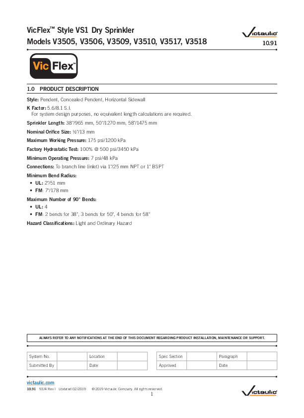 29.01: Victaulic Terms and Conditions of Sale I-VICFLEX.VS1: Victaulic® VicFlexTM Style VS1 Dry Sprinkler Installation Instructions
